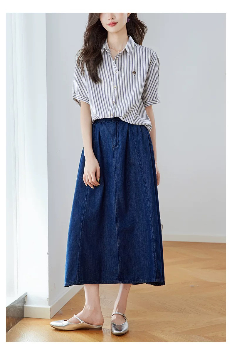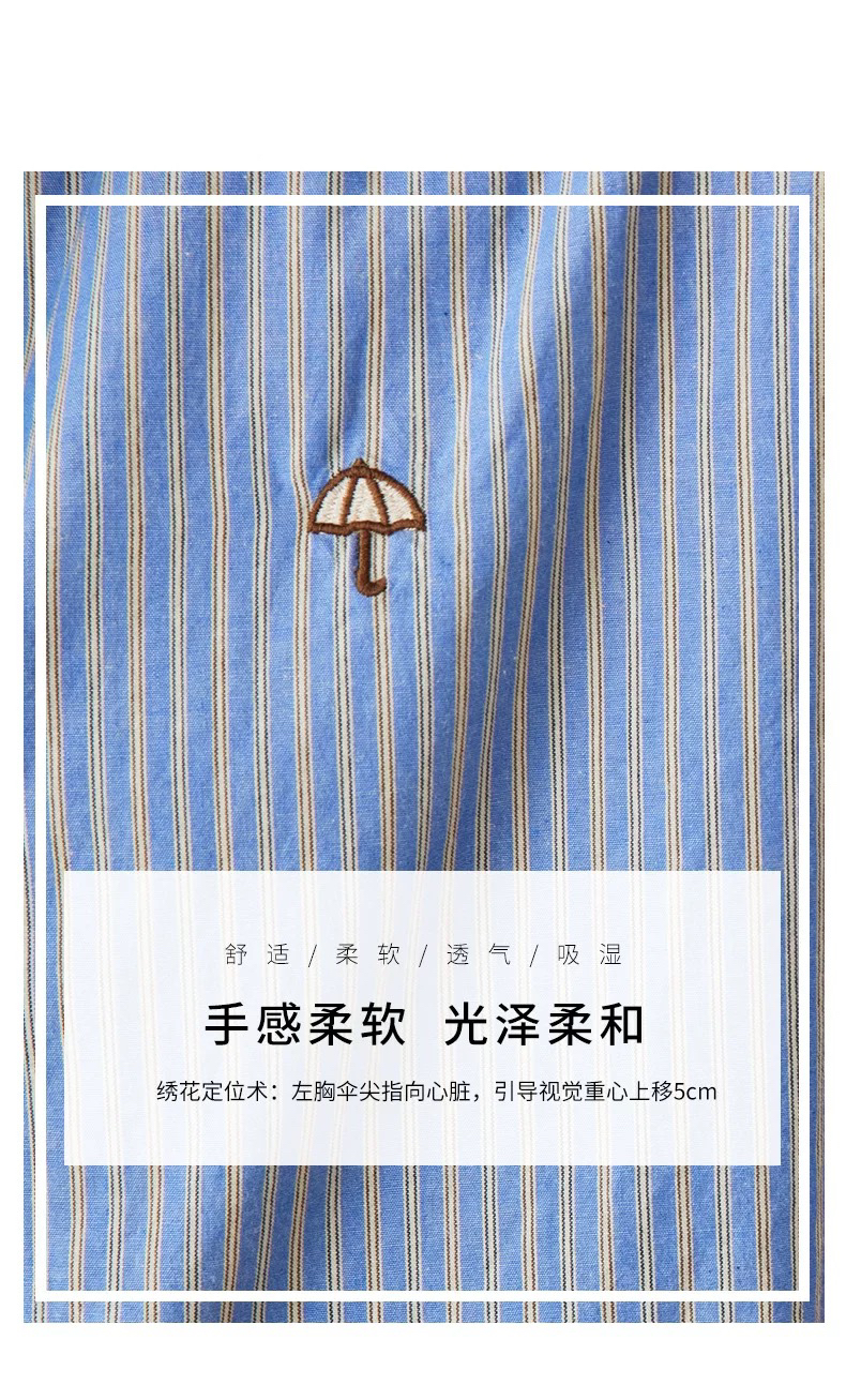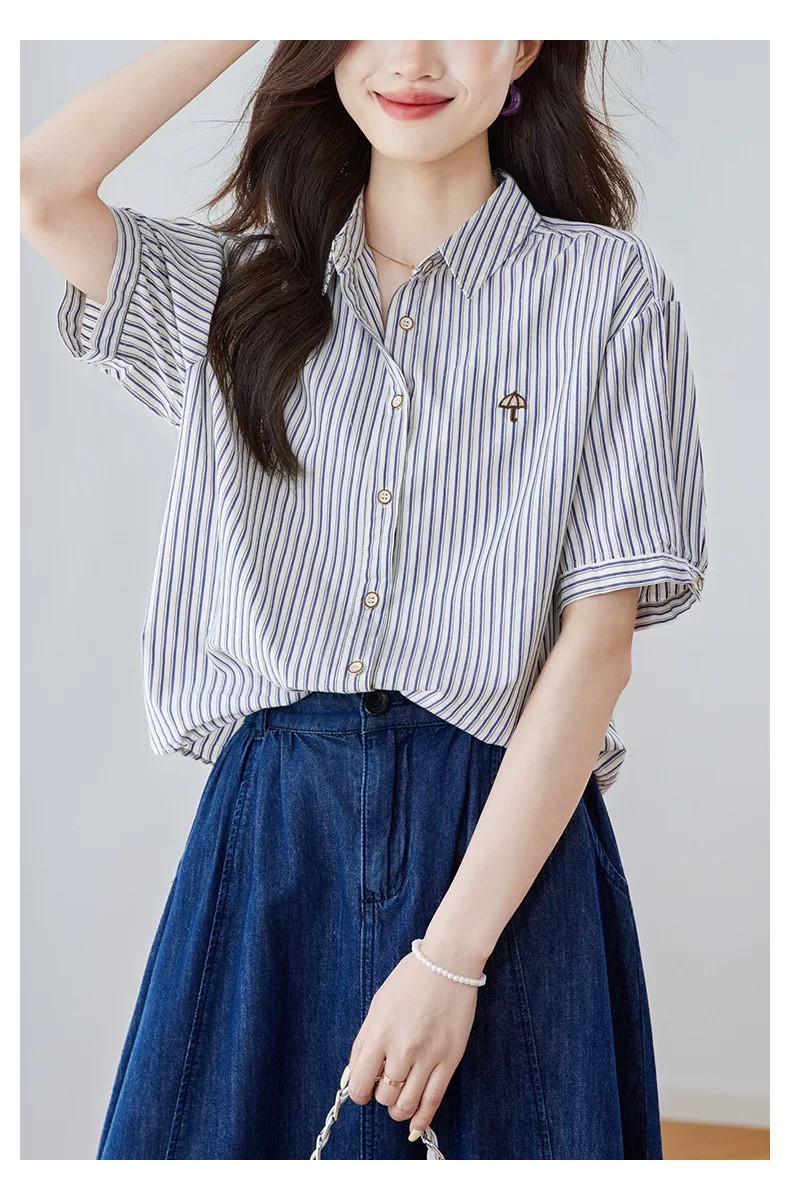 파란색 스트라이프 여성 셔츠 5 점 소매 2026 여름 새로운 문예 레트로 맨위 순면 반팔 자수 셔츠