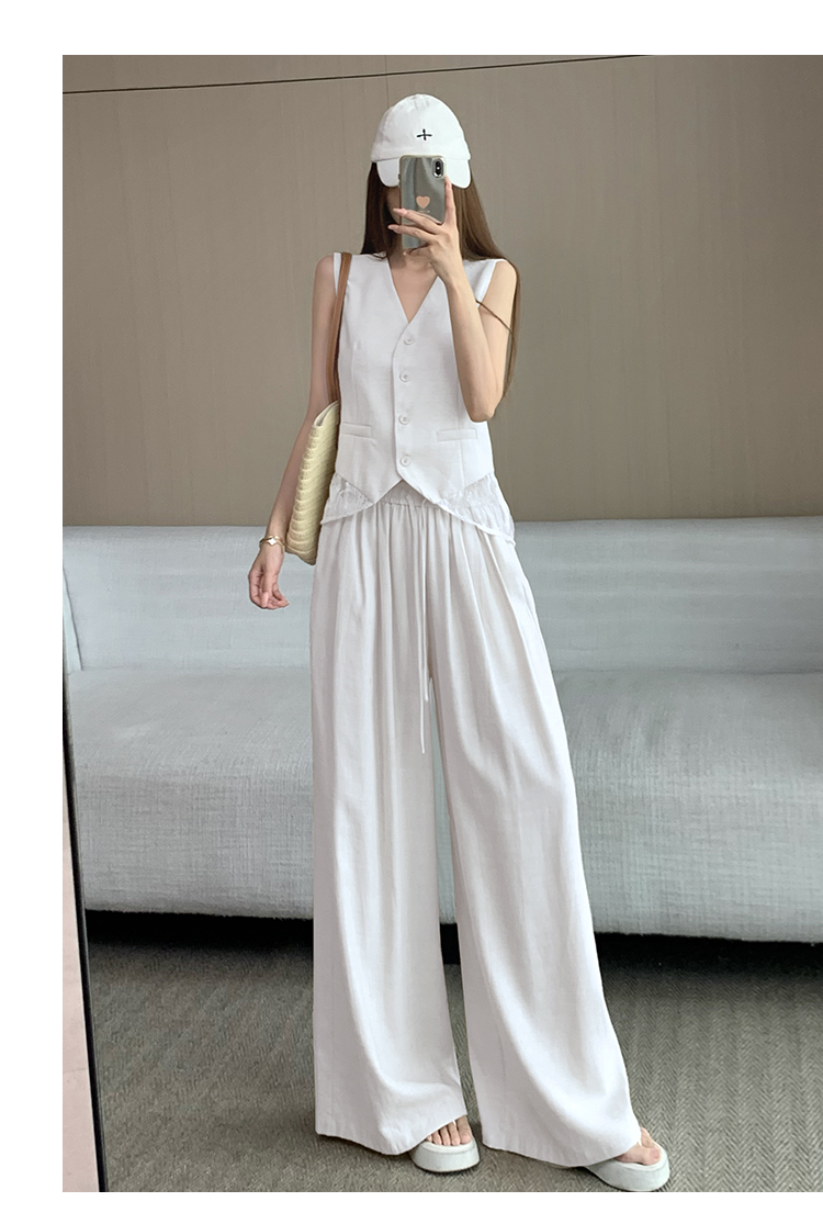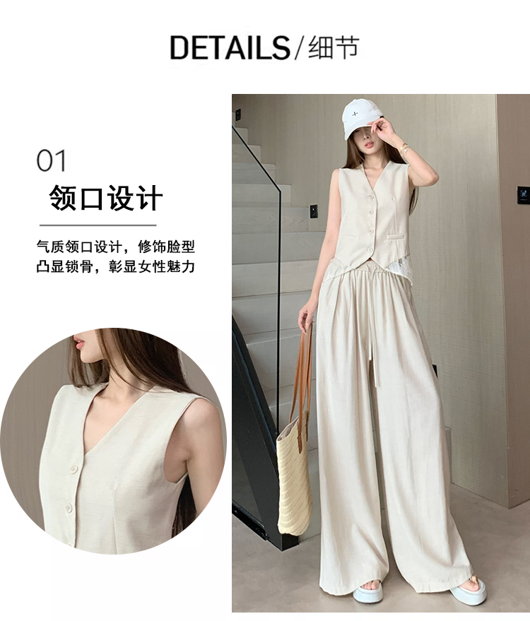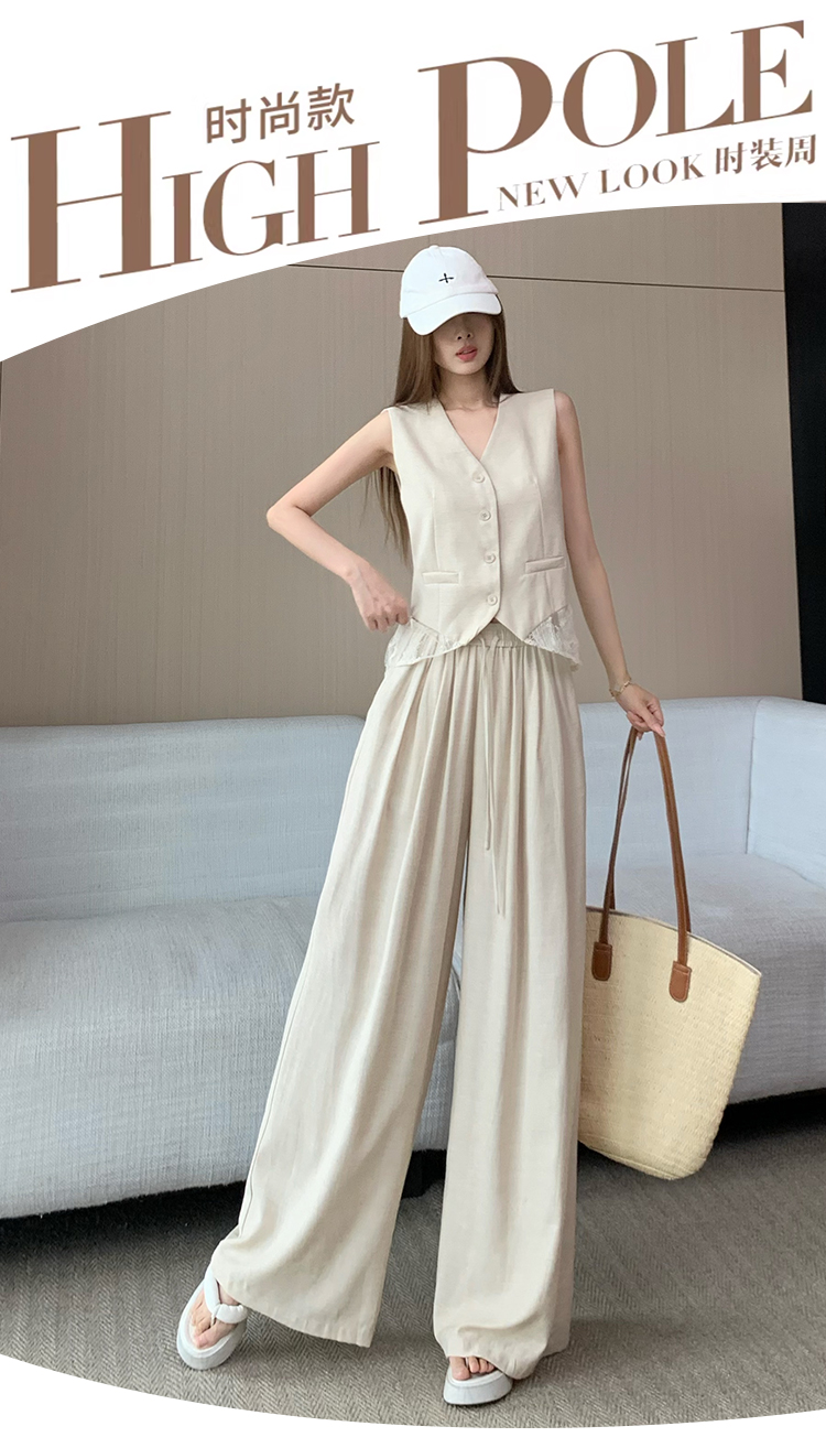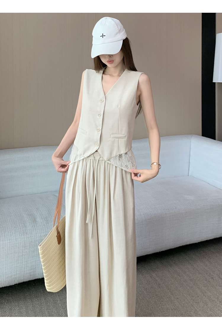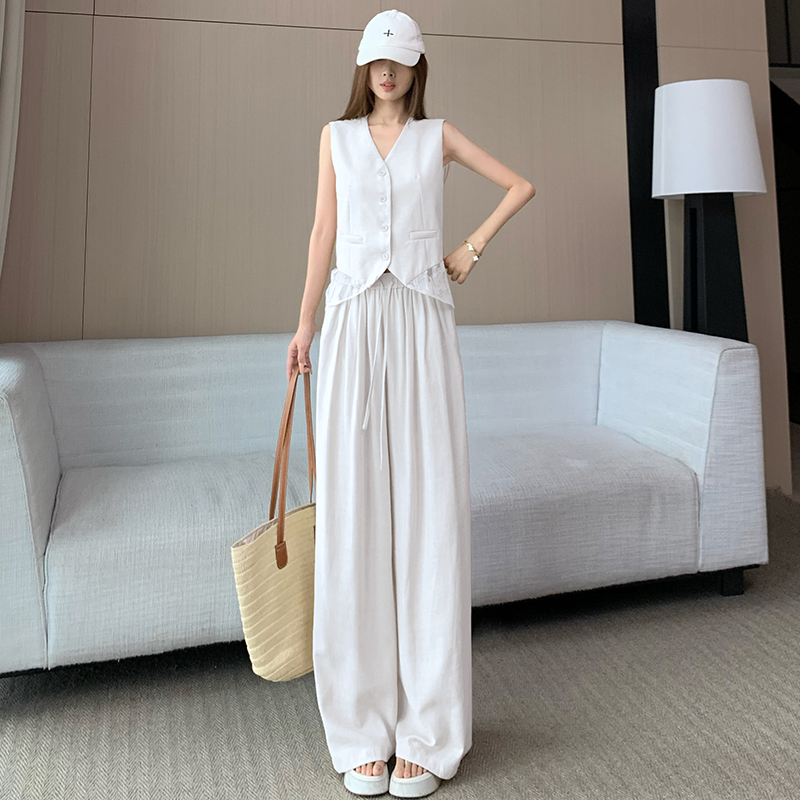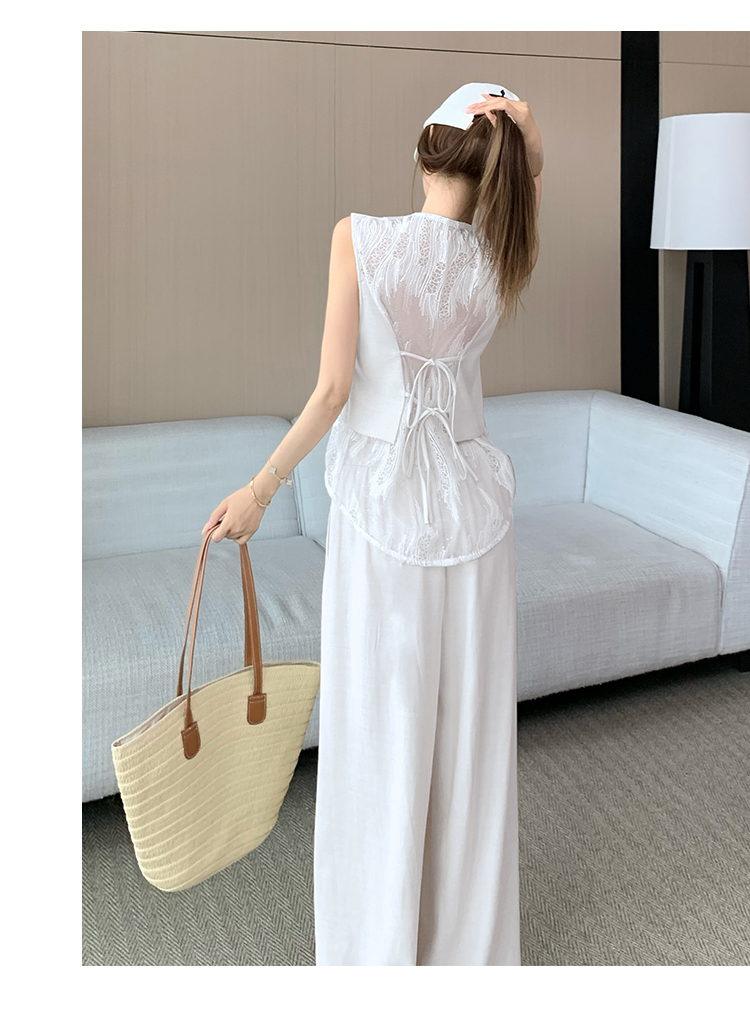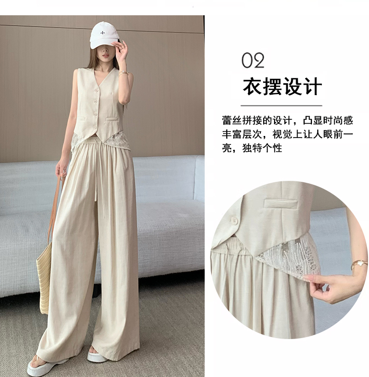 디자인 센스 레이스 조각 작은 샤넬 스타일 조끼 베스트 와이드 레그 팬츠 두 조각 여성 세트 봄 여름 새로운 패션 세트