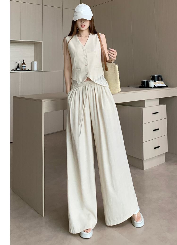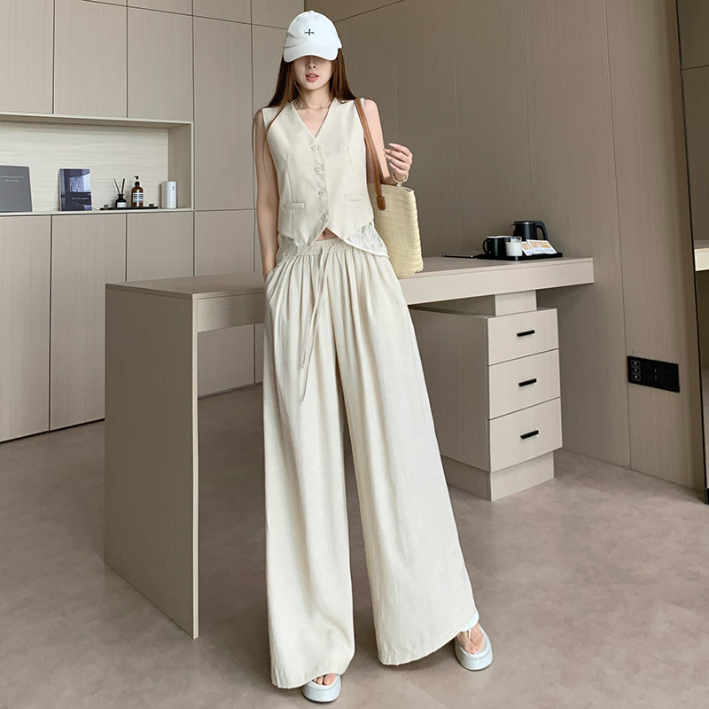 디자인 센스 레이스 조각 아세트산 새틴 와이드 레깅스 바지 여름 얇은 스타일 하이웨이스트 슬림해 보이는 도루 센스 캐주얼 스트레이트 팬츠