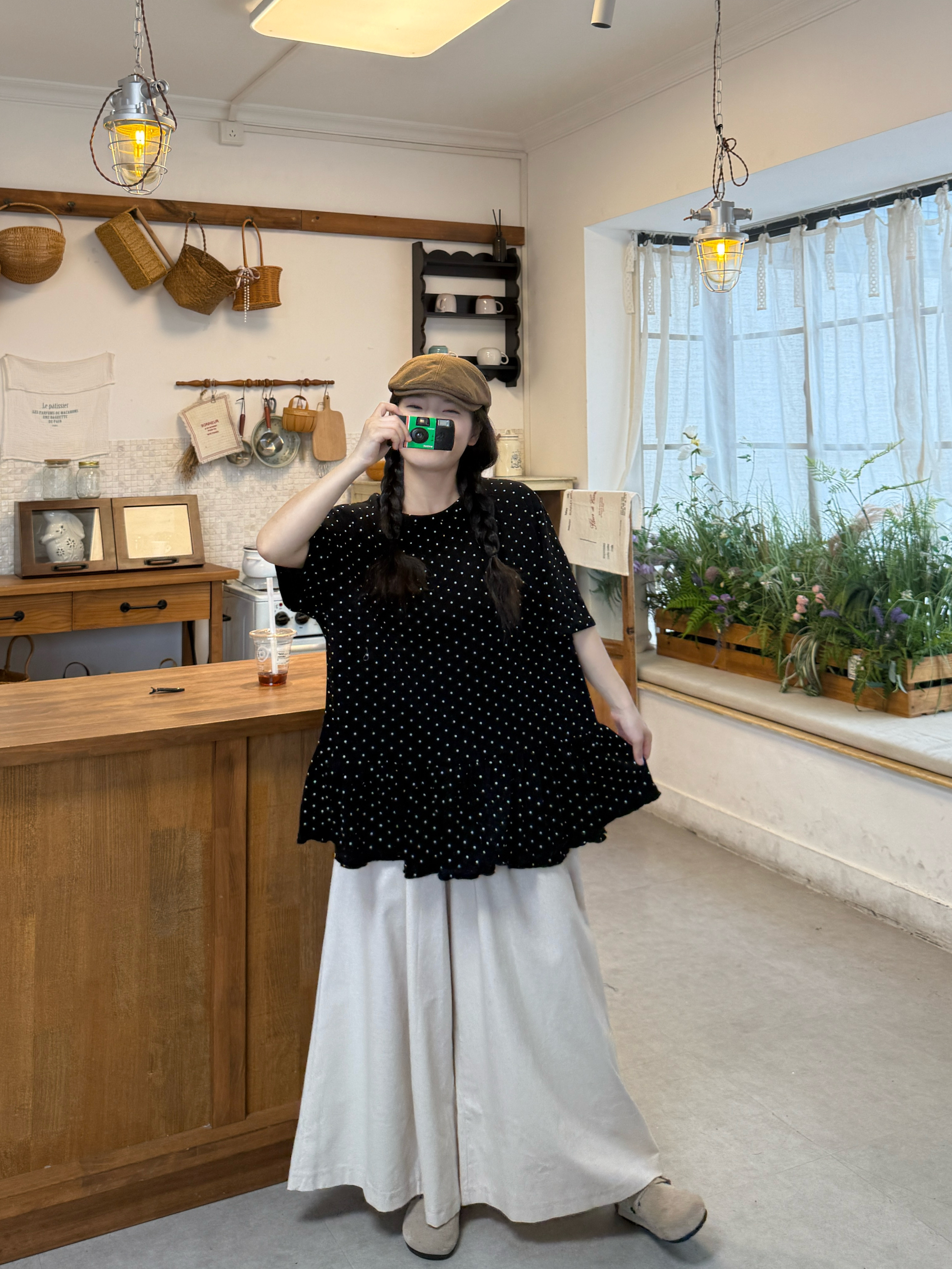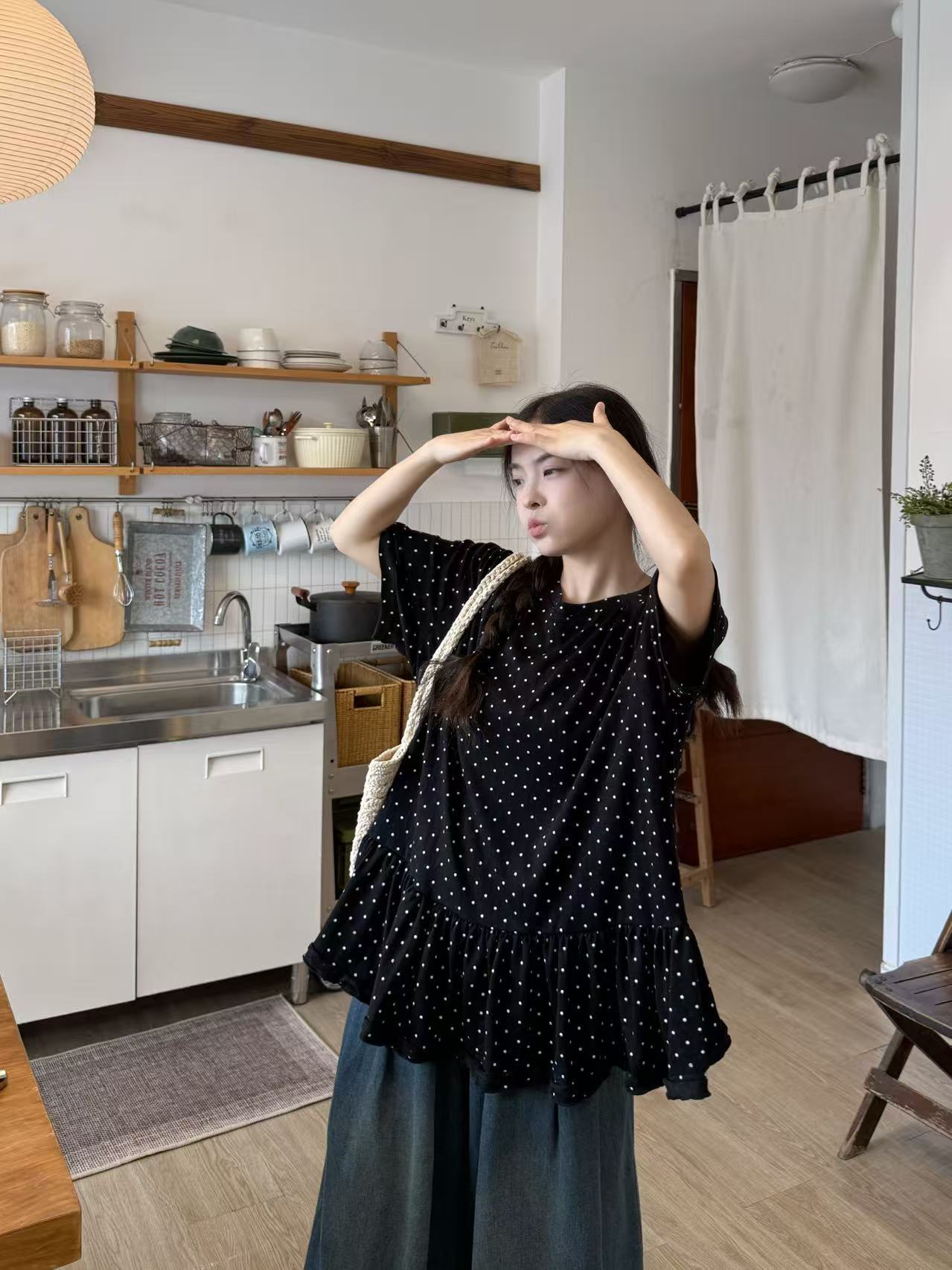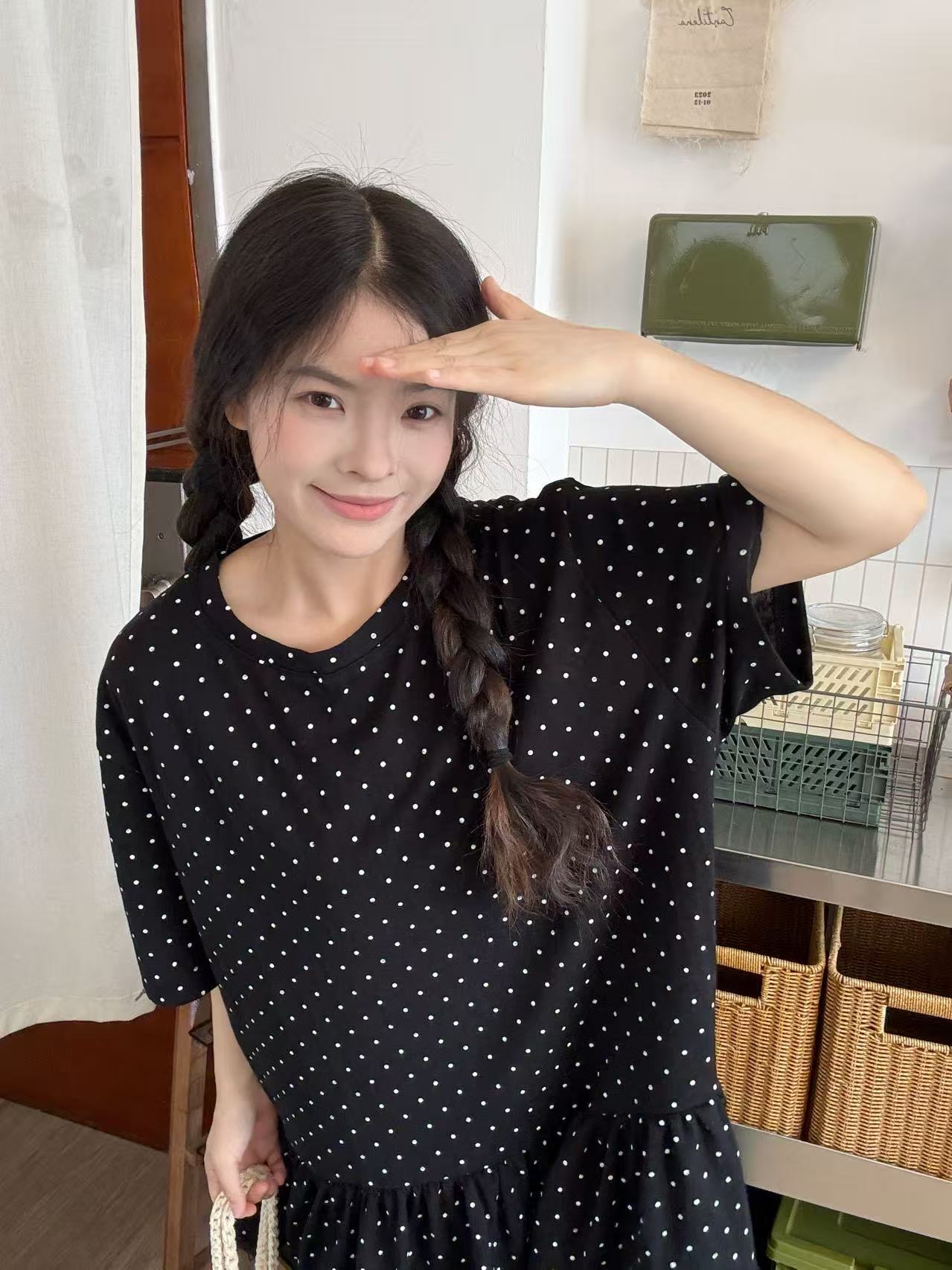 실사 선물 물품 다용도 루즈핏 도트 무늬 니트 반팔 티셔츠