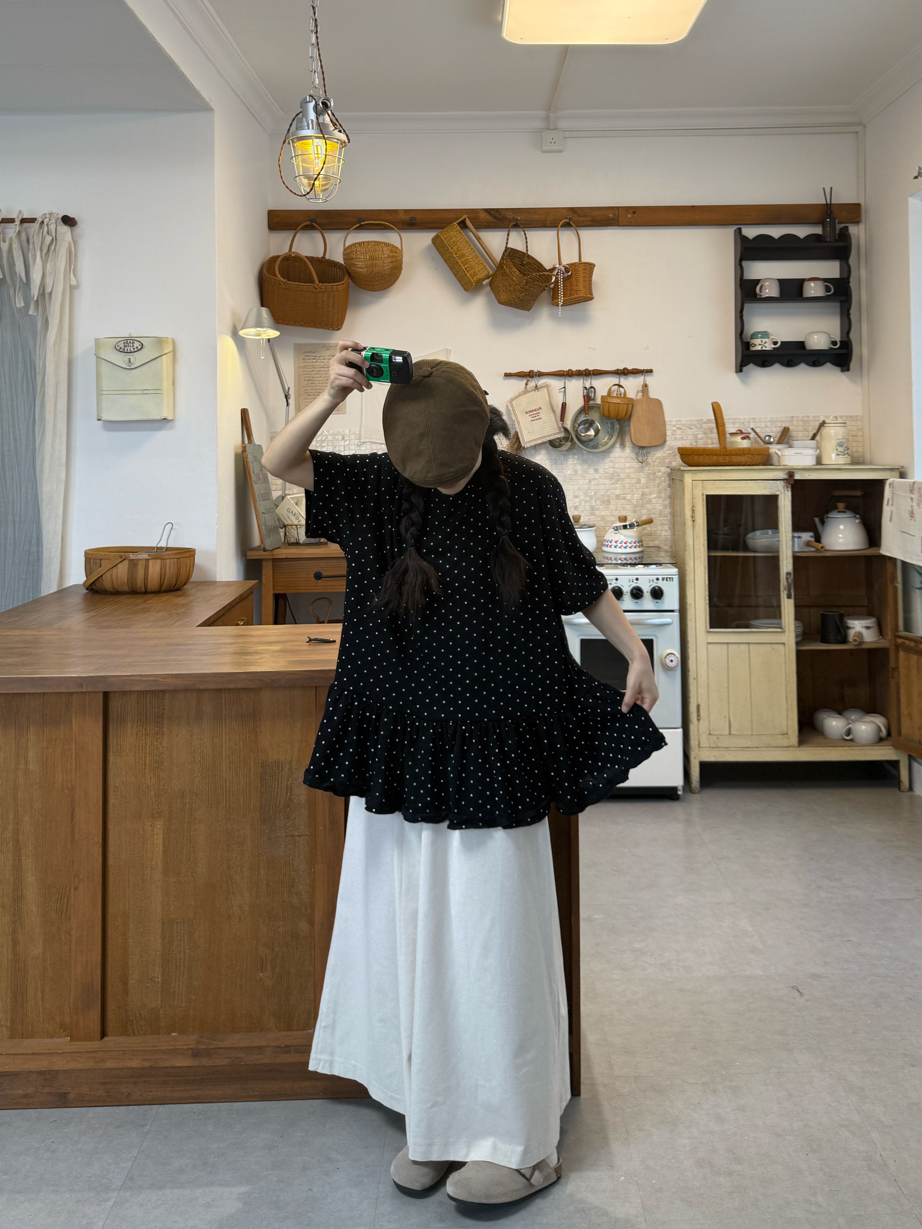 실사 반팔 티셔츠 스택 착용 자수 블라우스 반신 스커트