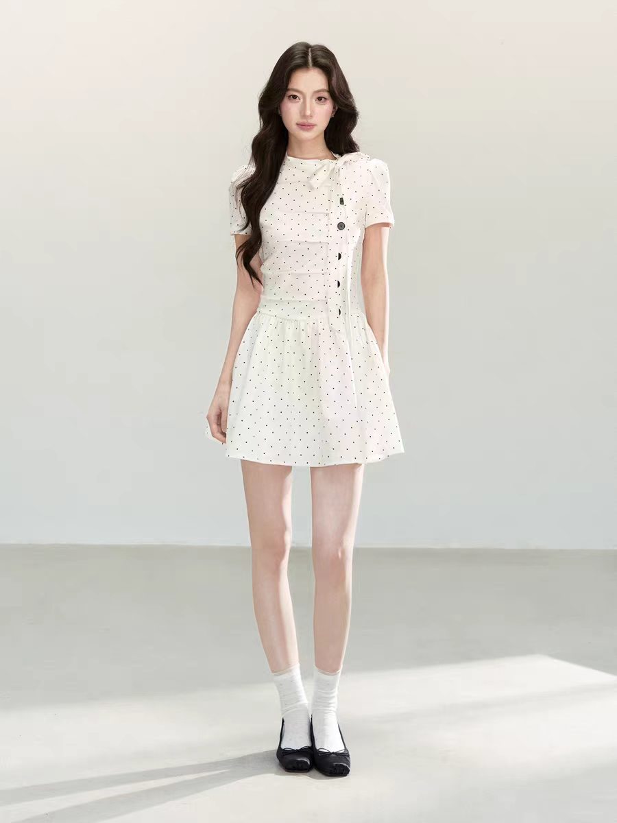 한 부서 디자인 센스 화이트 도트 무늬 드레스 여름 새로운 주름 디자인 센스 학원 스타일 소녀 치마
