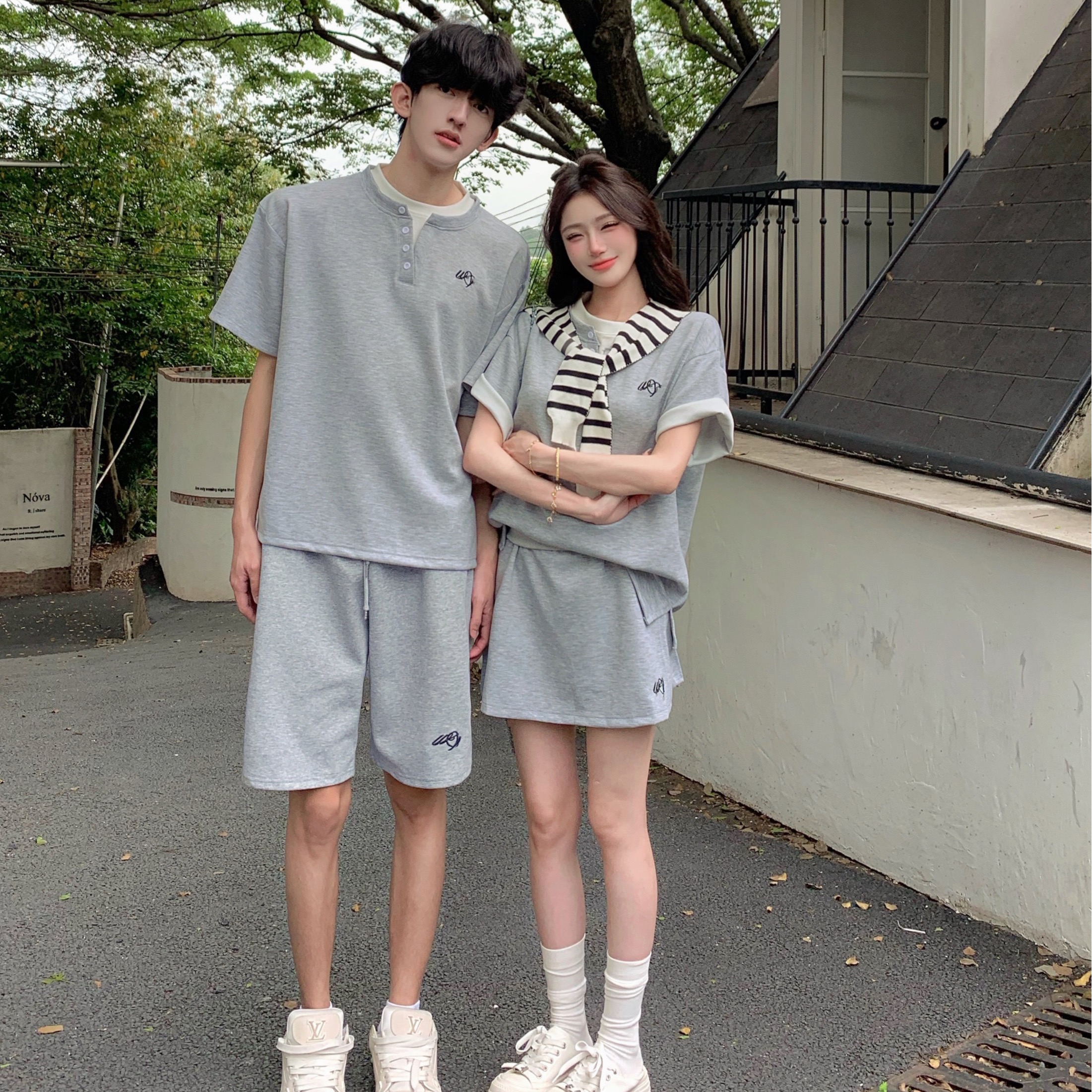 실사 캐주얼 운동복 세트 여성 여름 학생 한국 스타일 패션 반팔 미니 스커트 투피스 세트 커플룩