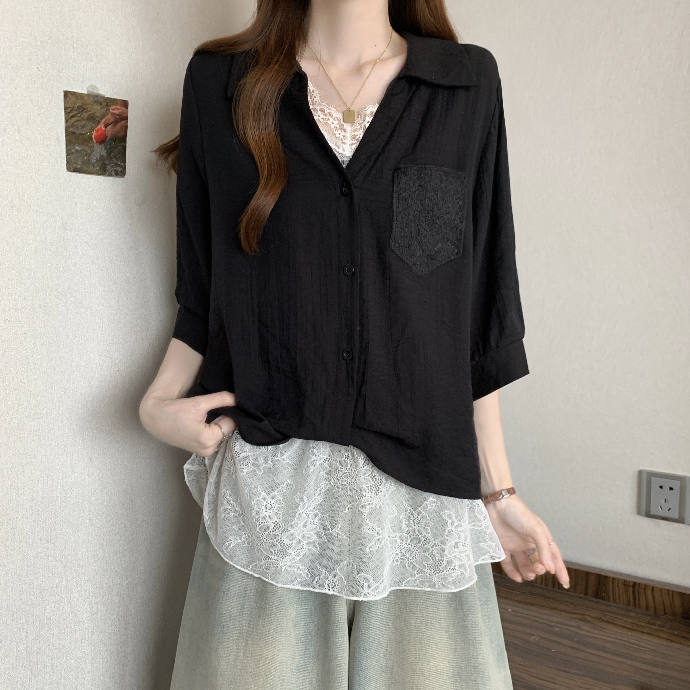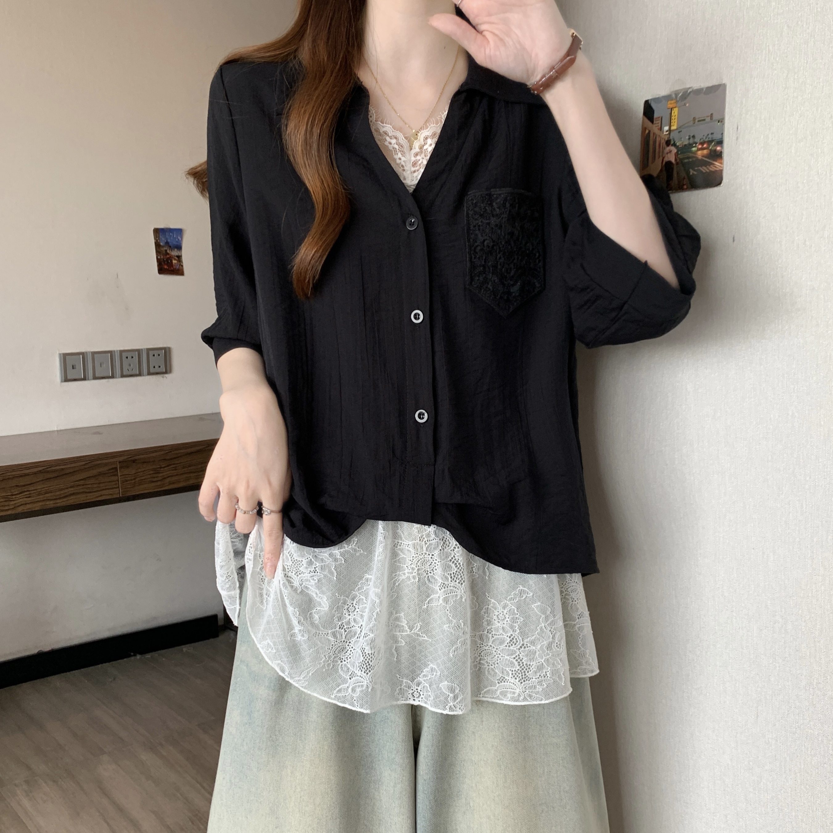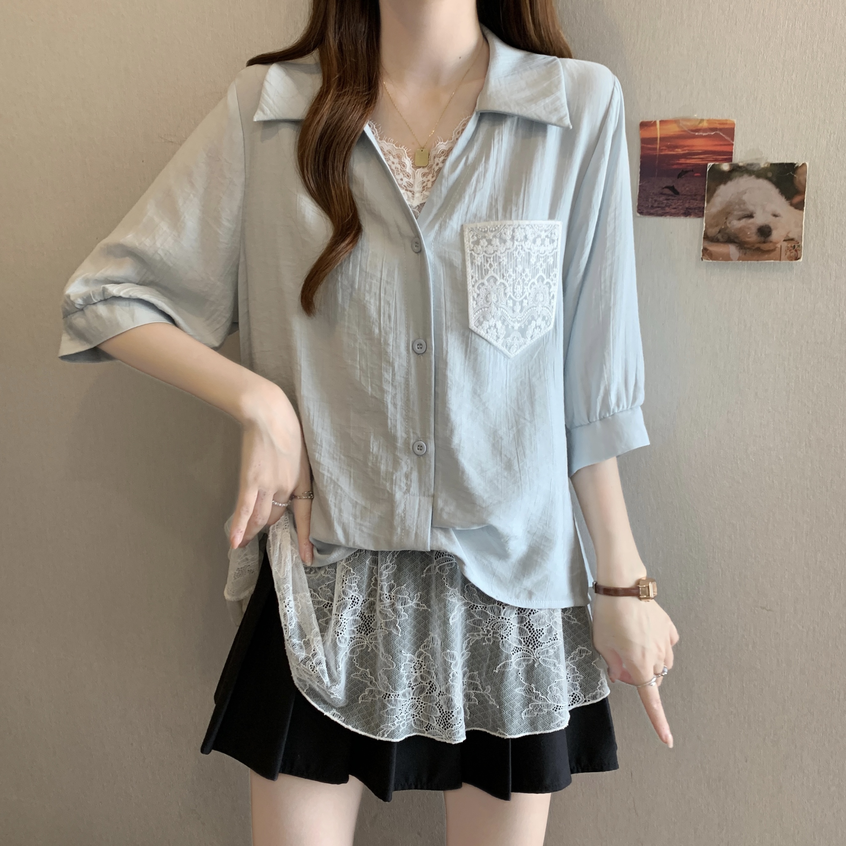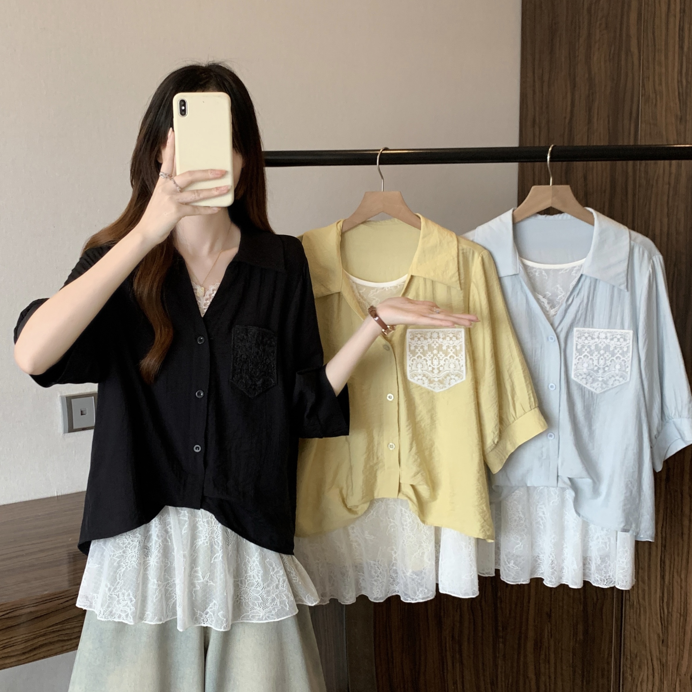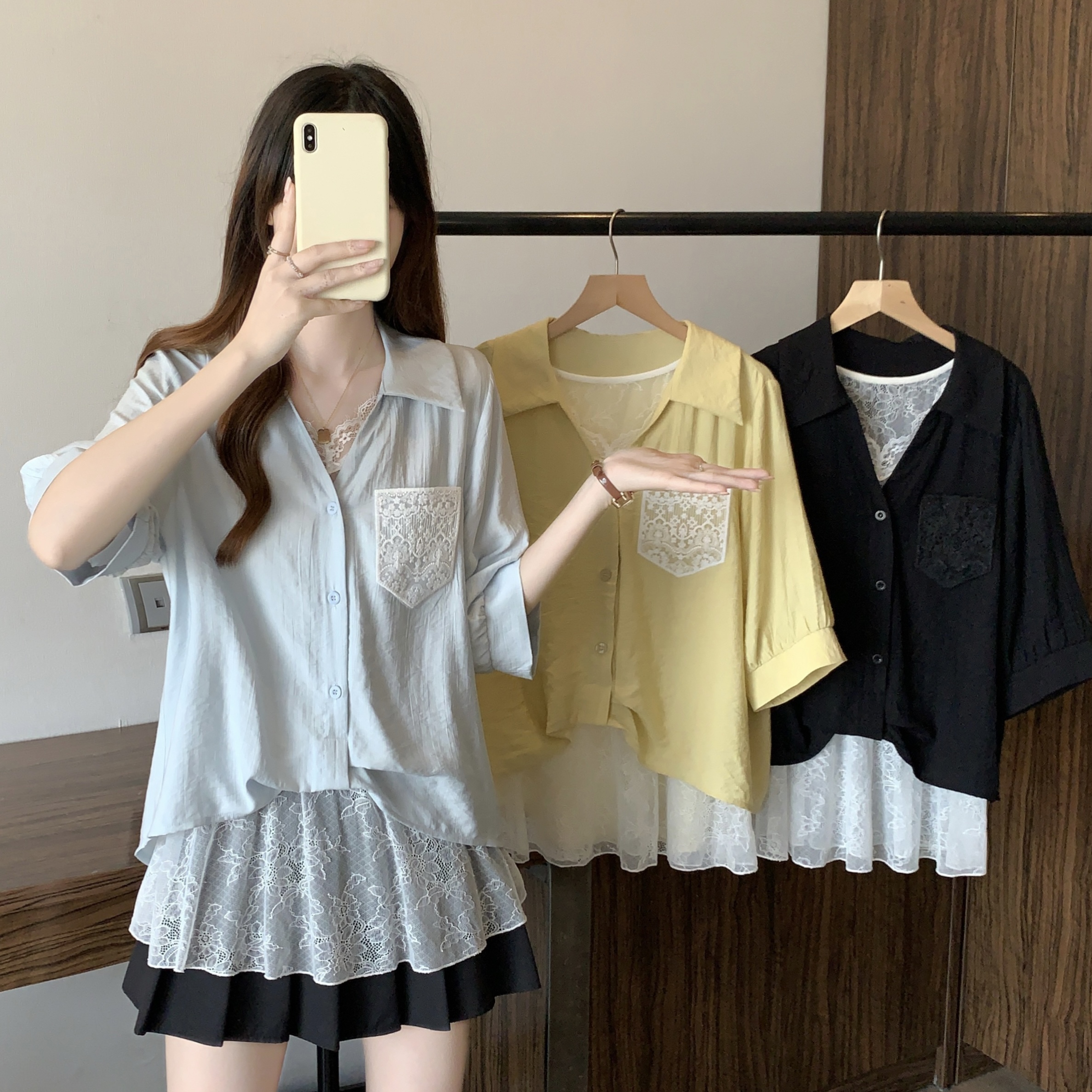실사 빅 사이즈 2026 여름 지방 mm 빅 사이즈 패치워크 페이크 레이어드 레이스 반팔 셔츠 디자인 센스 슬림해 보이는 맨위