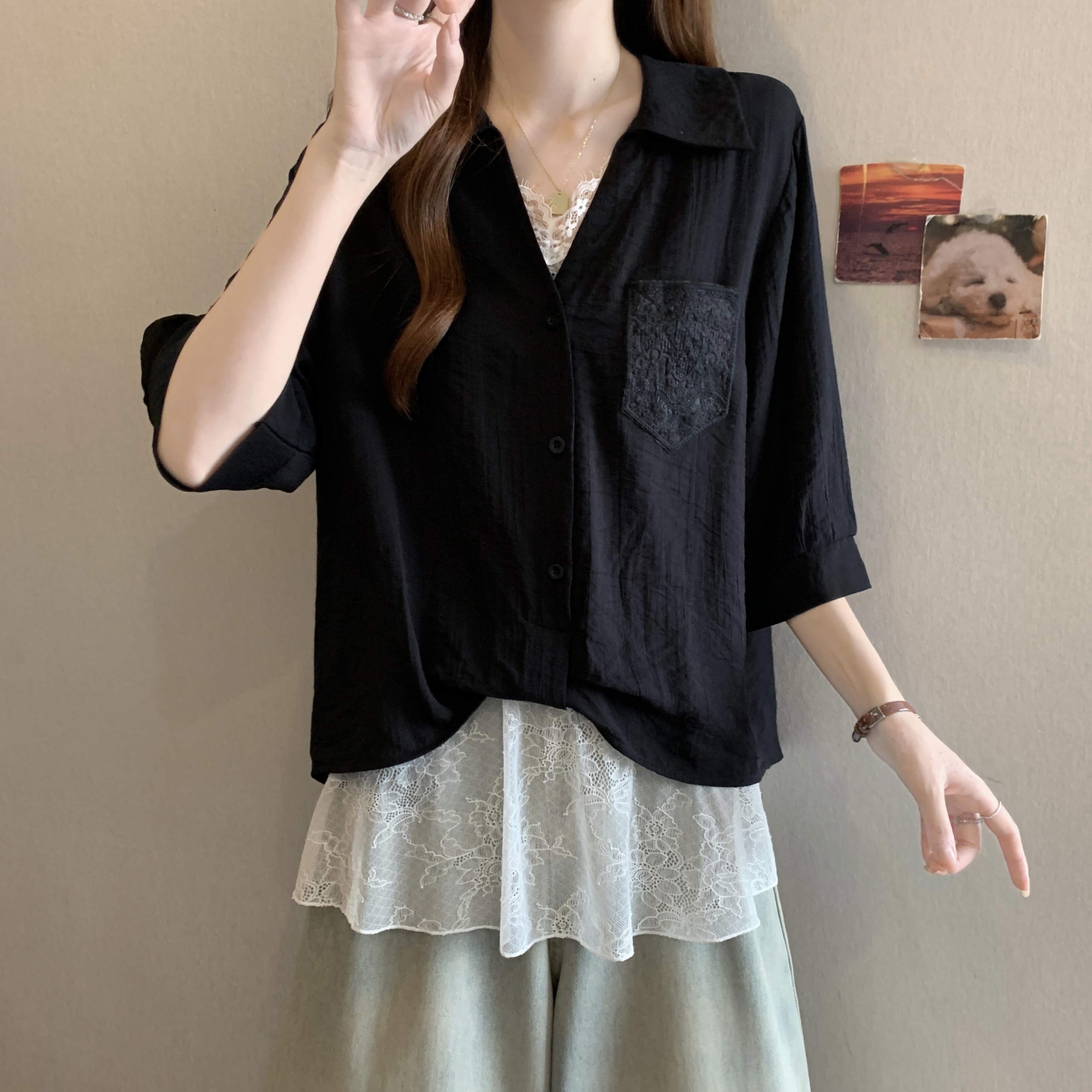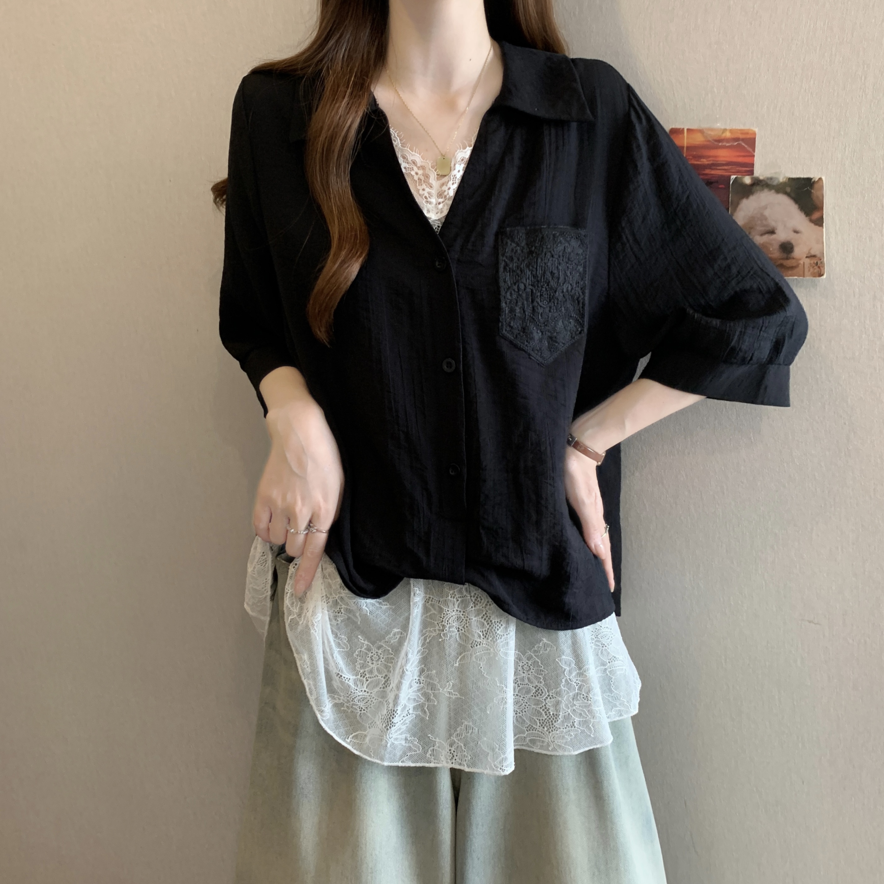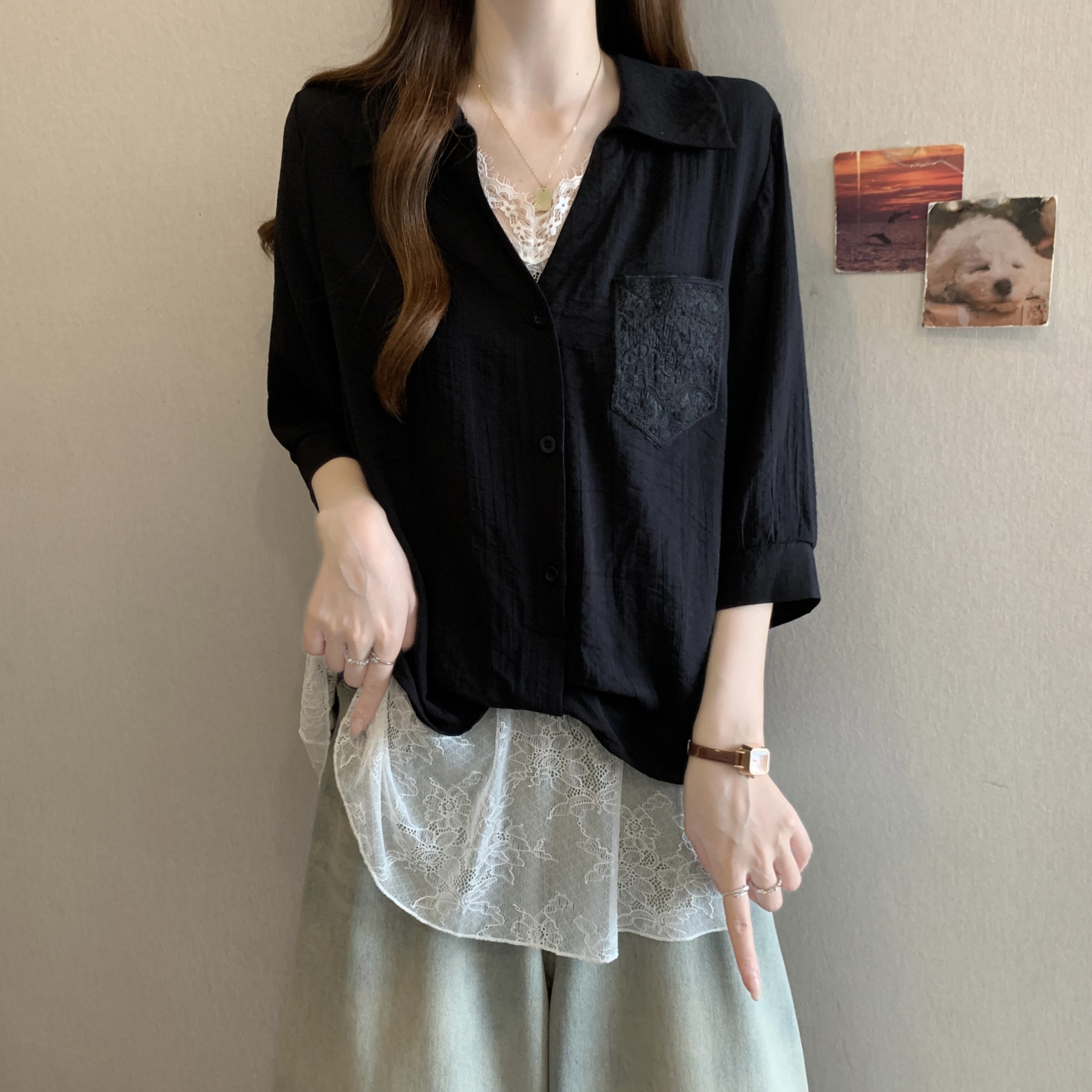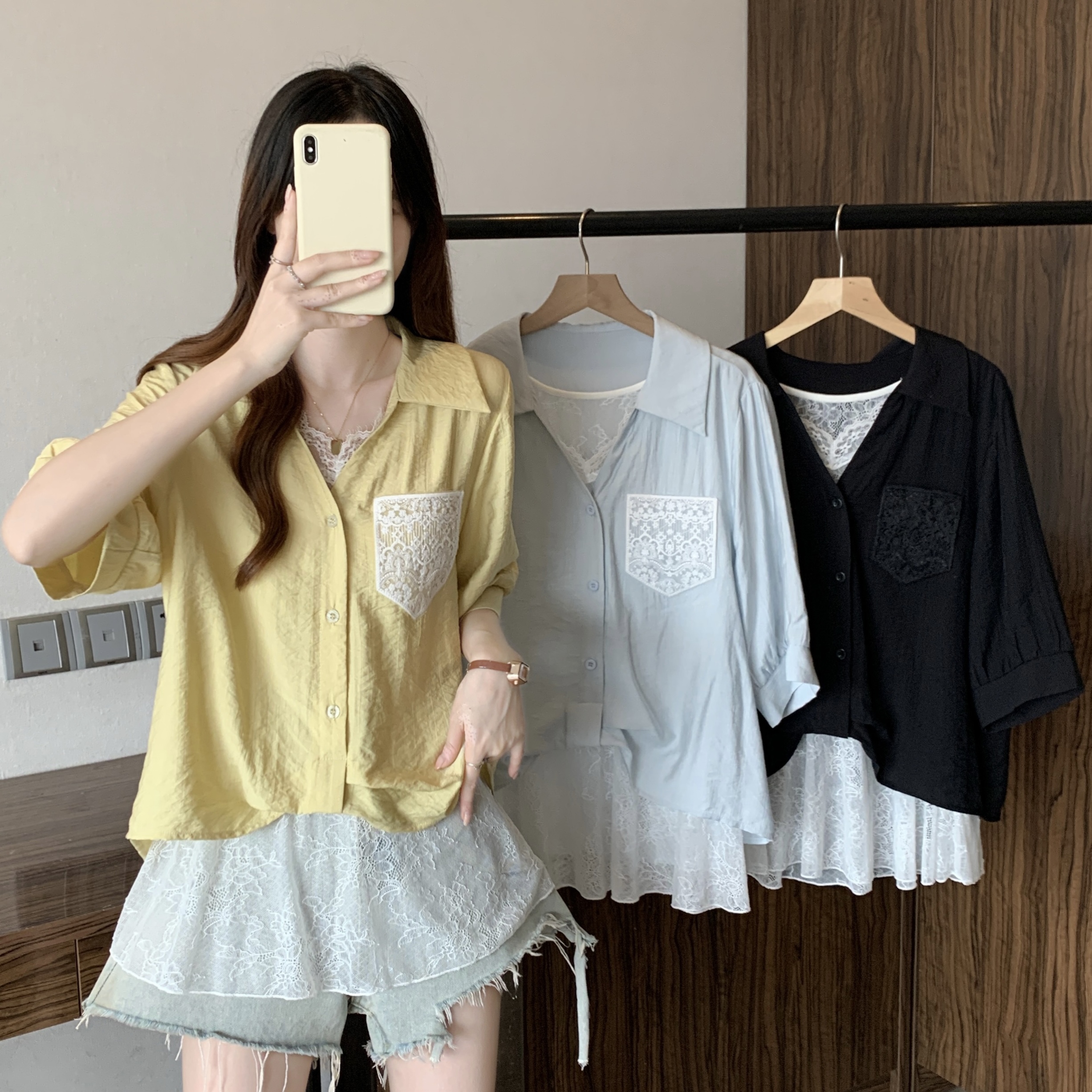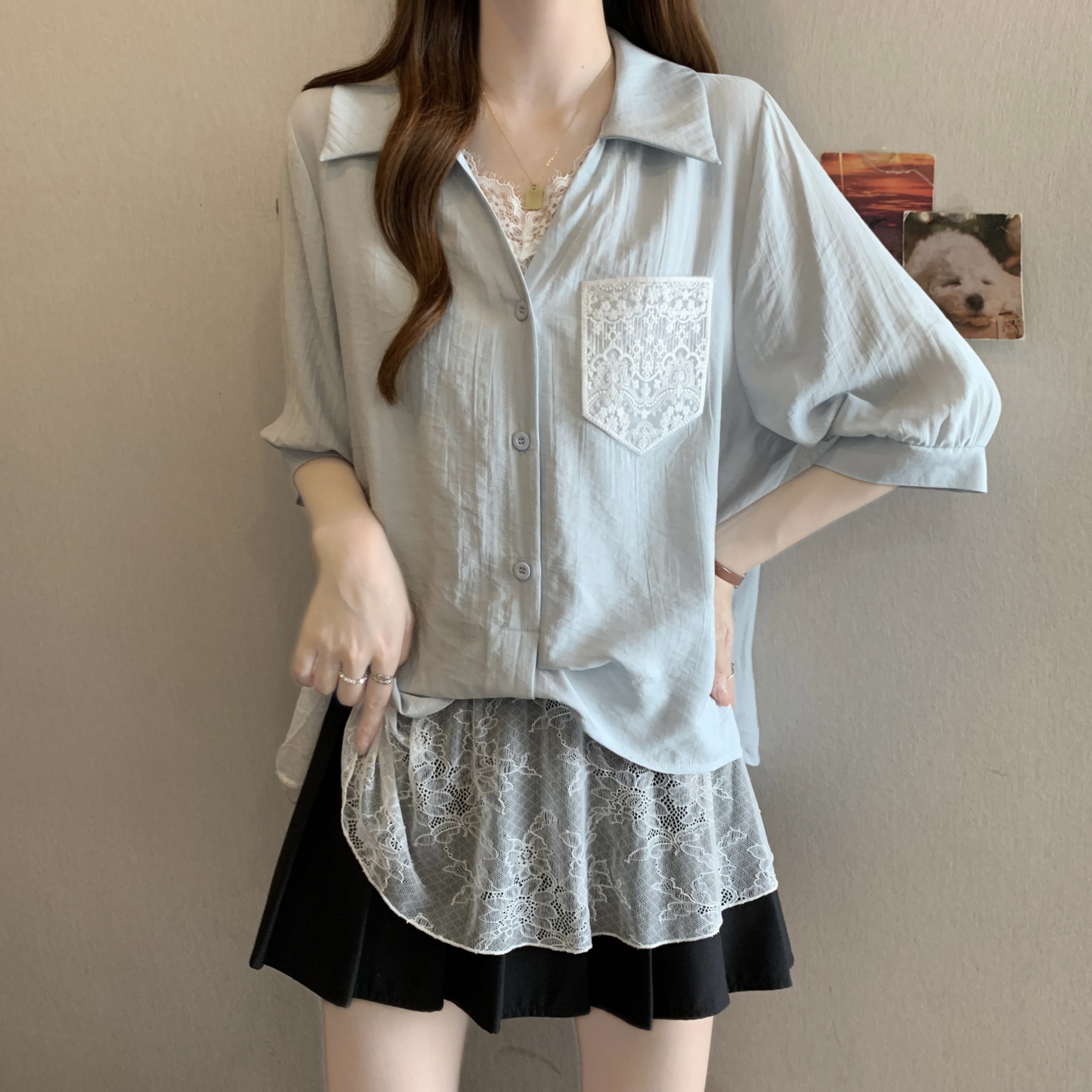 실사 빅 사이즈 2026 여름 지방 mm 빅 사이즈 패치워크 페이크 레이어드 레이스 반팔 셔츠 디자인 센스 슬림해 보이는 맨위