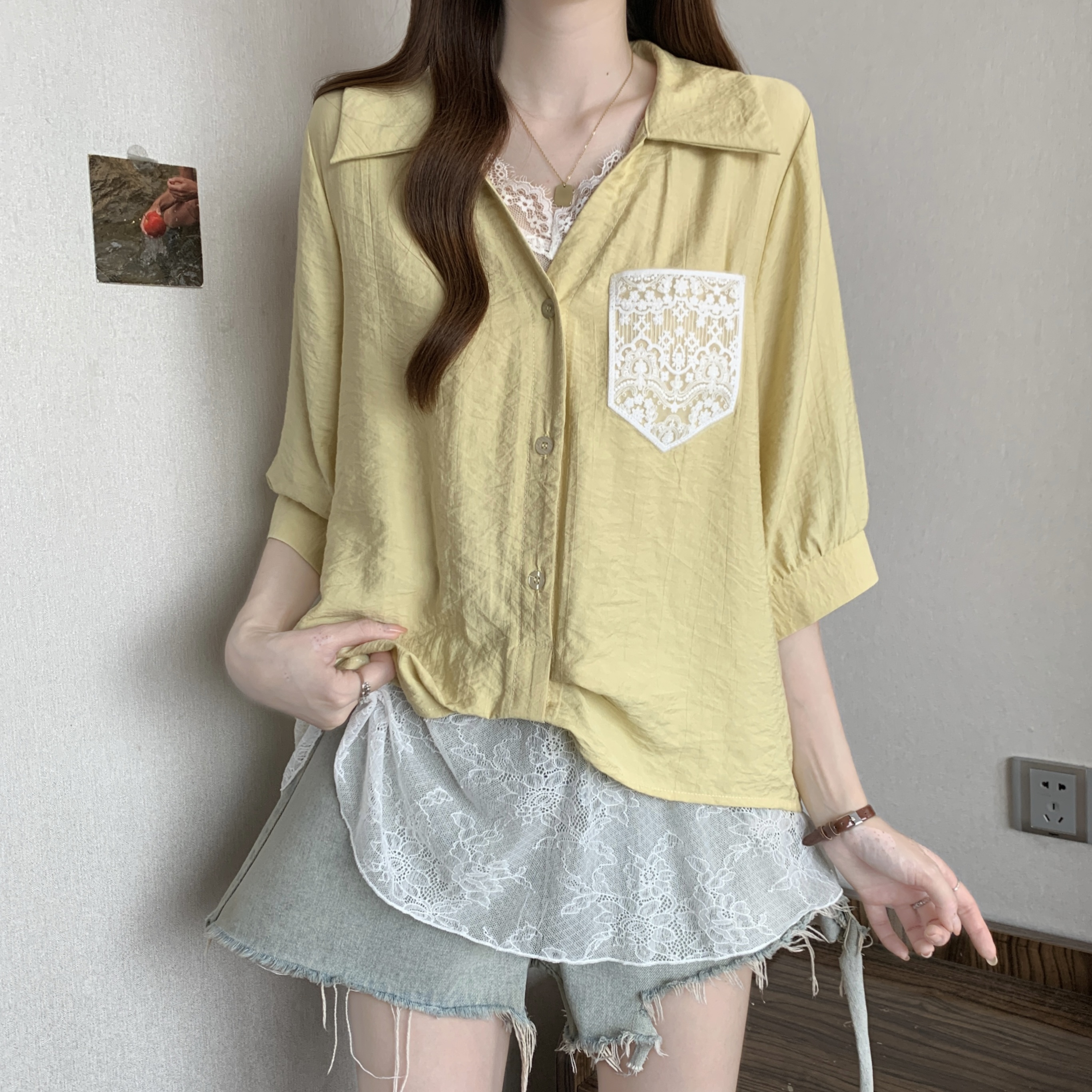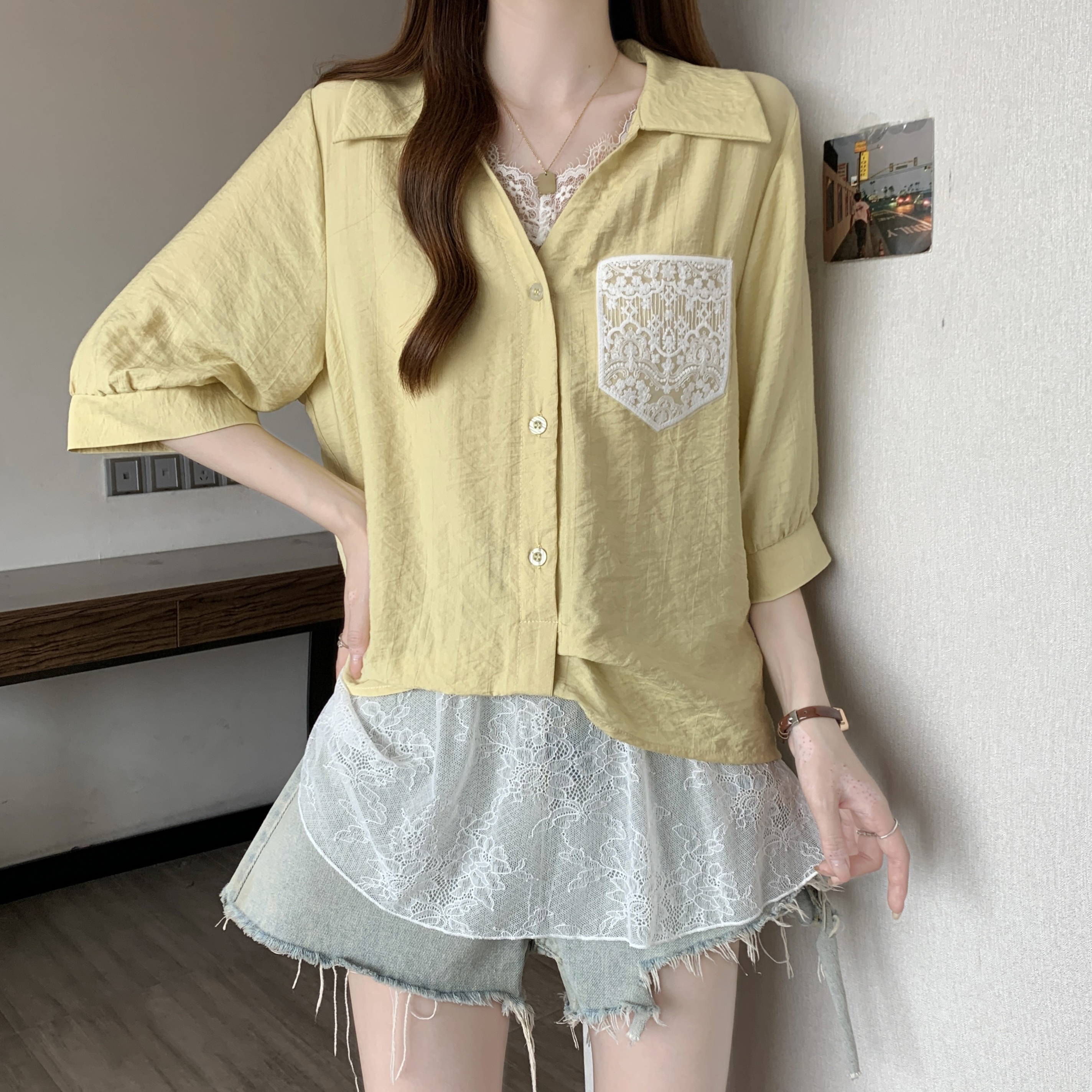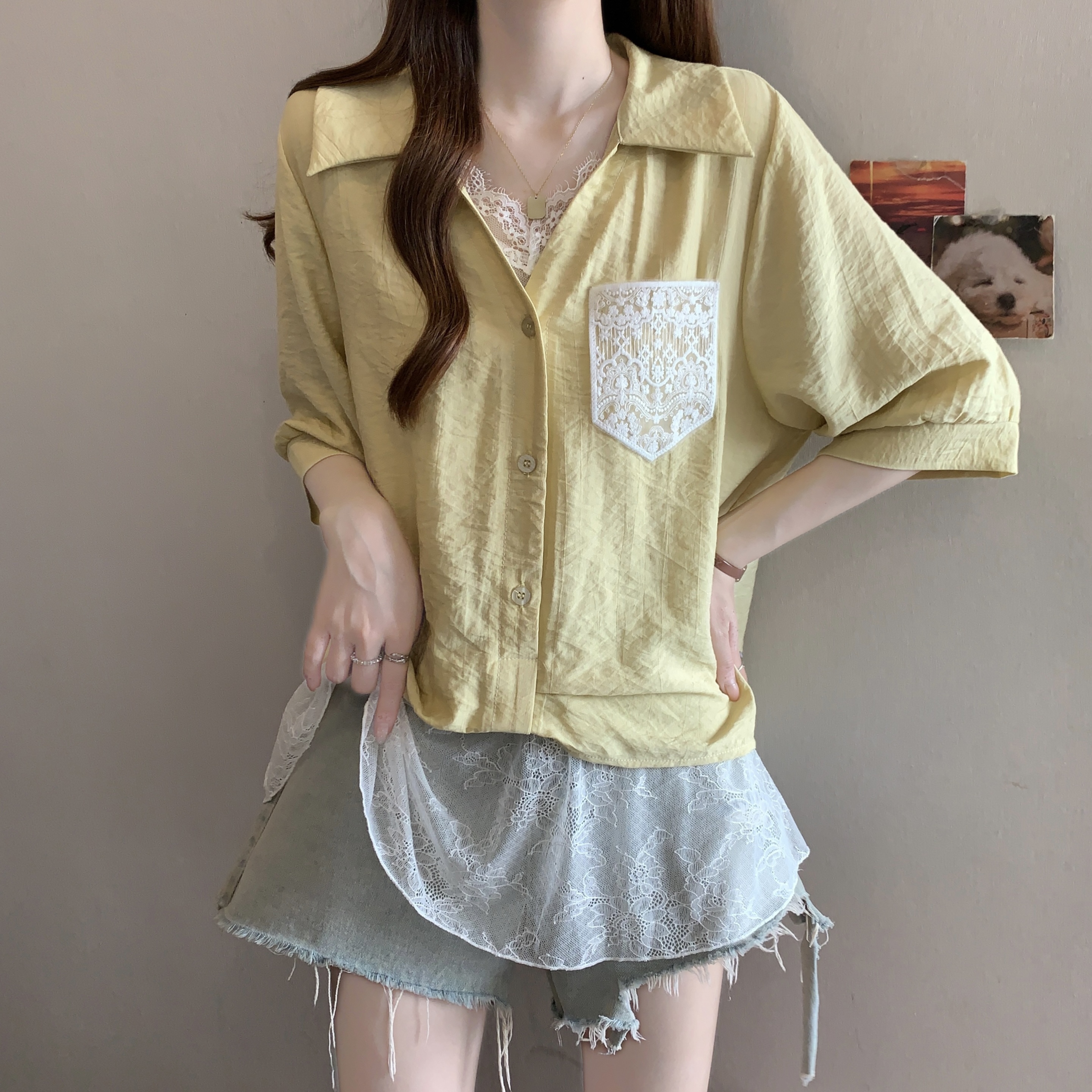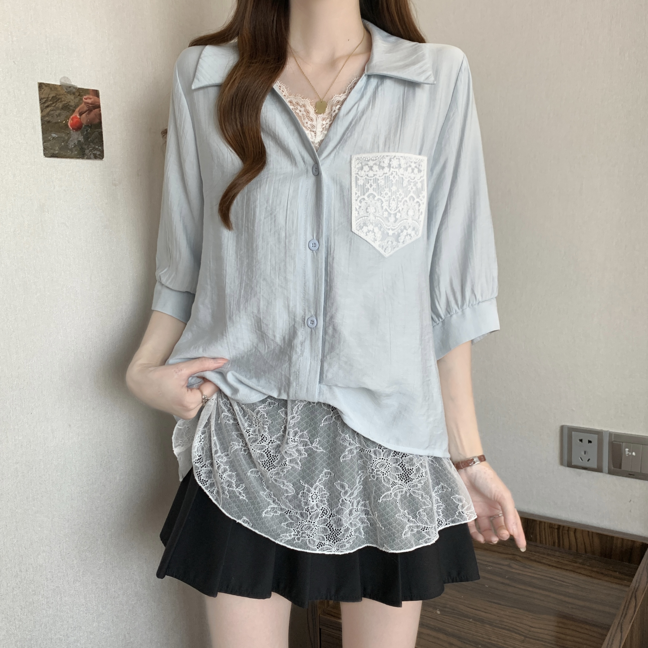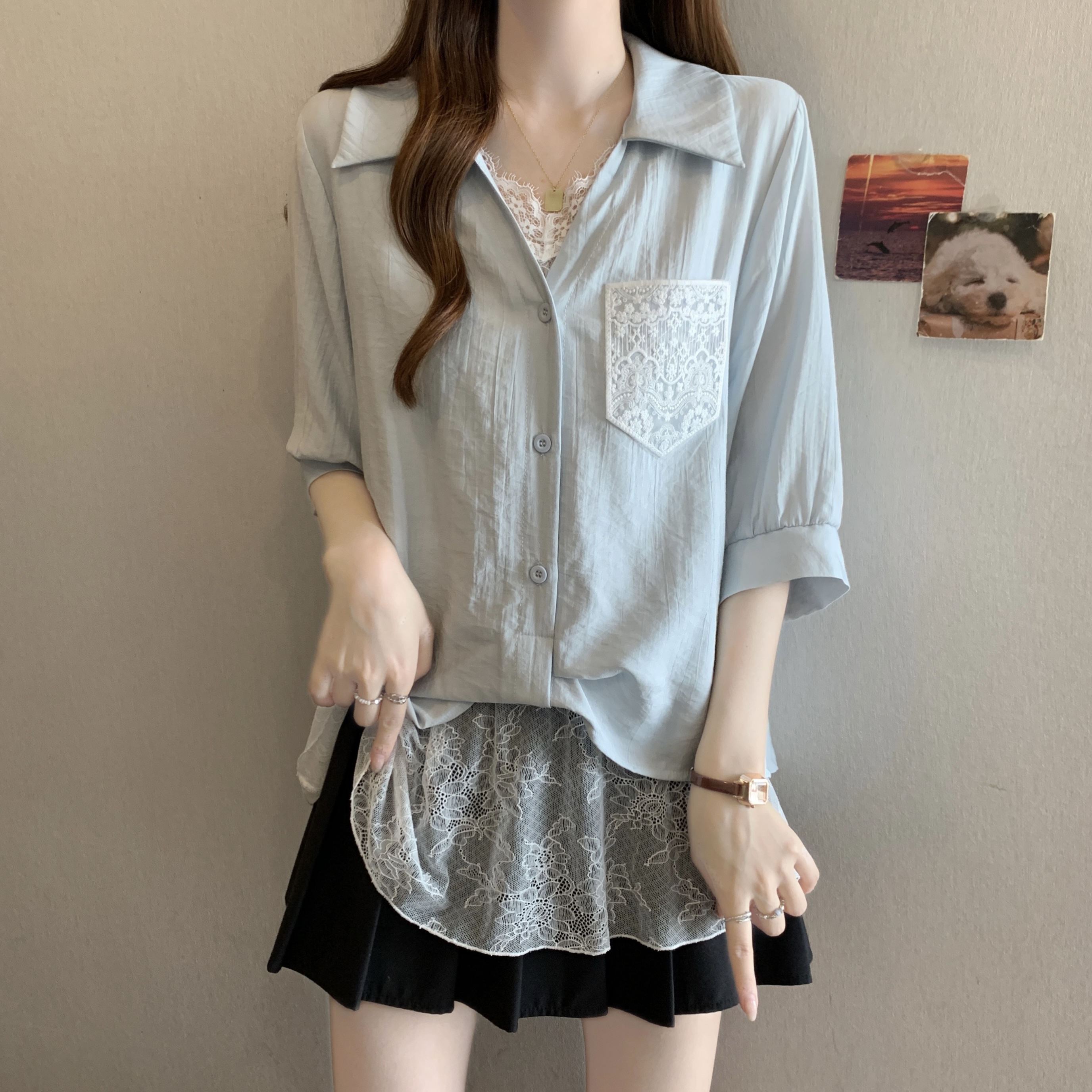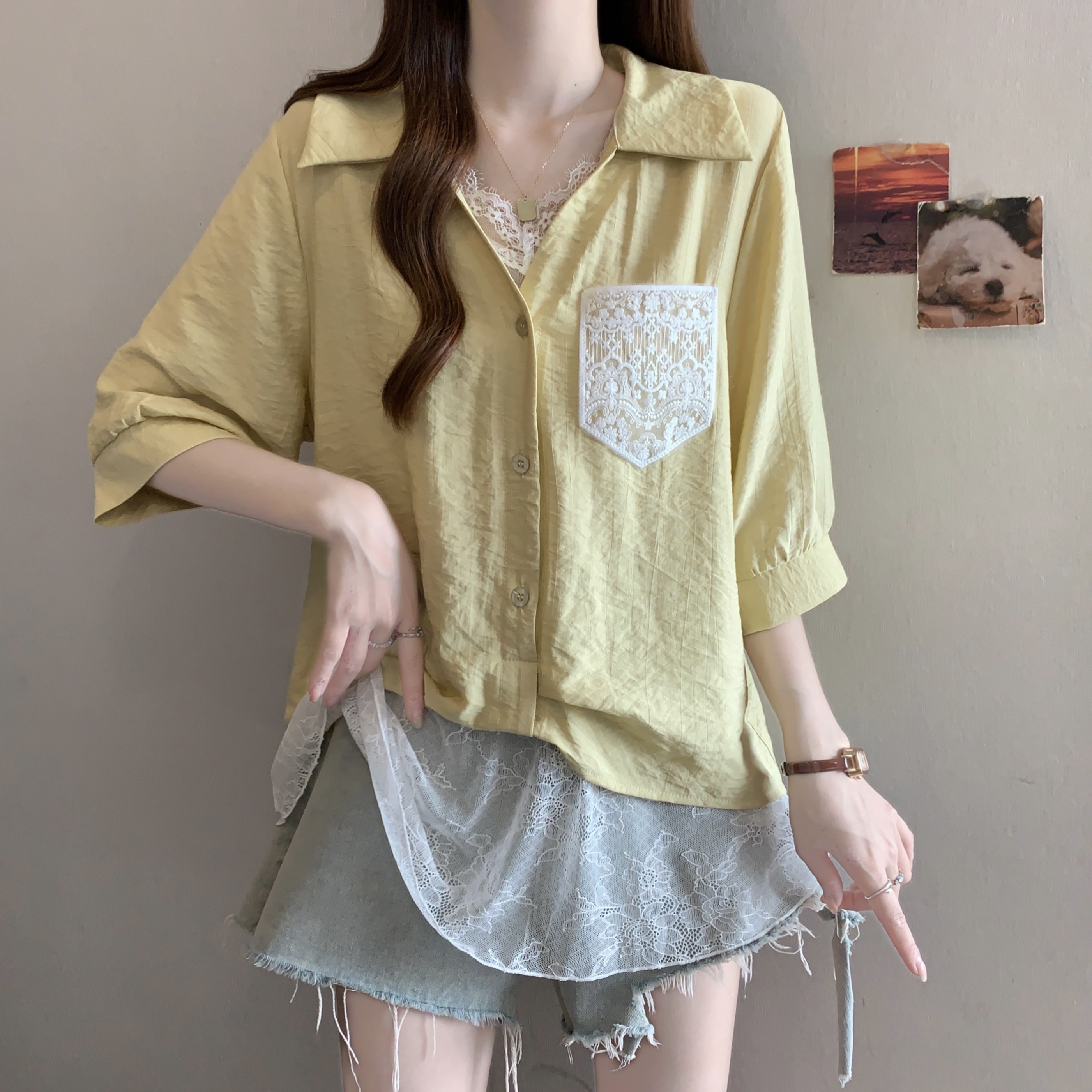 실사 빅 사이즈 2026 여름 지방 mm 빅 사이즈 패치워크 페이크 레이어드 레이스 반팔 셔츠 디자인 센스 슬림해 보이는 맨위