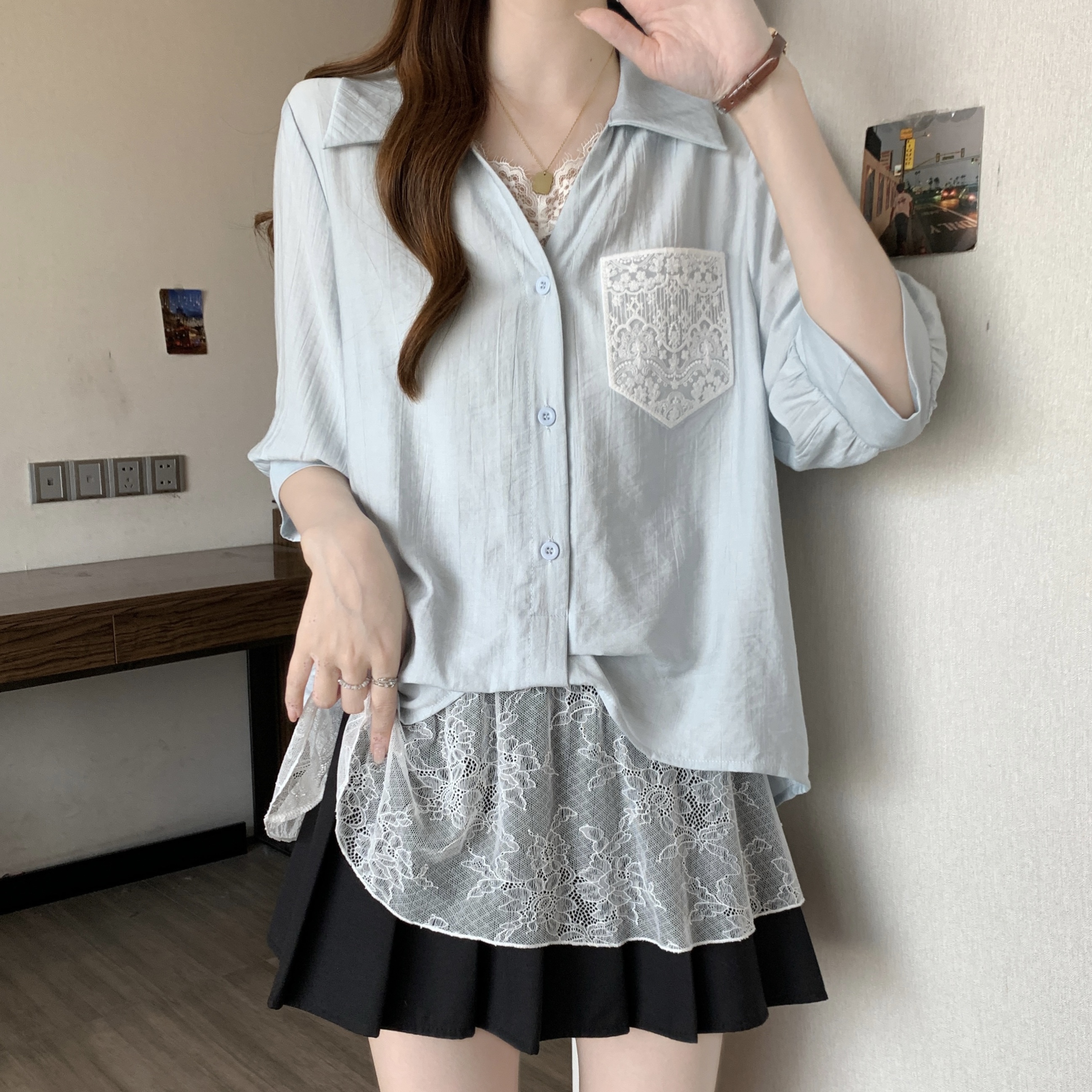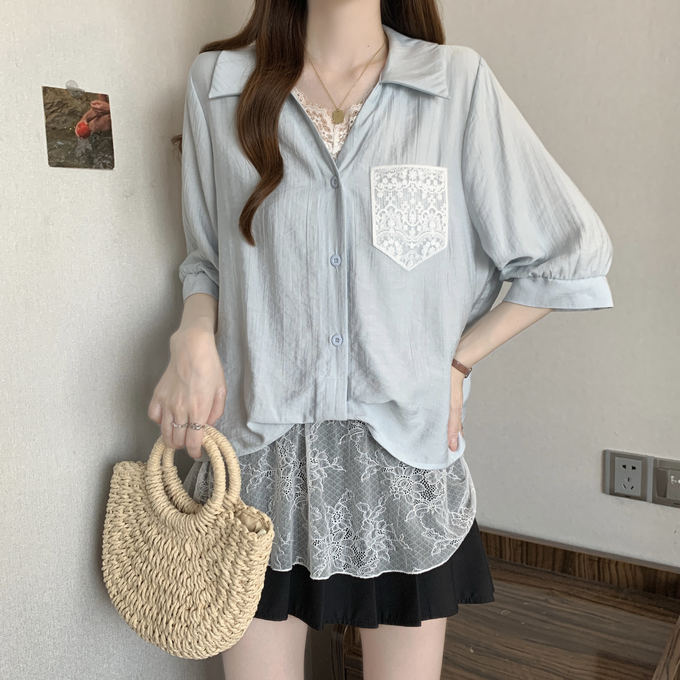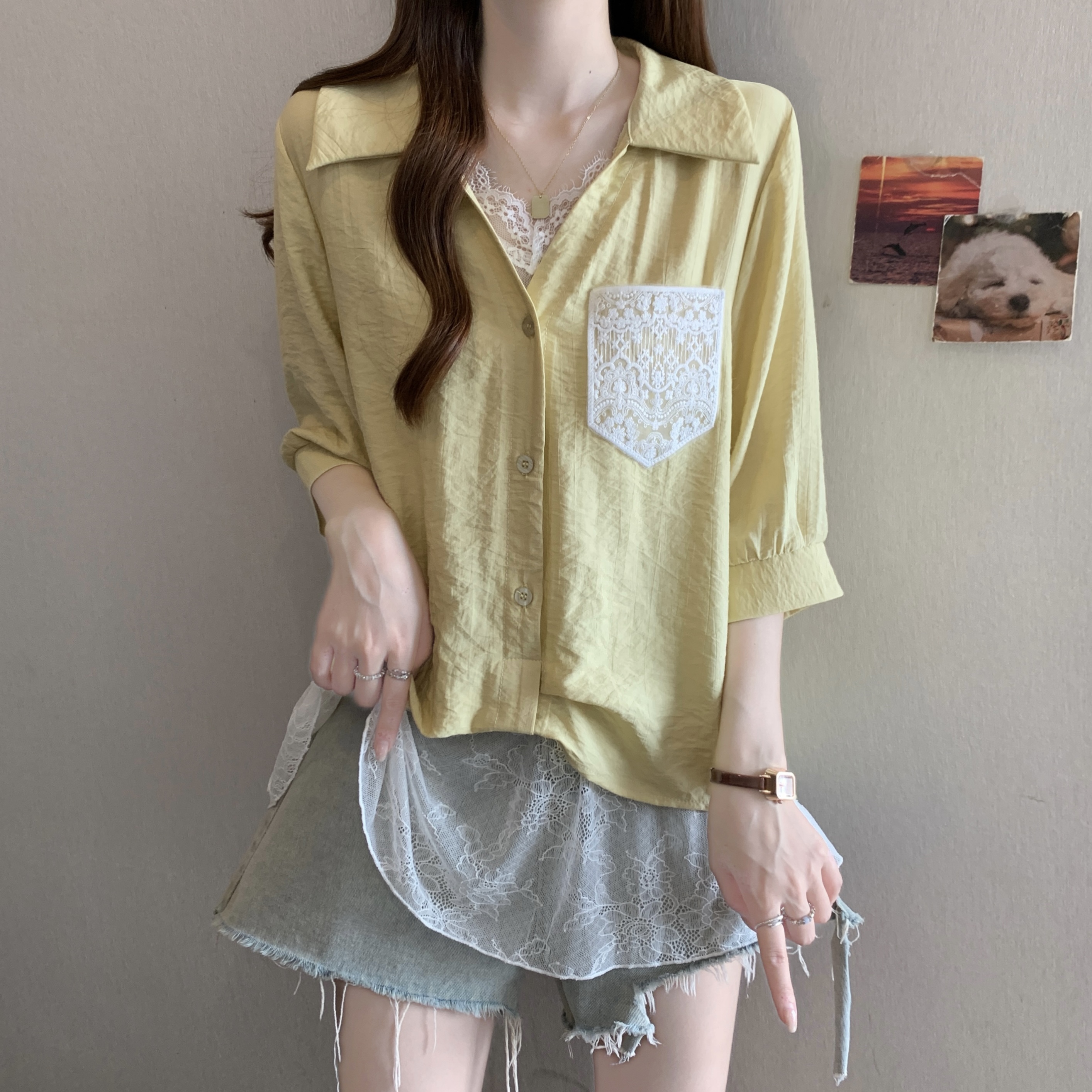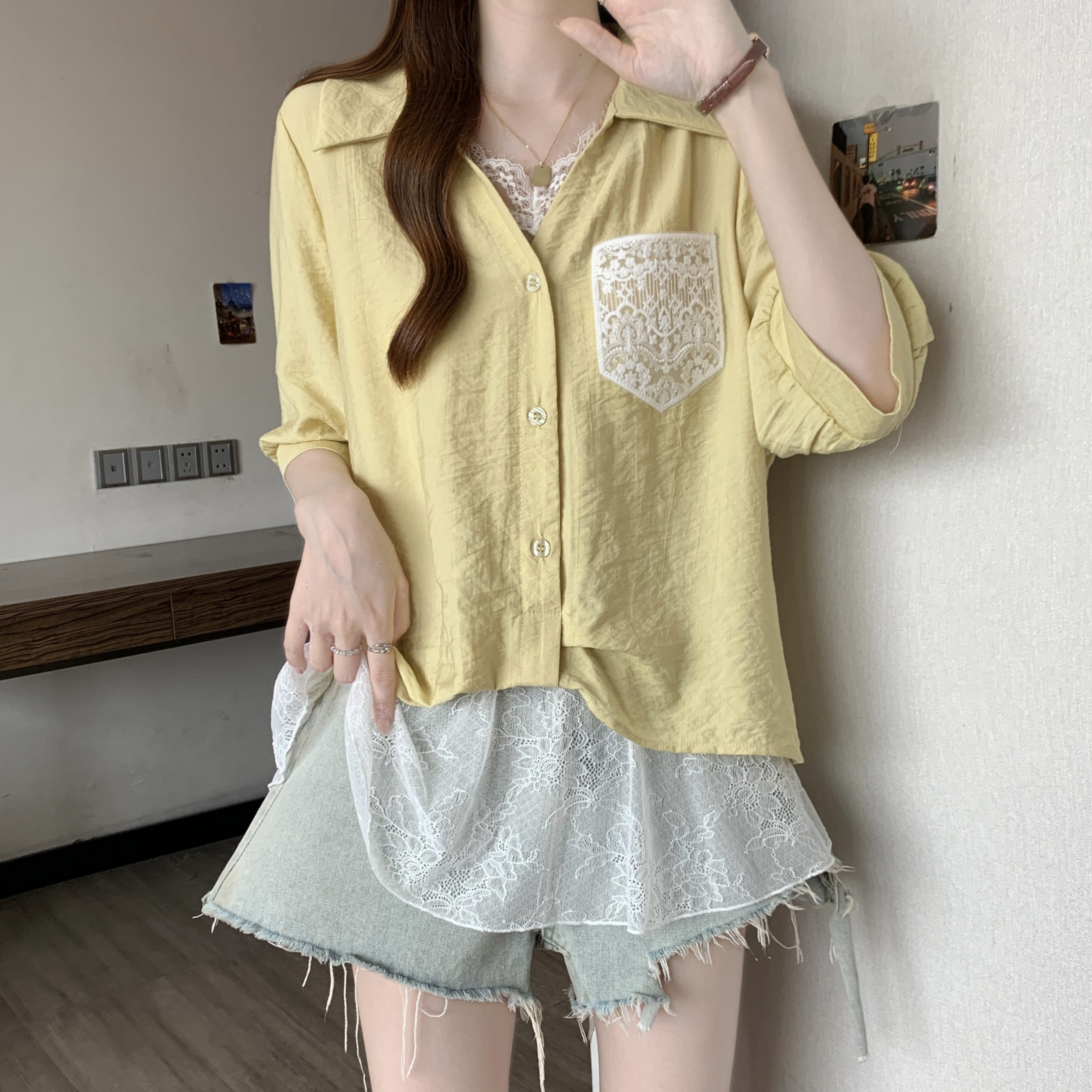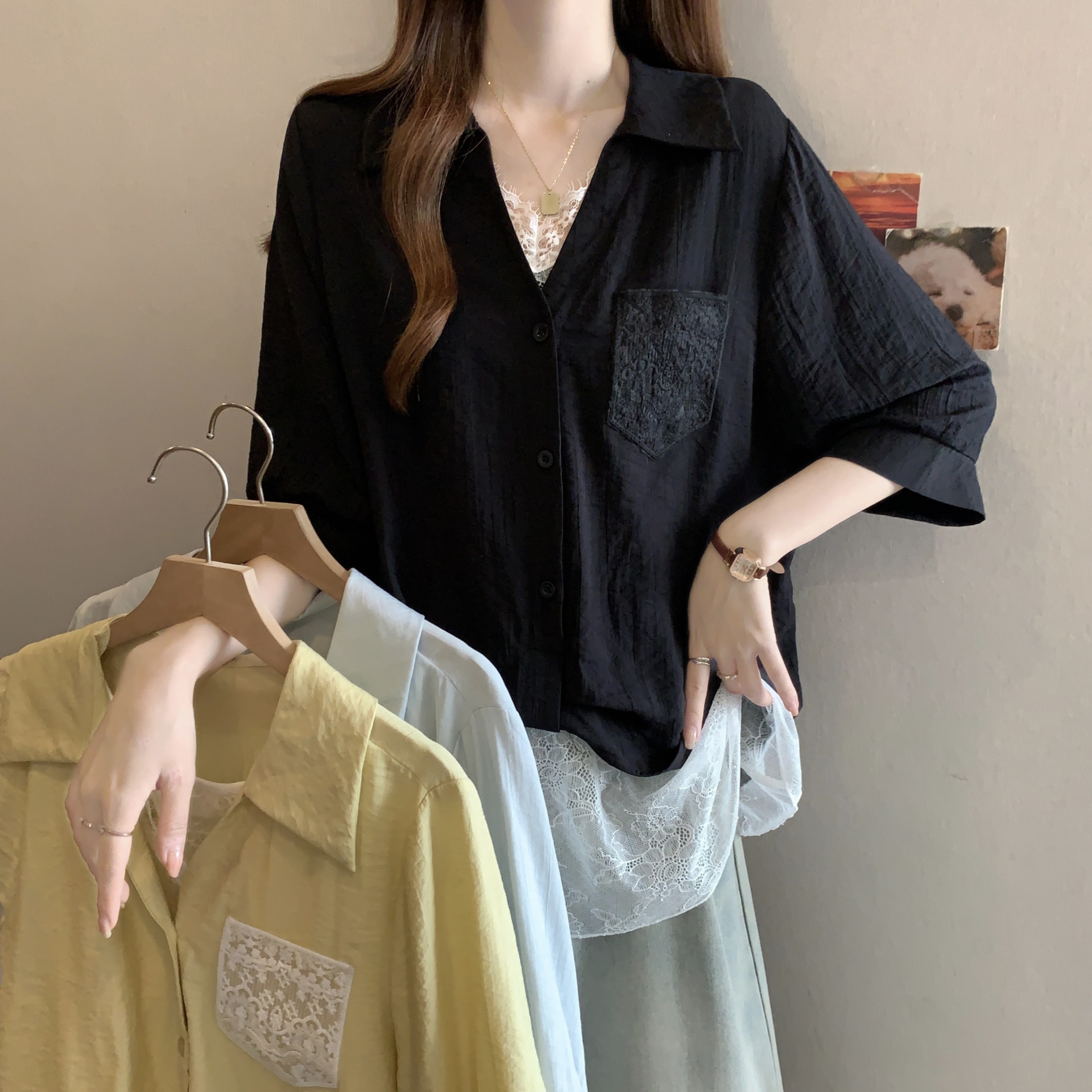 실사 빅 사이즈 2026 여름 지방 mm 빅 사이즈 패치워크 페이크 레이어드 레이스 반팔 셔츠 디자인 센스 슬림해 보이는 맨위