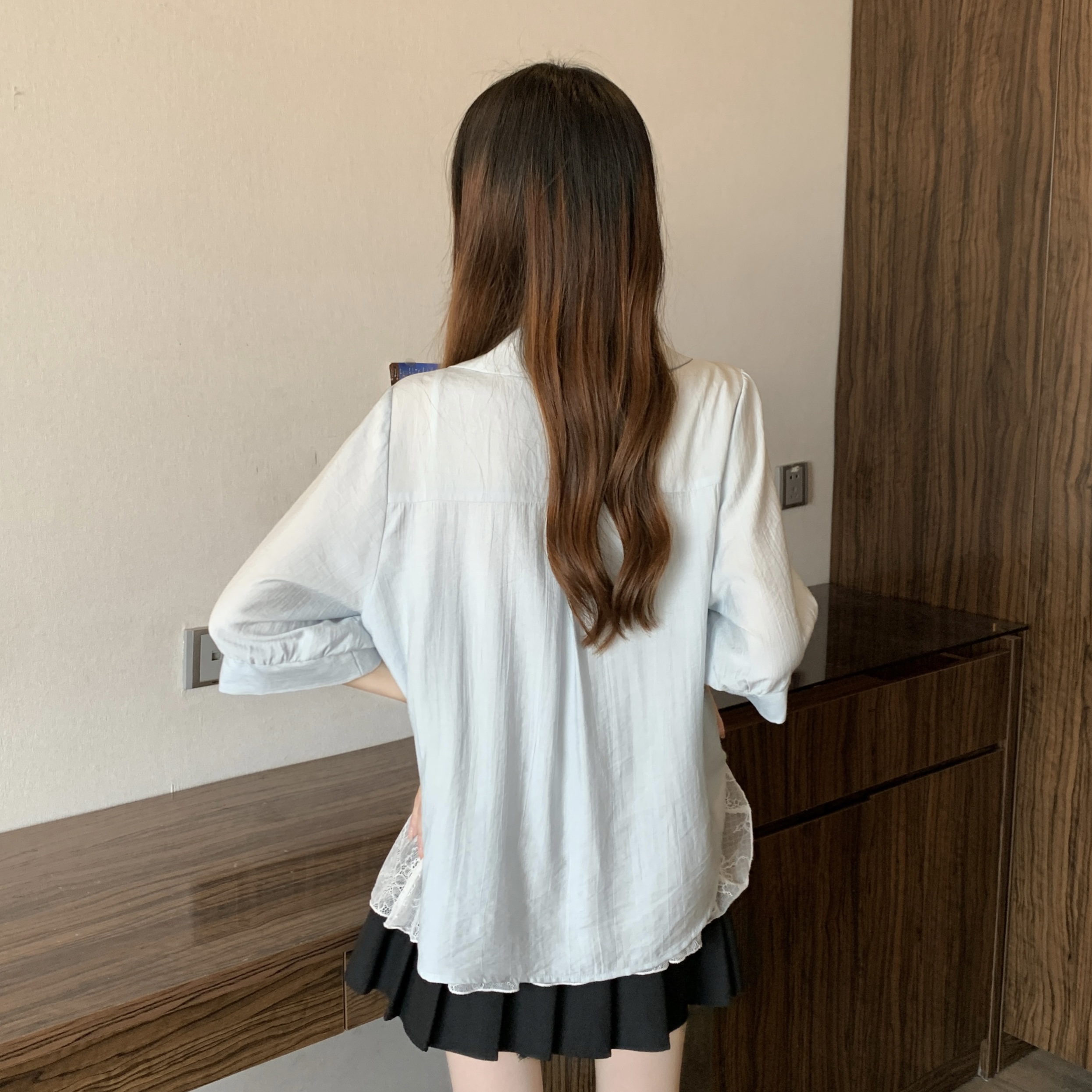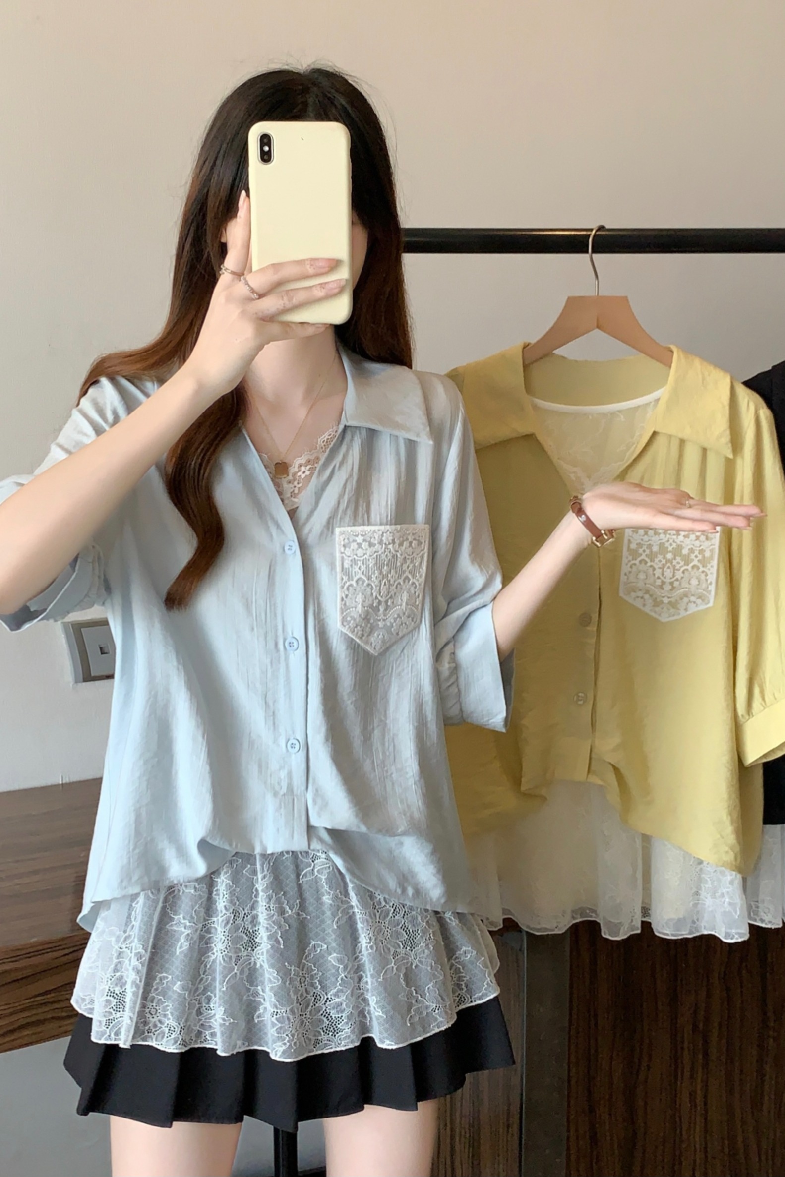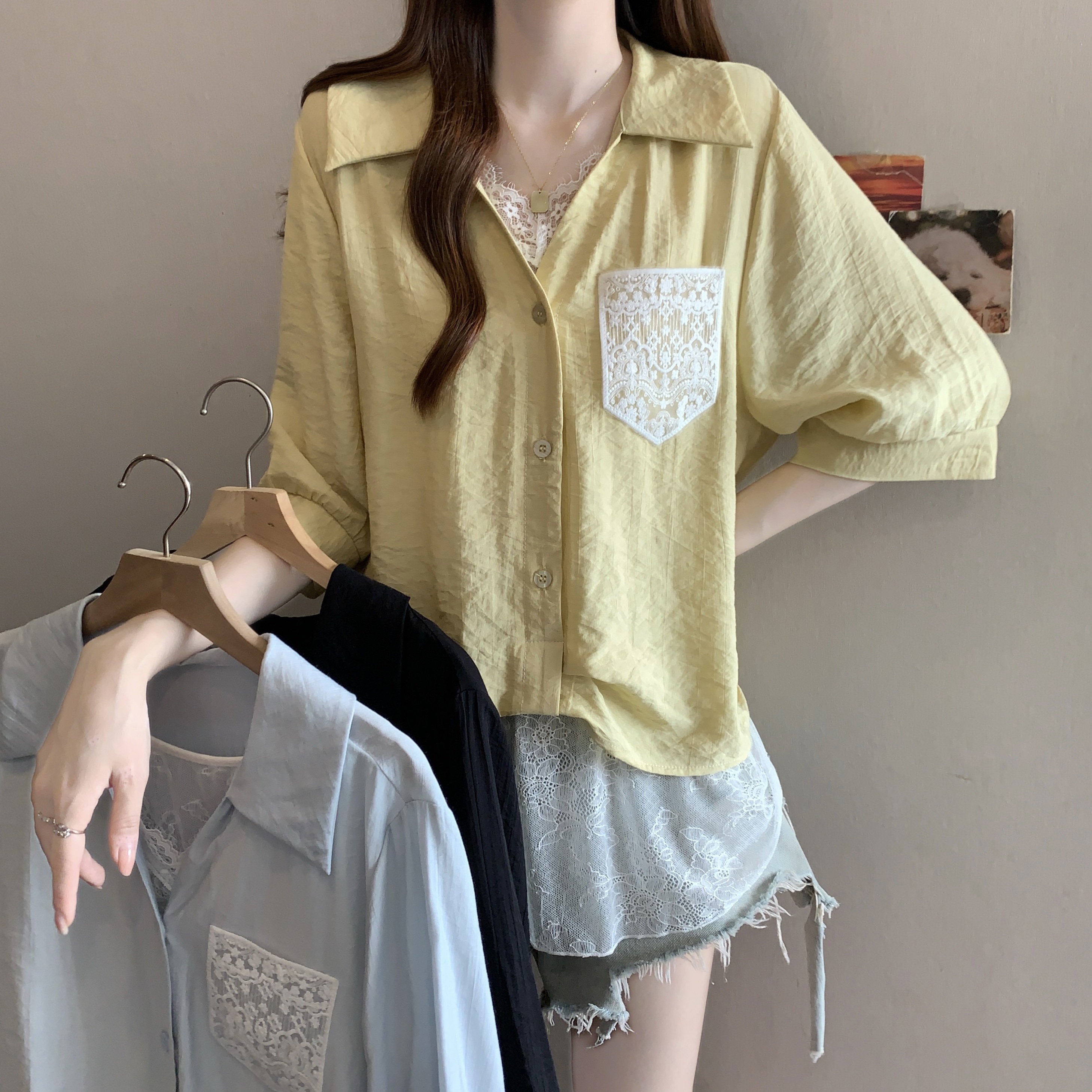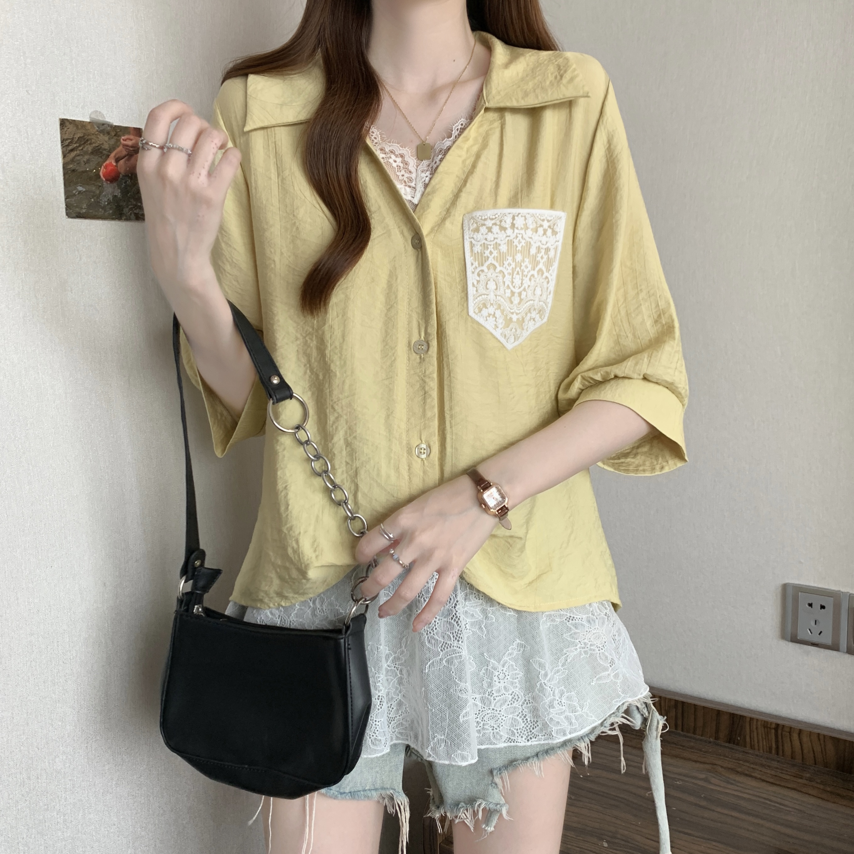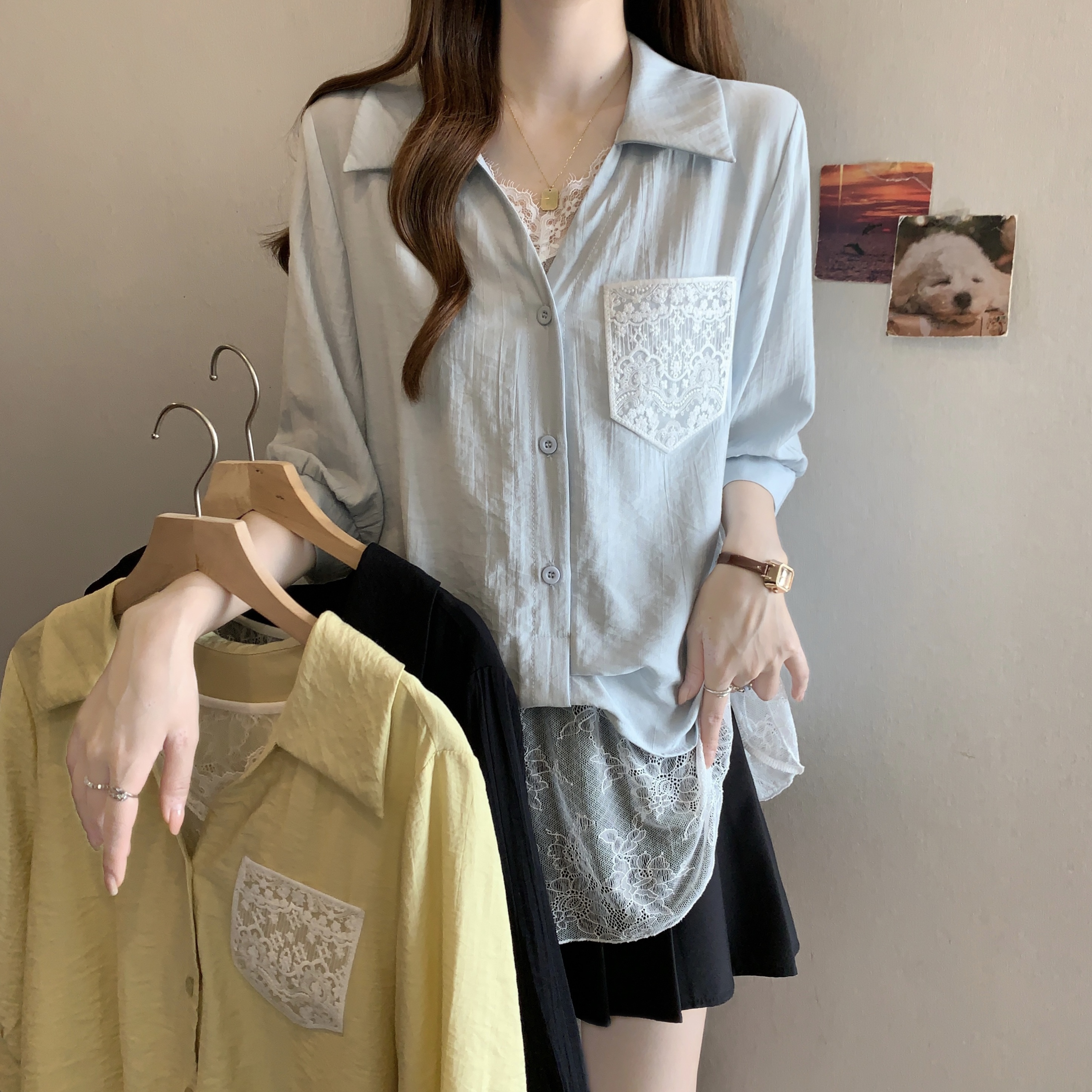 실사 빅 사이즈 2026 여름 지방 mm 빅 사이즈 패치워크 페이크 레이어드 레이스 반팔 셔츠 디자인 센스 슬림해 보이는 맨위