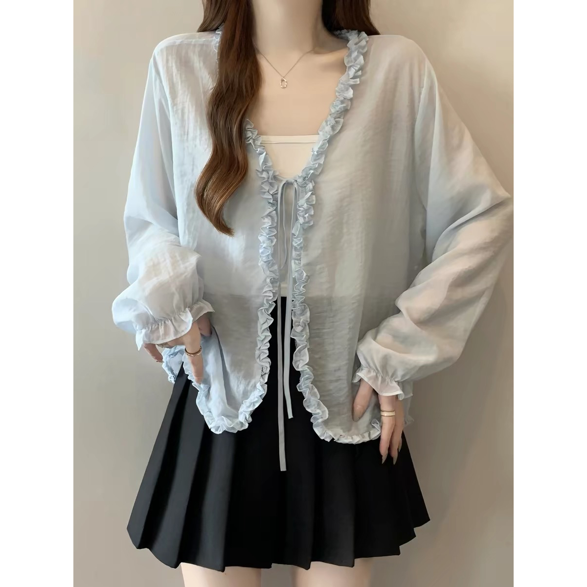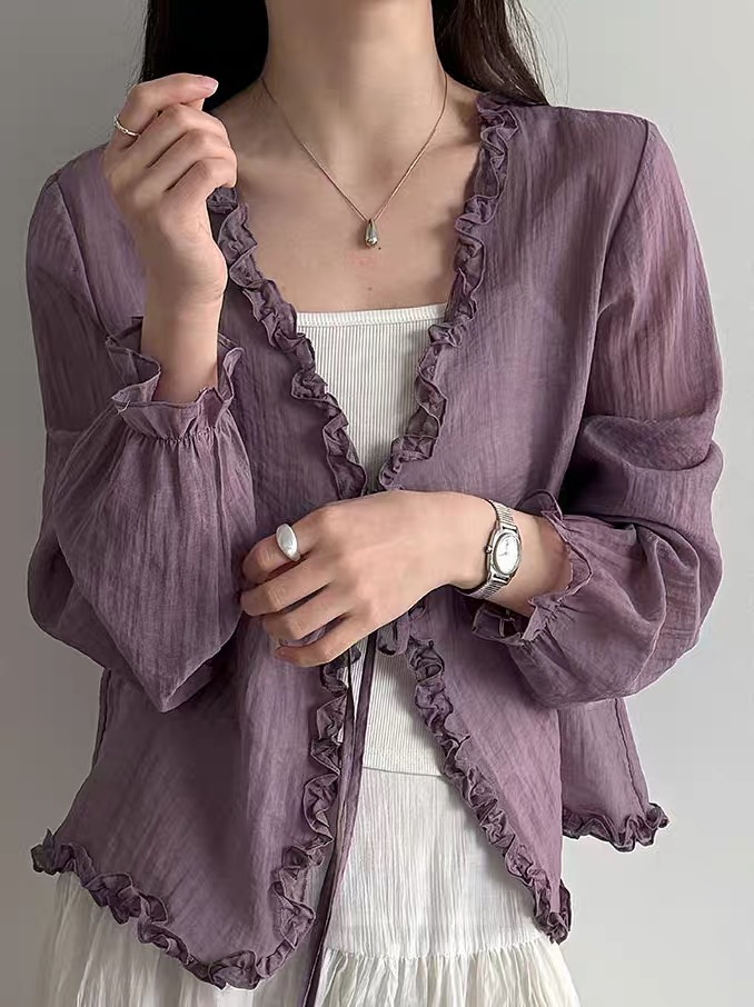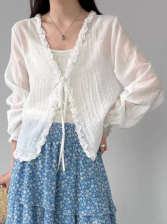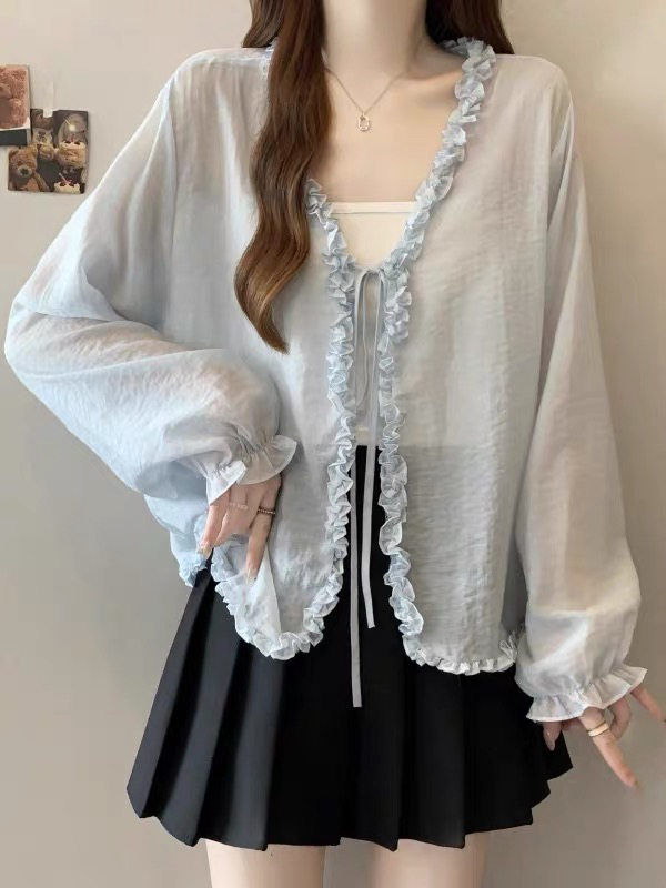 프릴 V넥 화이트 여성 셔츠 여름 한 부서 슬림해 보이는 얇은 스타일 자외선 차단 재킷 숄 오픈 가디건 외부 잡아라. 의류