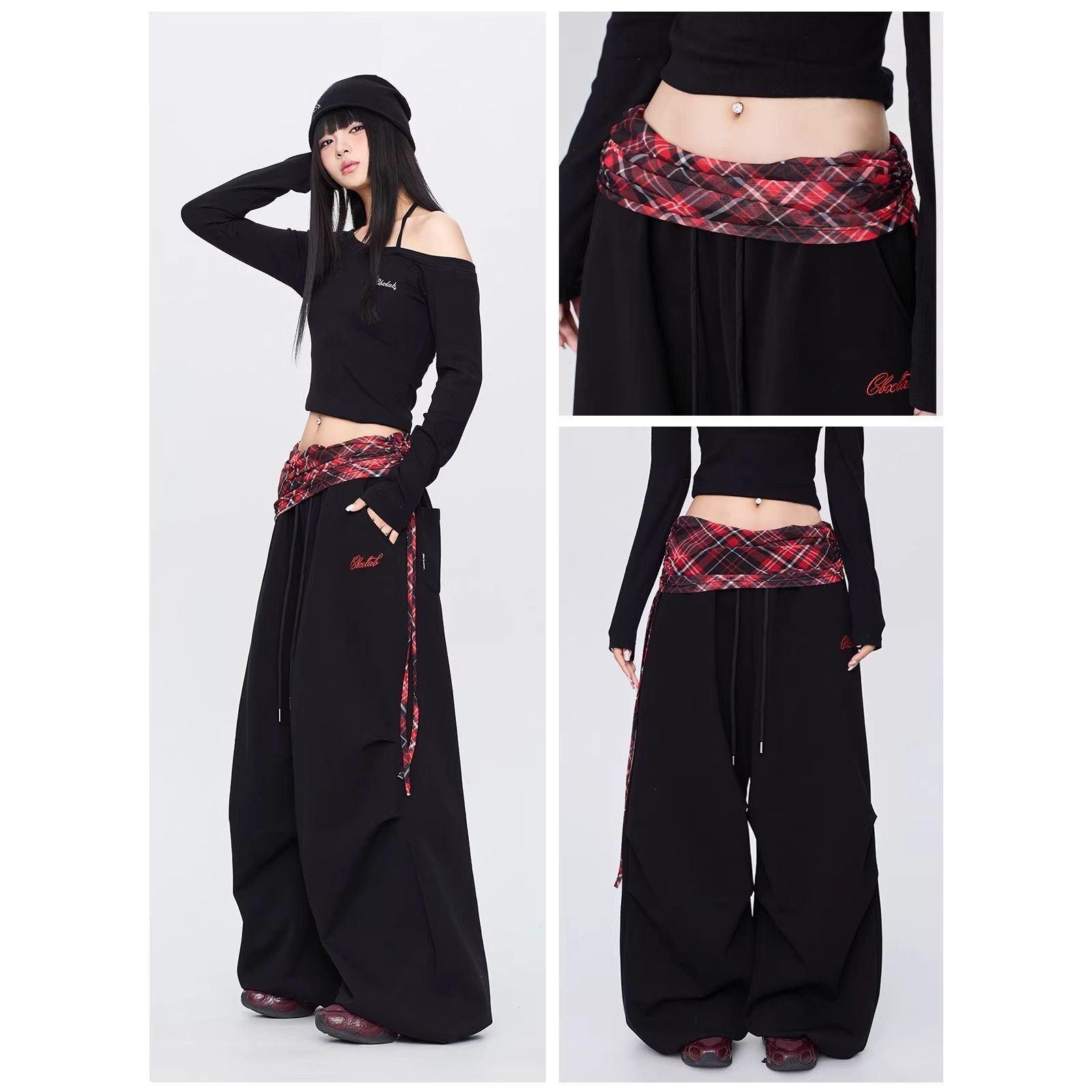 스트리트 댄스 조수 브랜드 스코틀랜드 빨간색 그리드 허리 머리 아메리칸 웃음 하 운동 바지 레트로 거리 핫걸 긴 바지 캐주얼 바지