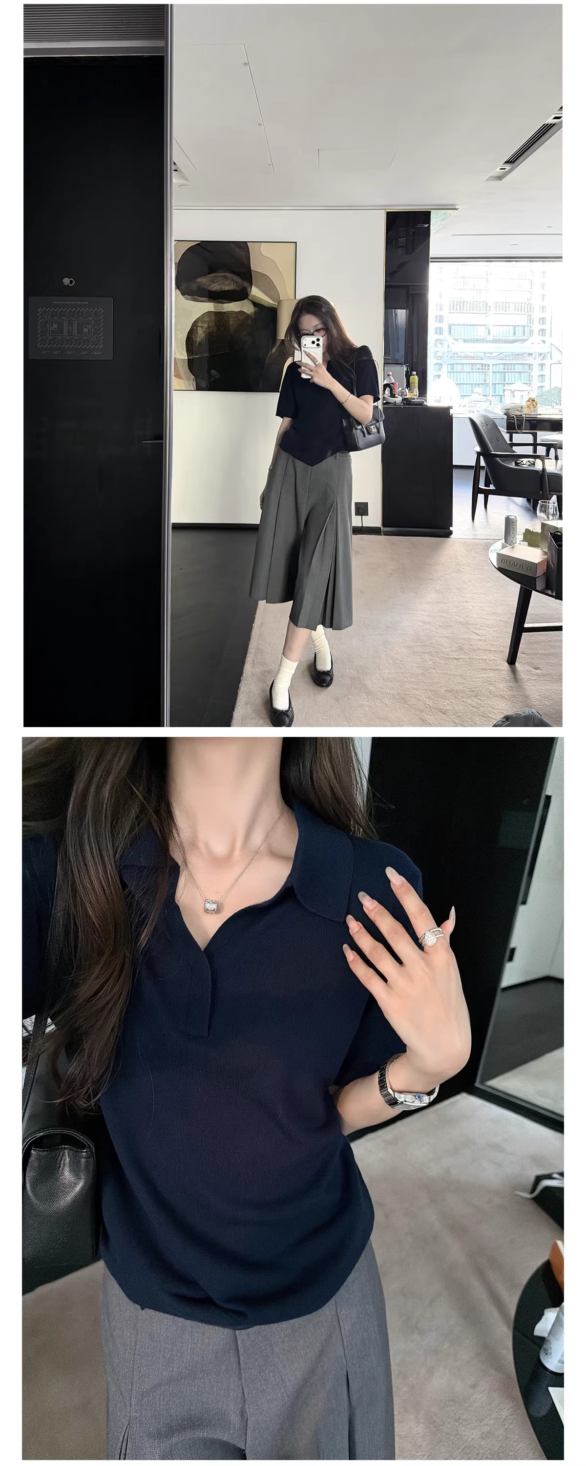 검정색 니트 반팔 티셔츠 여성 여름 드레스 2026 새로운 작은 키 쇼트 스타일 베이비 칼라 허리 수축 거품 소매 맨위