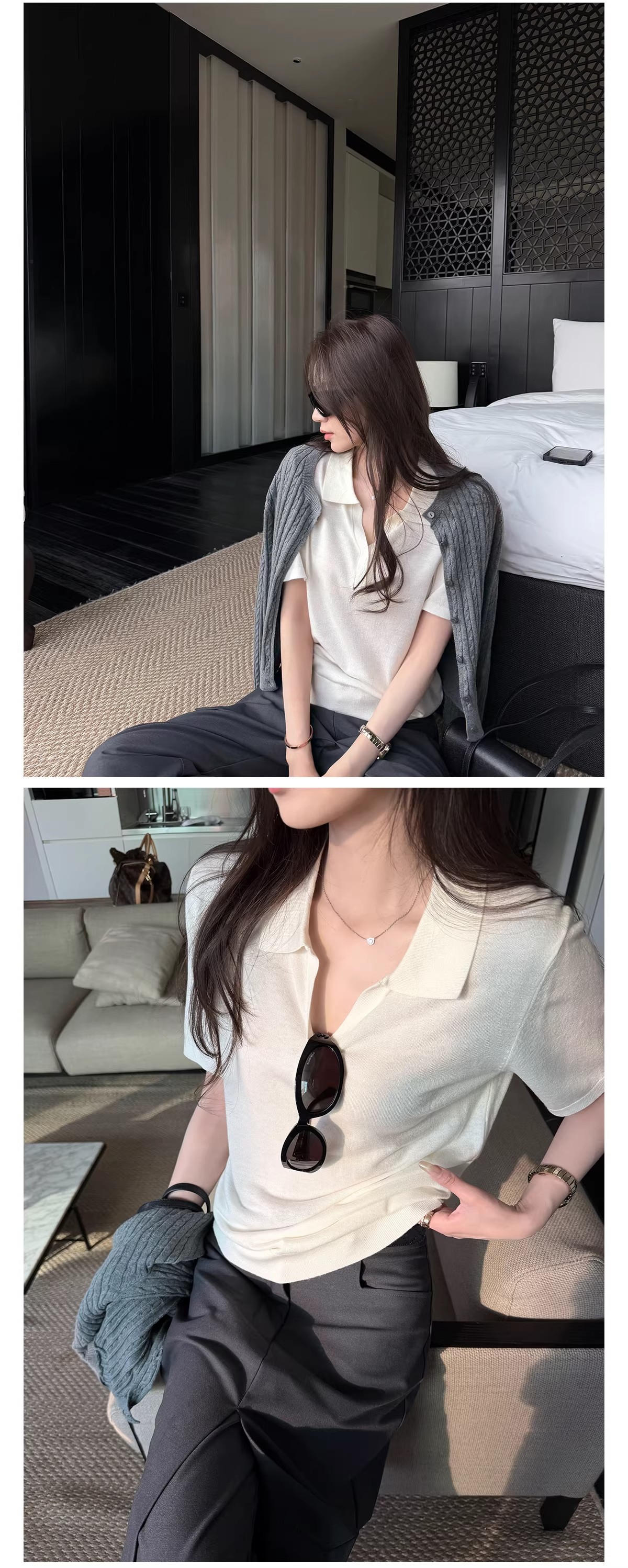 프랑스식 레트로 스카프 V넥 니트 반팔 티셔츠 여성 여름 2026 새로운 슈퍼 화재 연령 감소 아름다운 맨위