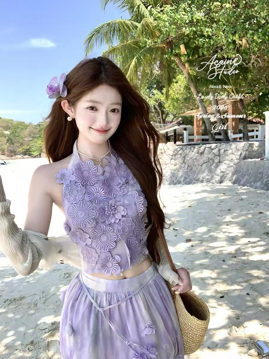 acaine 마이크로 팬 스택 보라색 그라데이션 레이스 행침 목 맨위 반 스커트