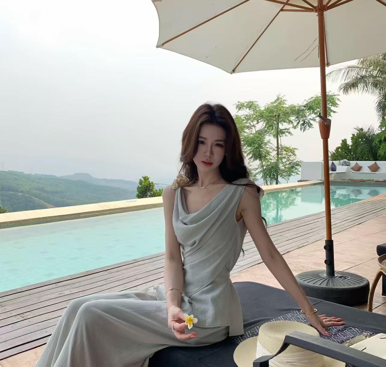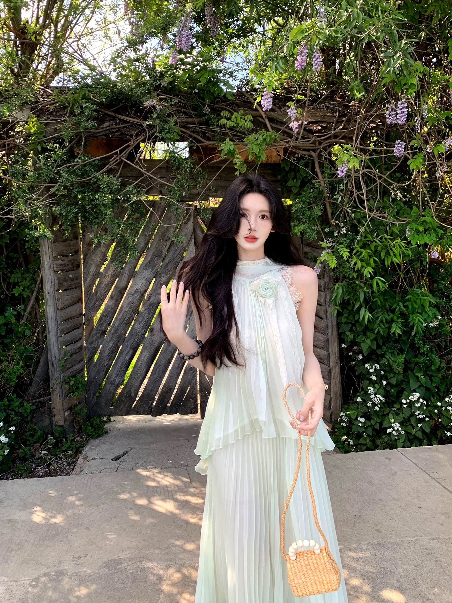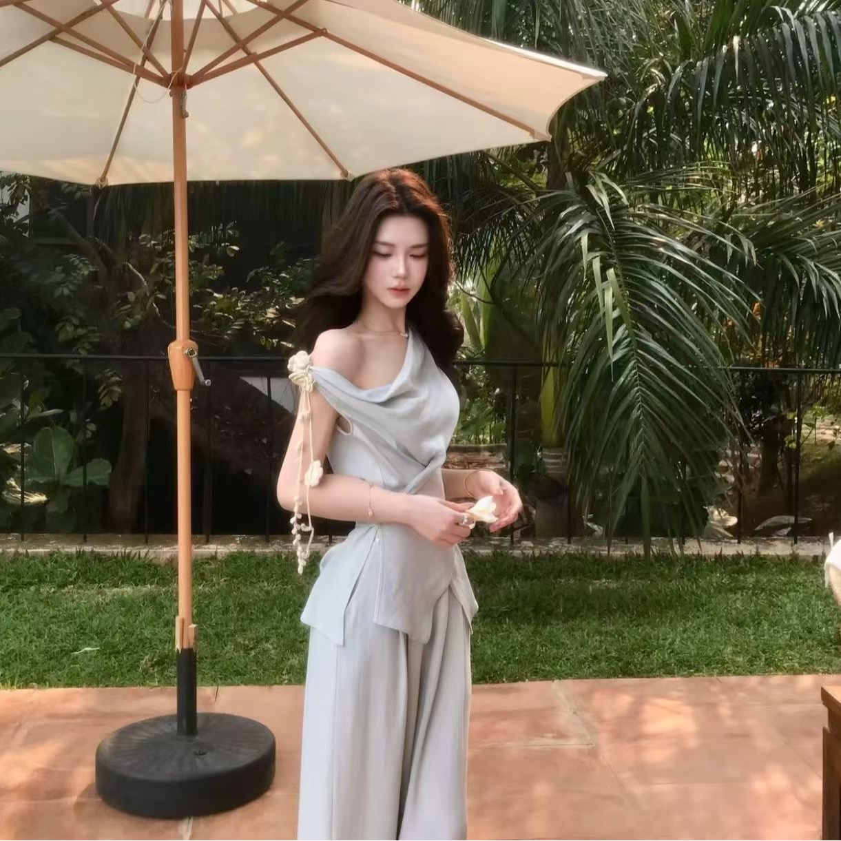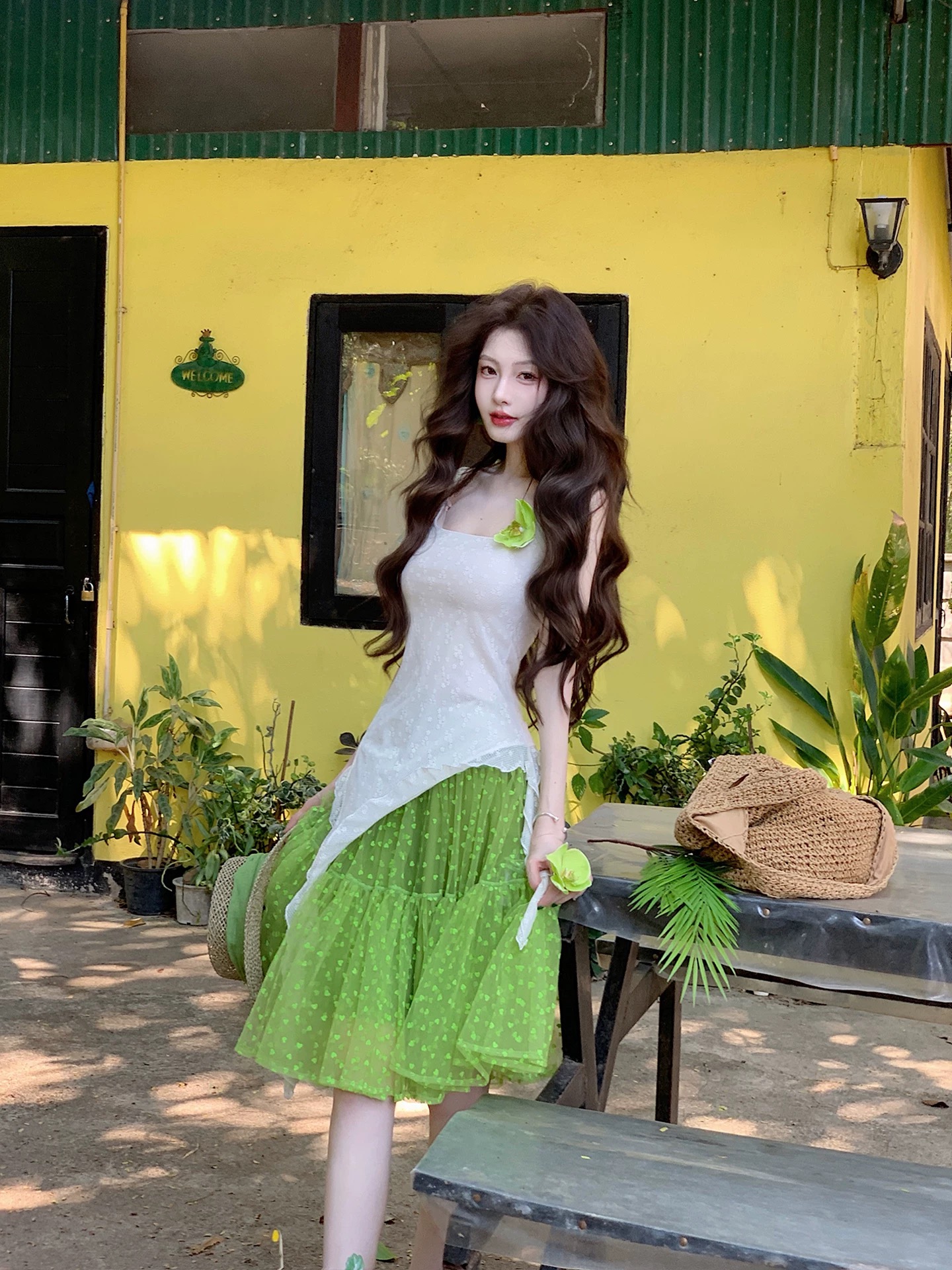 부드러운 바람 3 차원 꽃 슬립 반 스커트 세트 여름 착용 가져 가라.