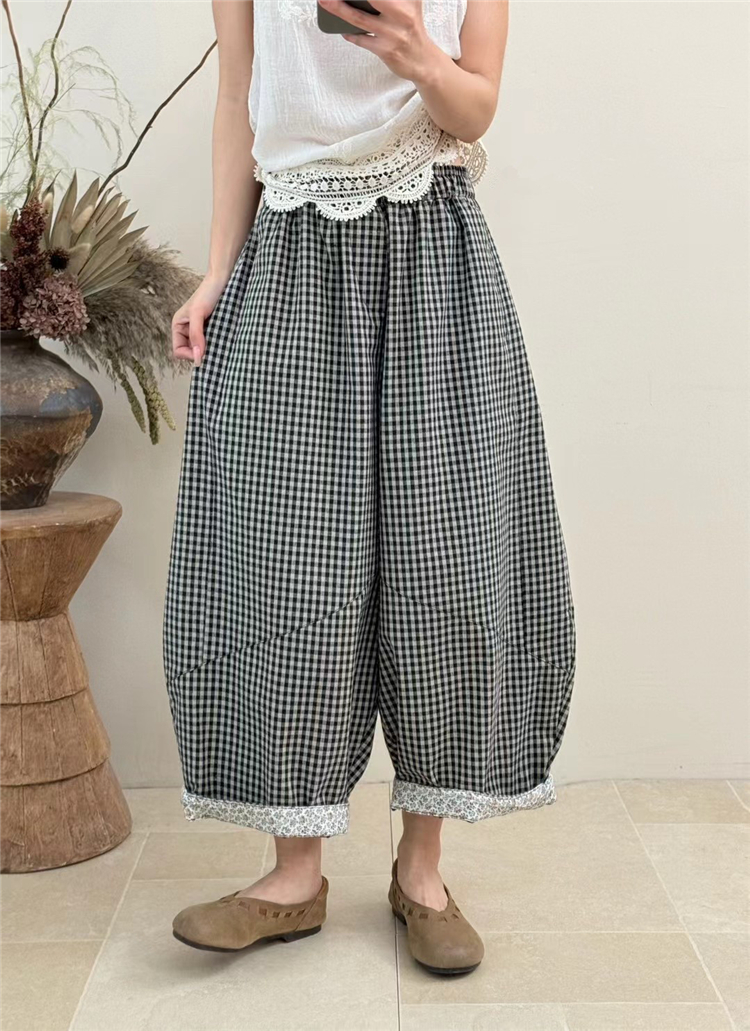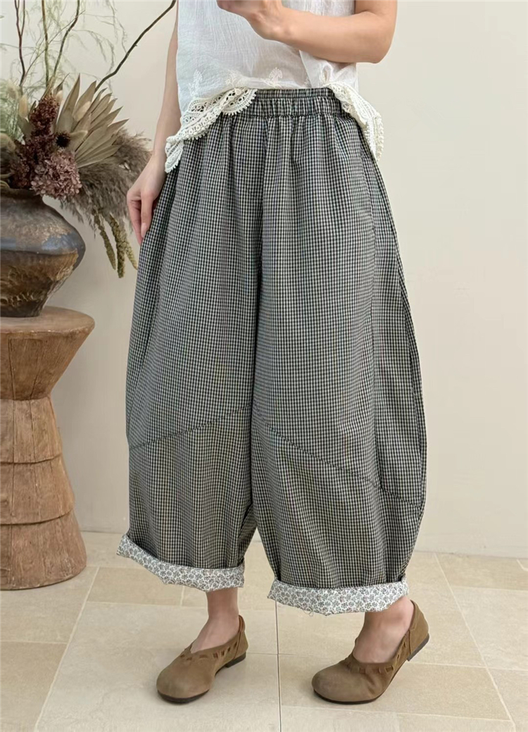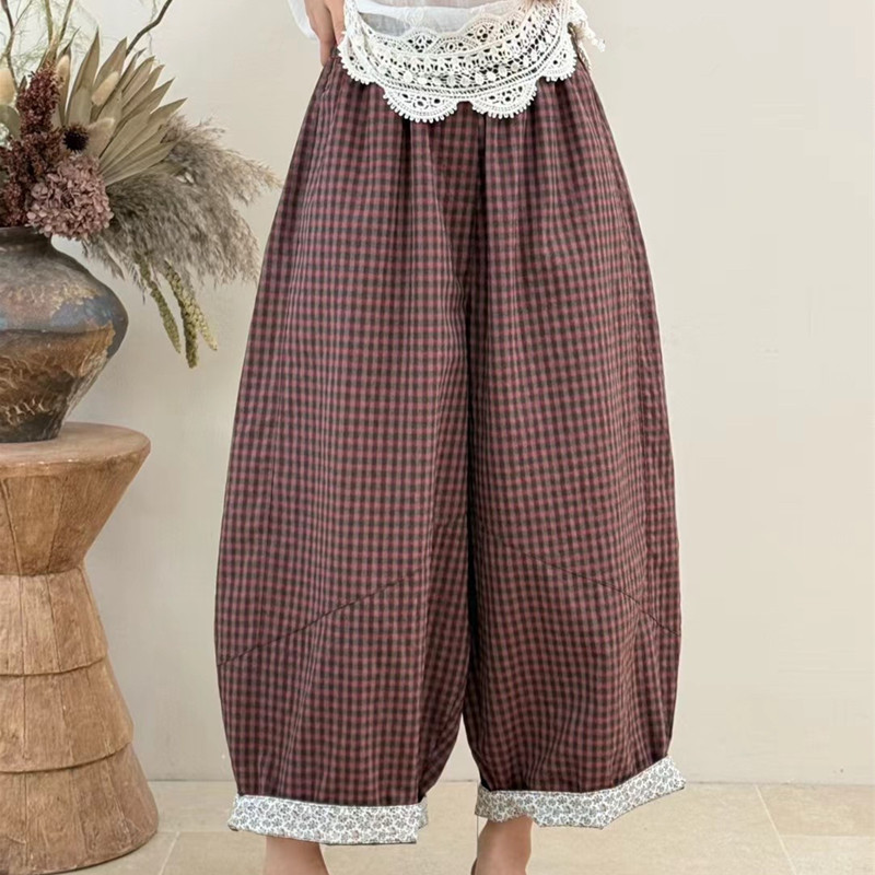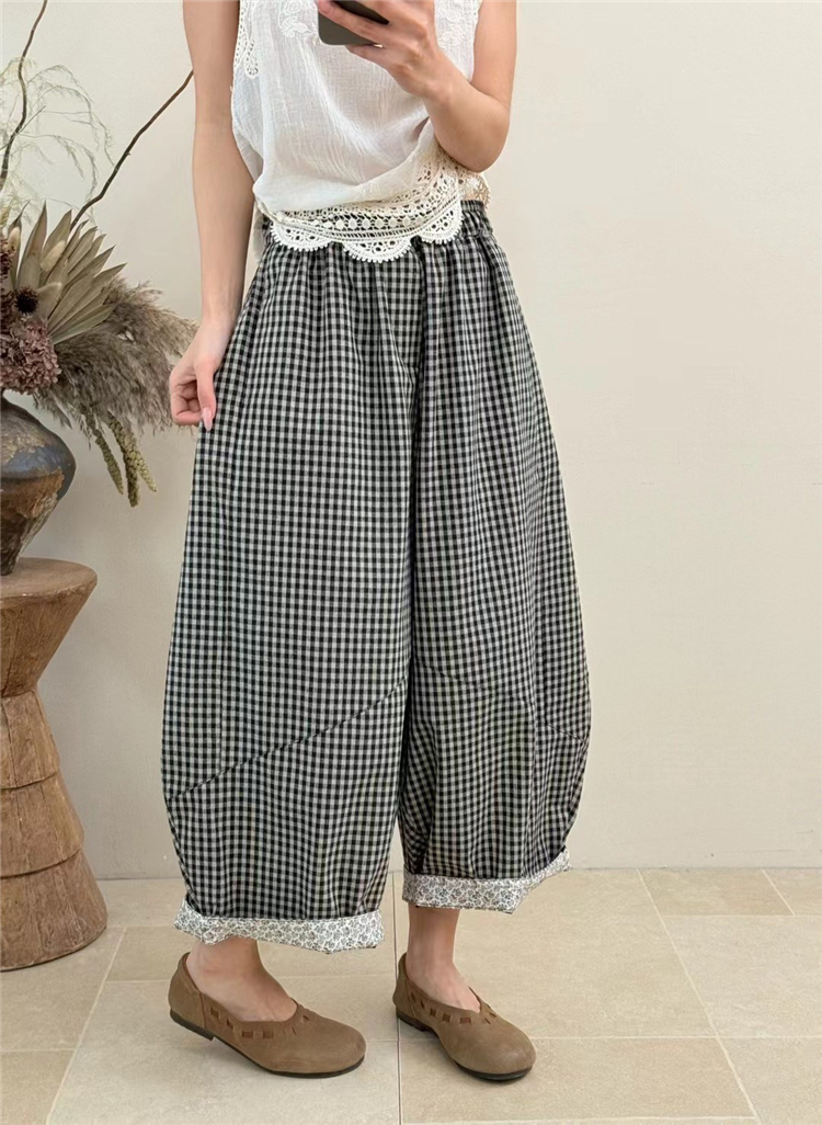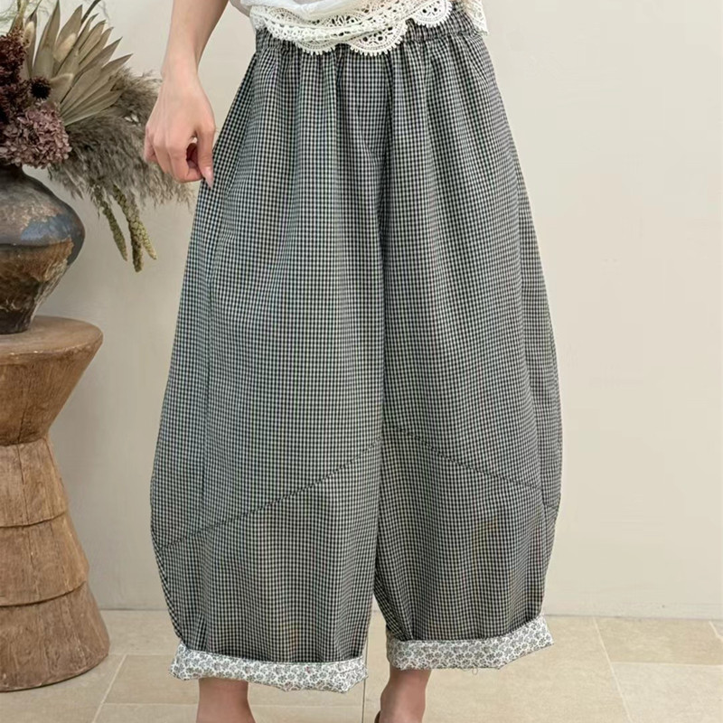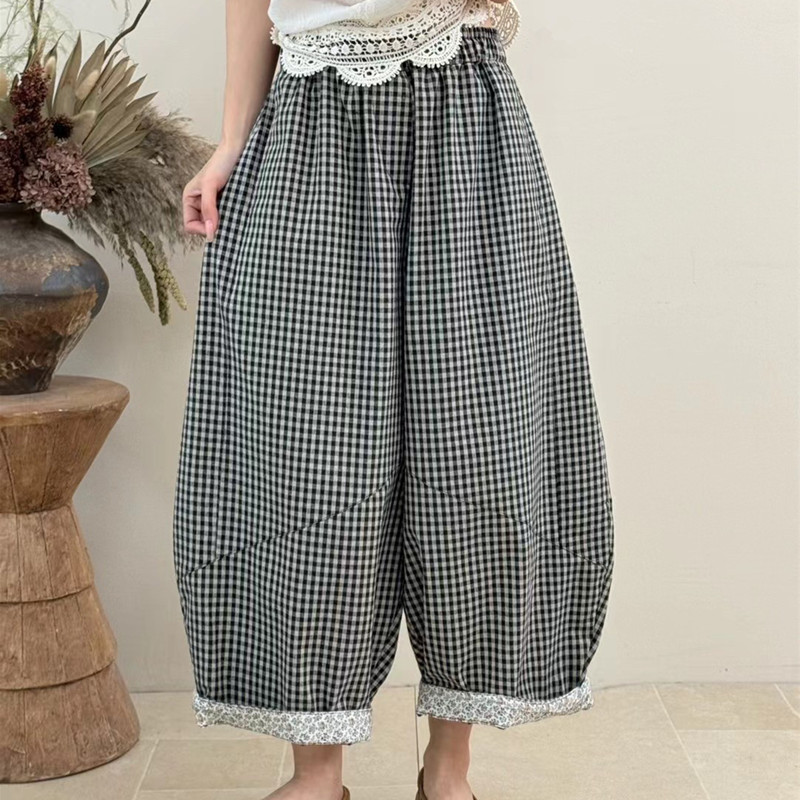 봄 여름 새로운 문예 다용도 루즈핏 넓은 다리 캐주얼 체크무늬 바지 대 에디션 모통이 칼 풍선 바지