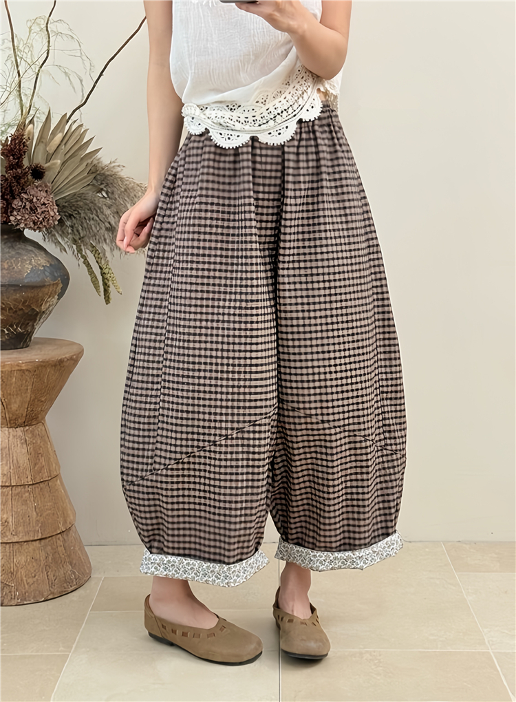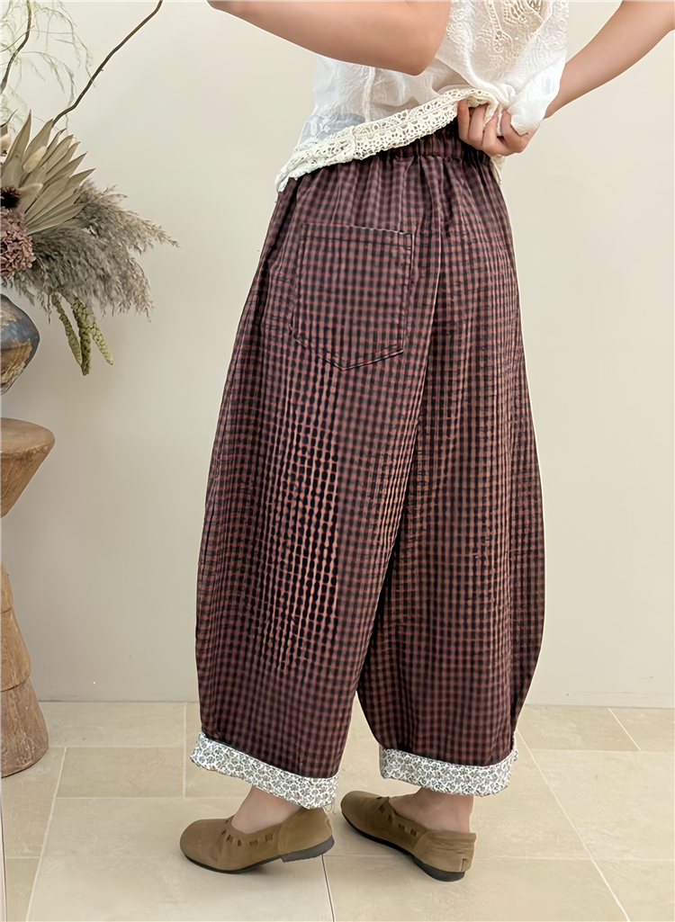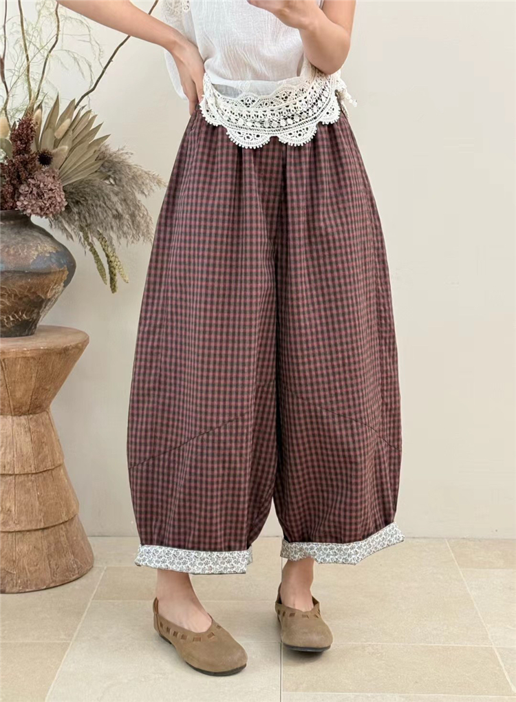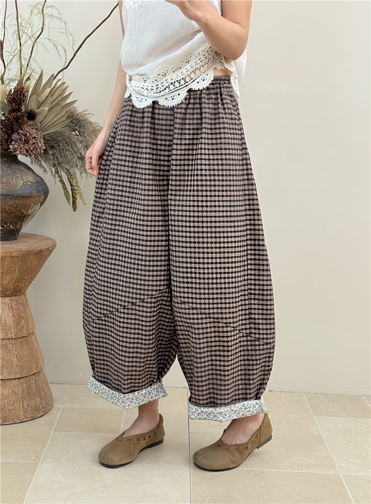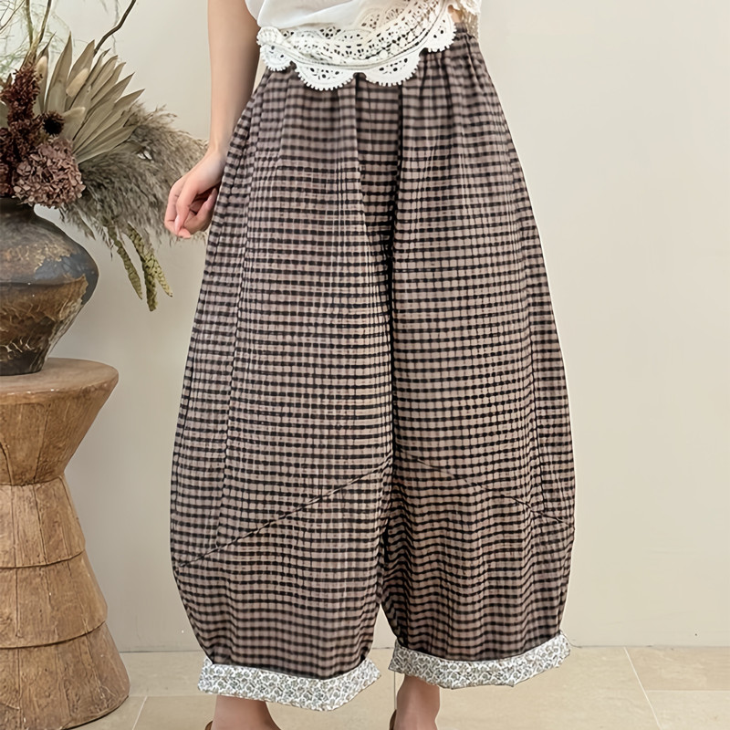 봄 여름 새로운 문예 다용도 루즈핏 넓은 다리 캐주얼 체크무늬 바지 대 에디션 모통이 칼 풍선 바지