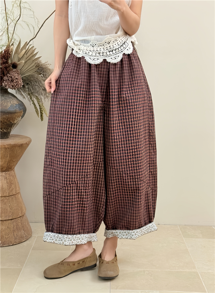 봄 여름 새로운 고급 센스 체크무늬 바지 루즈핏 슬림해 보이는 캐주얼 연령 감소 다용도 와이드 레그 팬츠 9 포인트 바지