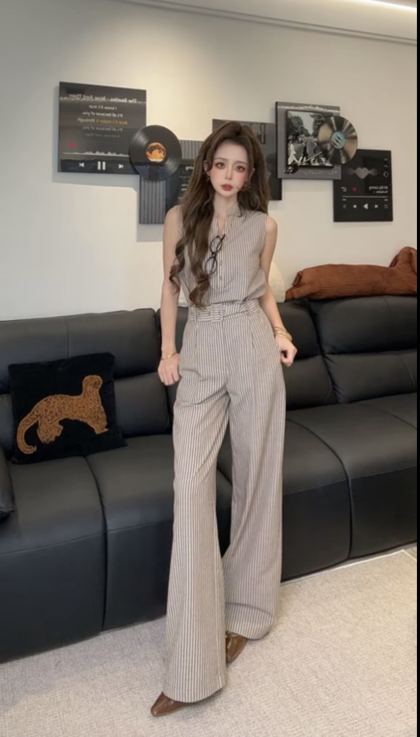 일레븐 맞춤 학문적 오래된 돈 바람 스트라이프 민소매 V넥 허리 수축 하이웨이스트 스트레이트 팬츠 게으른 세트