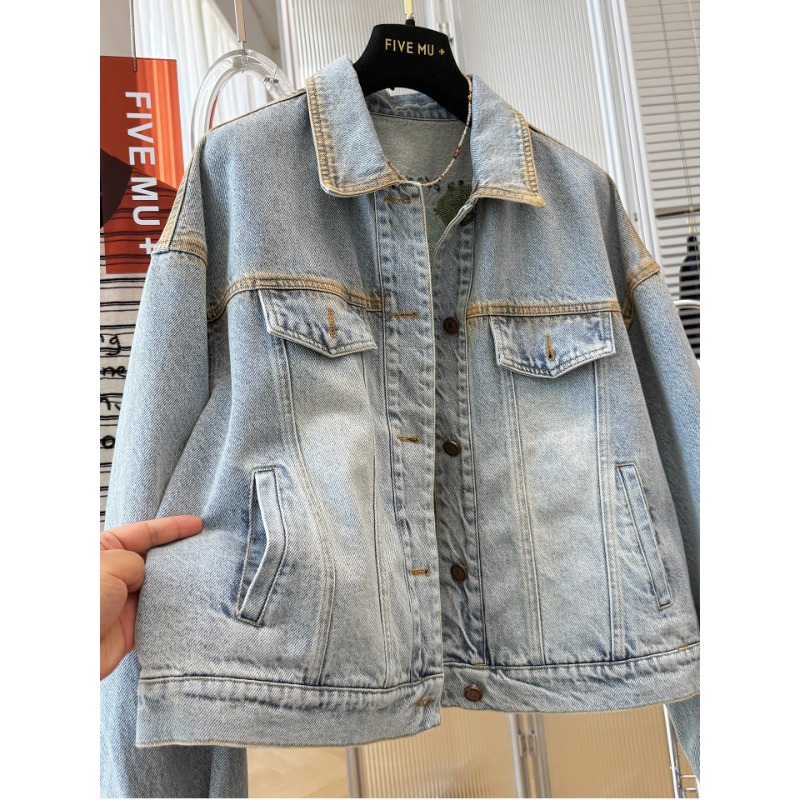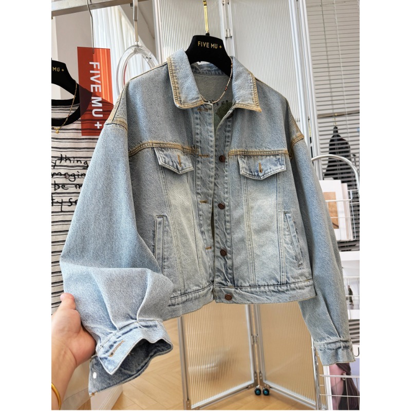 유럽 상품 무거운 작업 자수 데님 여성 코트 2026 봄 새로운 루즈핏 폴로 칼라 쇼트 스타일 긴팔 맨위 유럽 역