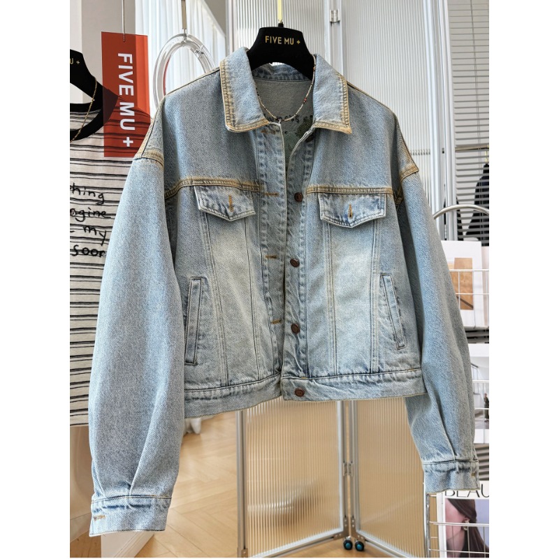 무거운 작업 자수 데님 쇼트 스타일 여성 코트 2026 봄 드레스 새로운 한 부서 착용 가져 가라. 자이언트 잘 생긴 라운드 넥 재킷 맨위