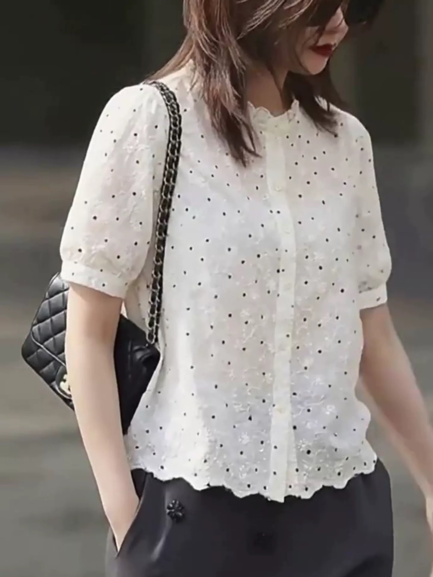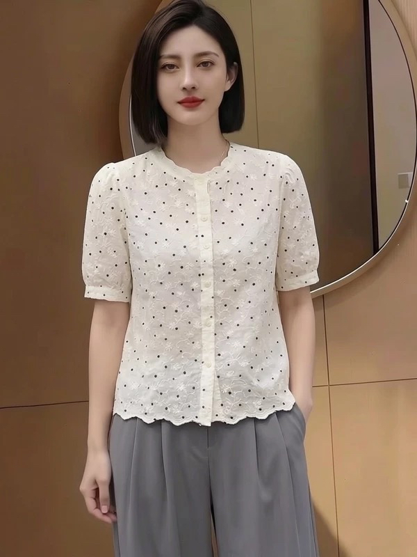 프랑스식 달콤함 연령 감소 우아함 반팔 도트 무늬 셔츠 여름 드레스 고급 센스 싱글 줄 버튼 외국 가스 패션 셔츠 작은 셔츠