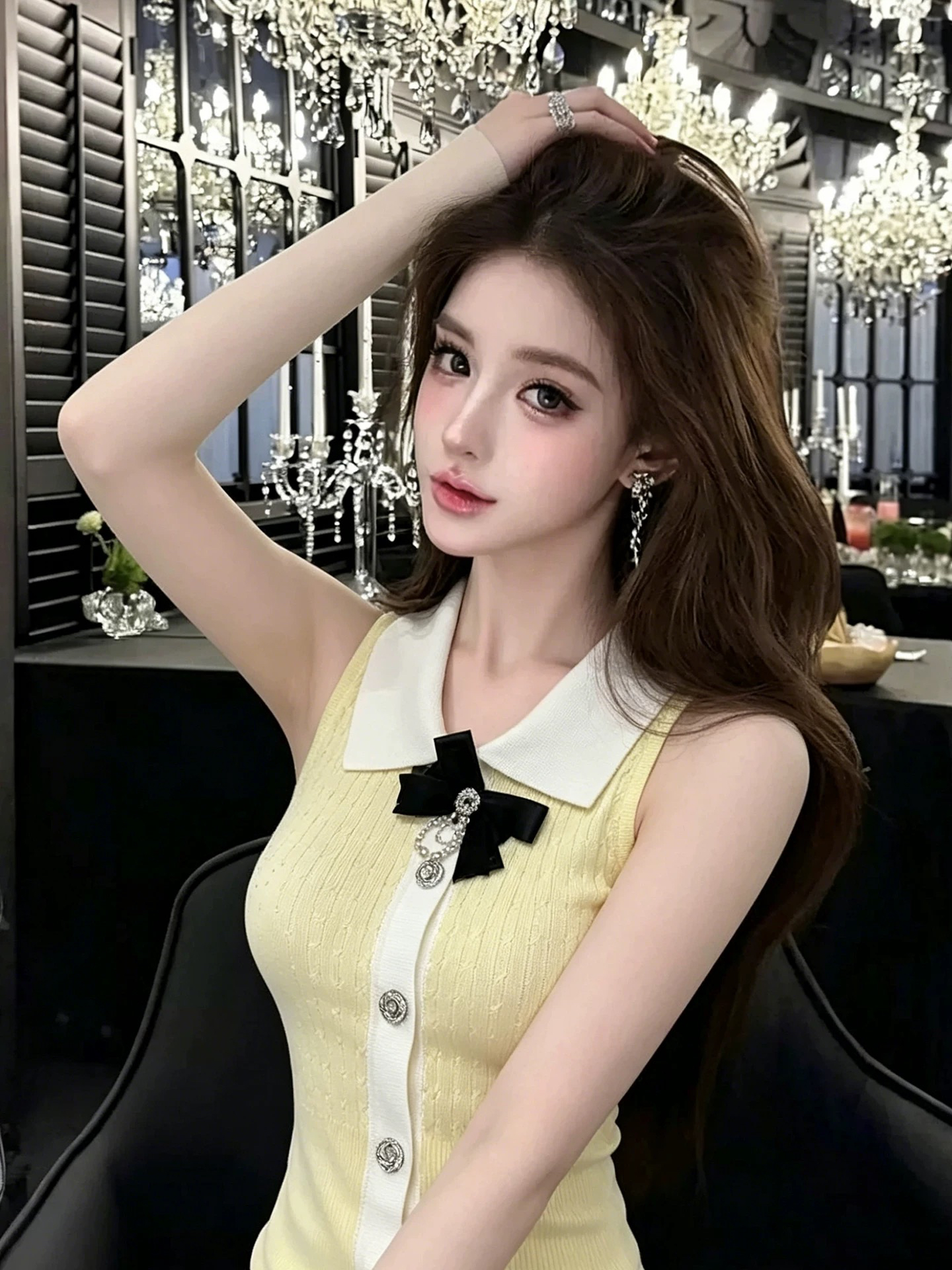 lym studio 프랑스식 폴로 칼라 나비 매듭 니트 조끼 여성 배색 디자인 센스 몸매 가꾸기 슬림해 보이는 맨위