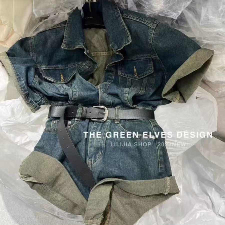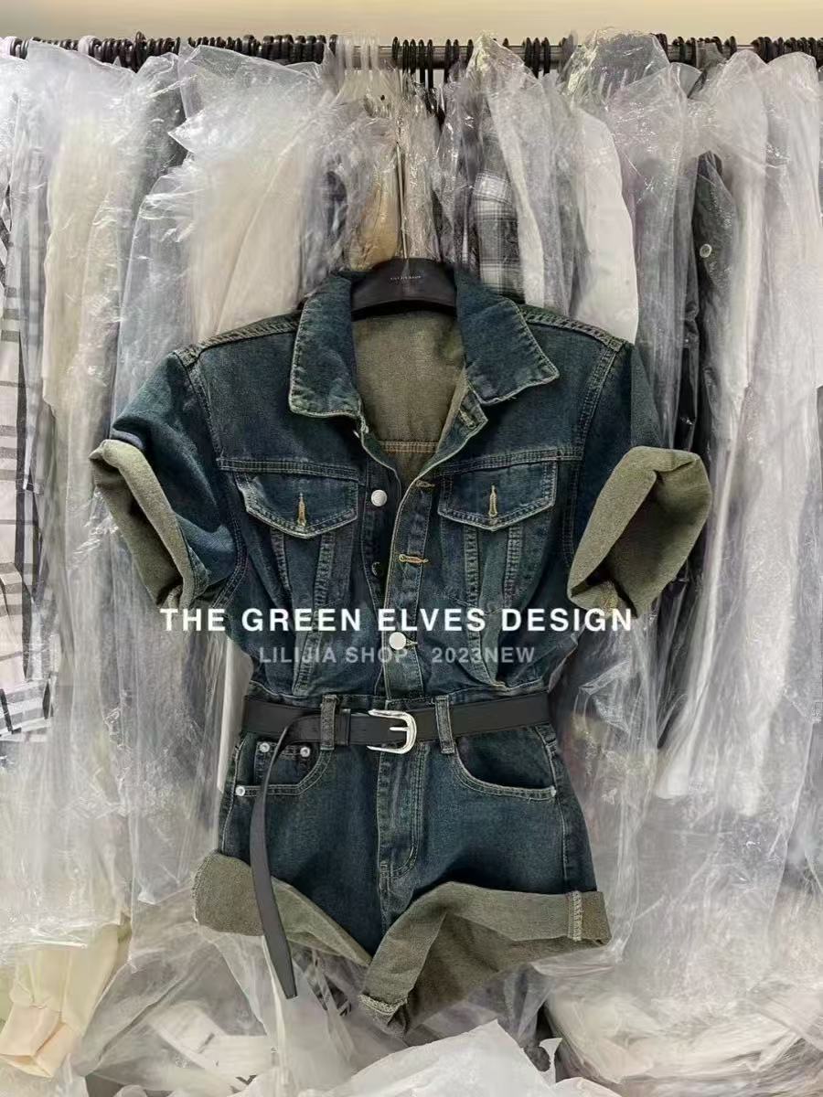 데님 올인원 바지 고급 센스 반바지 허리 수축 슬림해 보이는 세트 품격 점프 슈트 바지 워크웨어 올인원 의류 여름 여성 의류