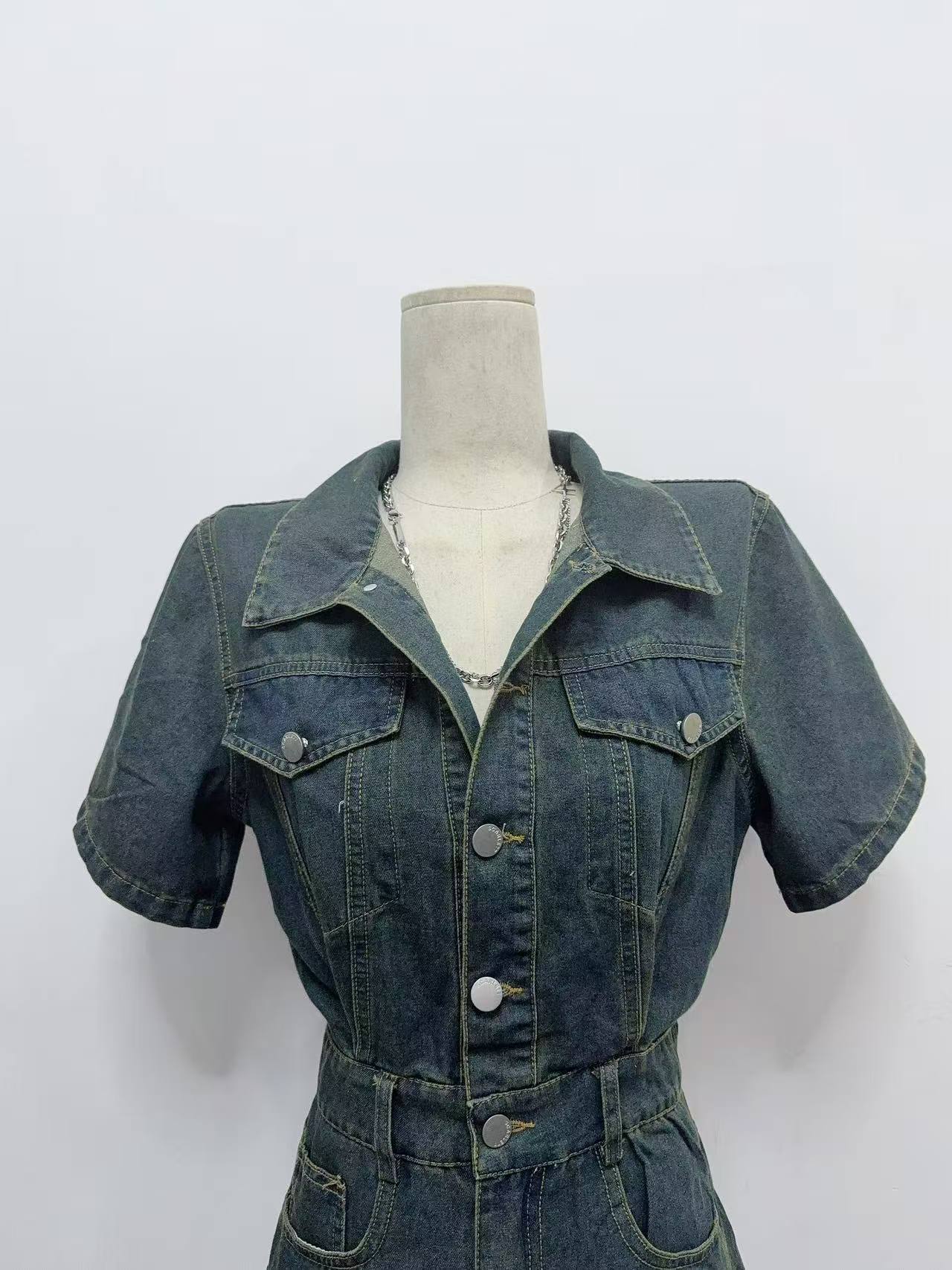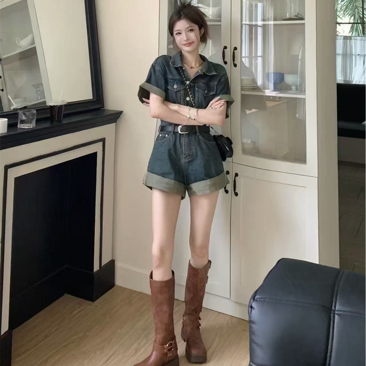 데님 올인원 바지 고급 센스 반바지 허리 수축 슬림해 보이는 세트 품격 점프 슈트 바지 워크웨어 올인원 의류 여름 여성 의류