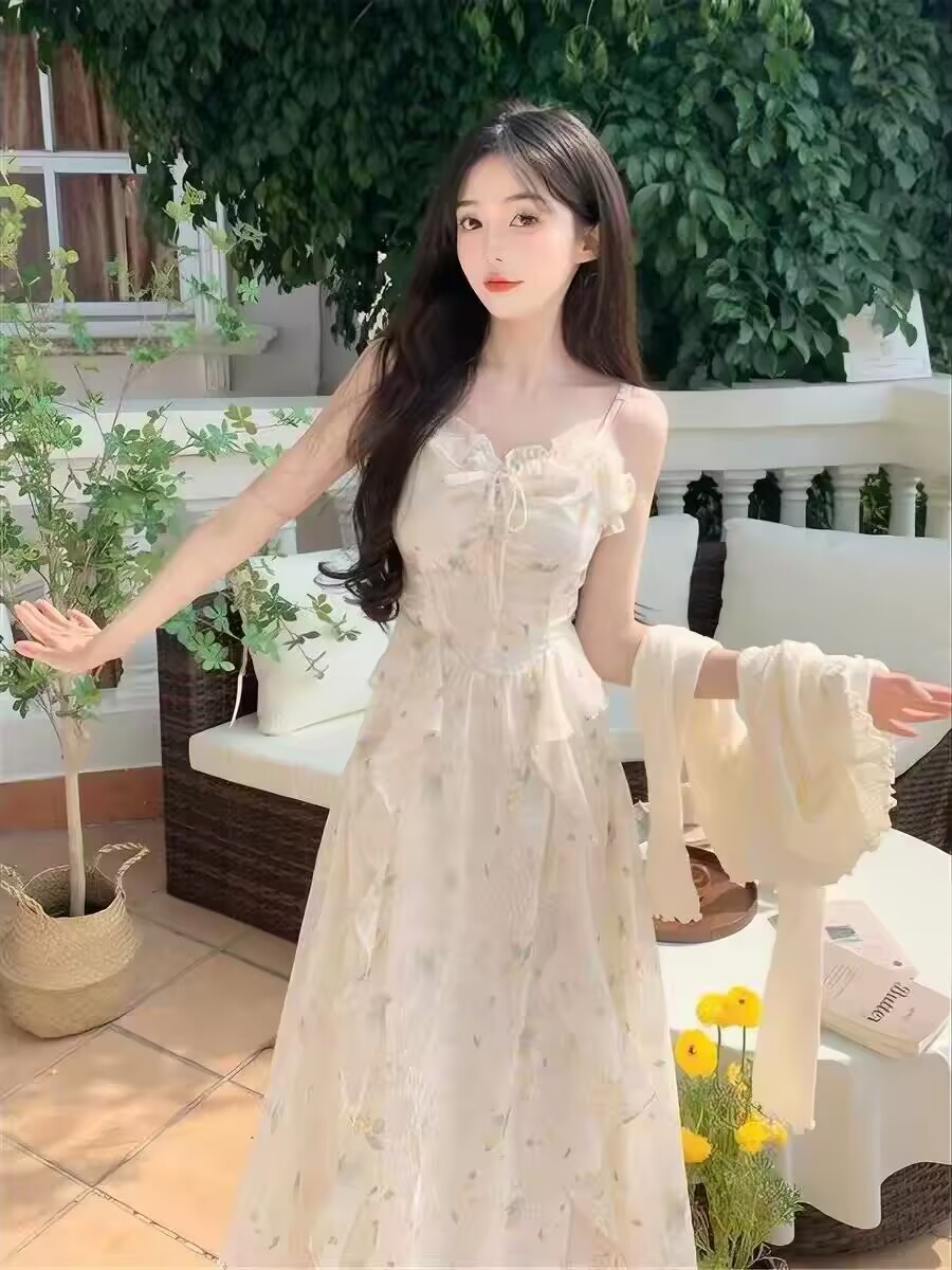 2026 새로운 프랑스식 고급 센스 작은 키 쉬폰 롱 스커트 꽃무늬 슬립 드레스 투피스 슈트 여성 여름