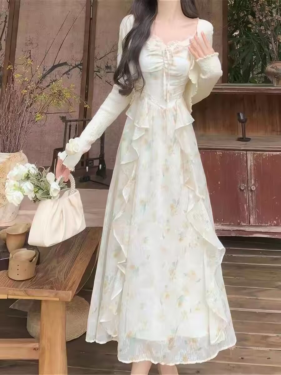 차 휴식 프랑스식 아름다운 꽃무늬 슬립 여성 드레스 이른 봄 여름 품격 고급 센스 허리 수축 길다 치마 세트