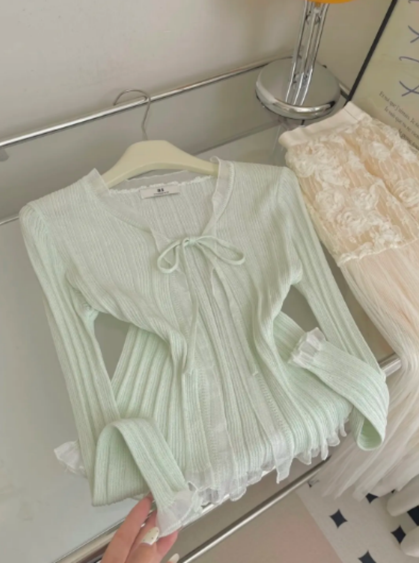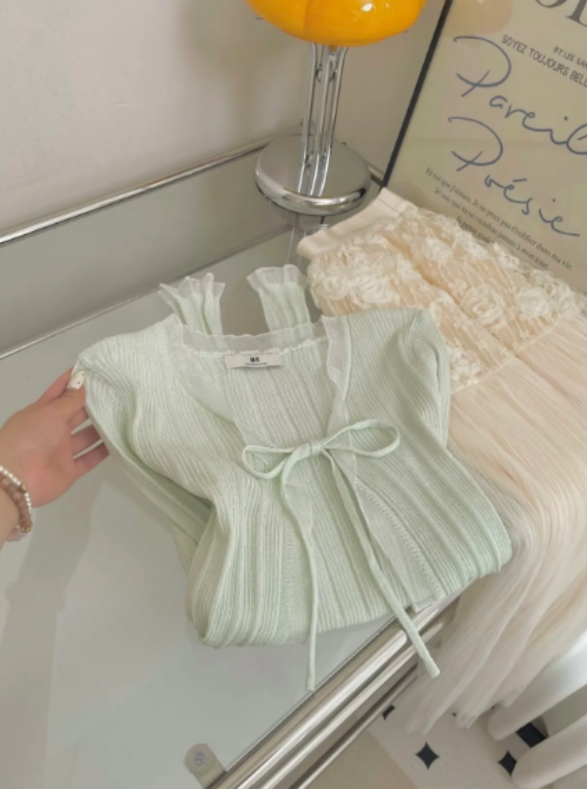 박하 녹색 레이스업 나비 매듭 반팔 셔츠 여성 맨위 작은 키 2026 여름 슈퍼 화재 연령 감소 셔츠