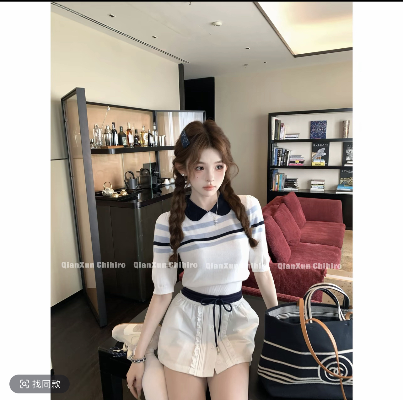 향기로운 향 맞춤 섹션 통기성 흔들다 칼라 반팔 니트 맨위 여성 여름 슬림해 보이는 레이스 반 스커트