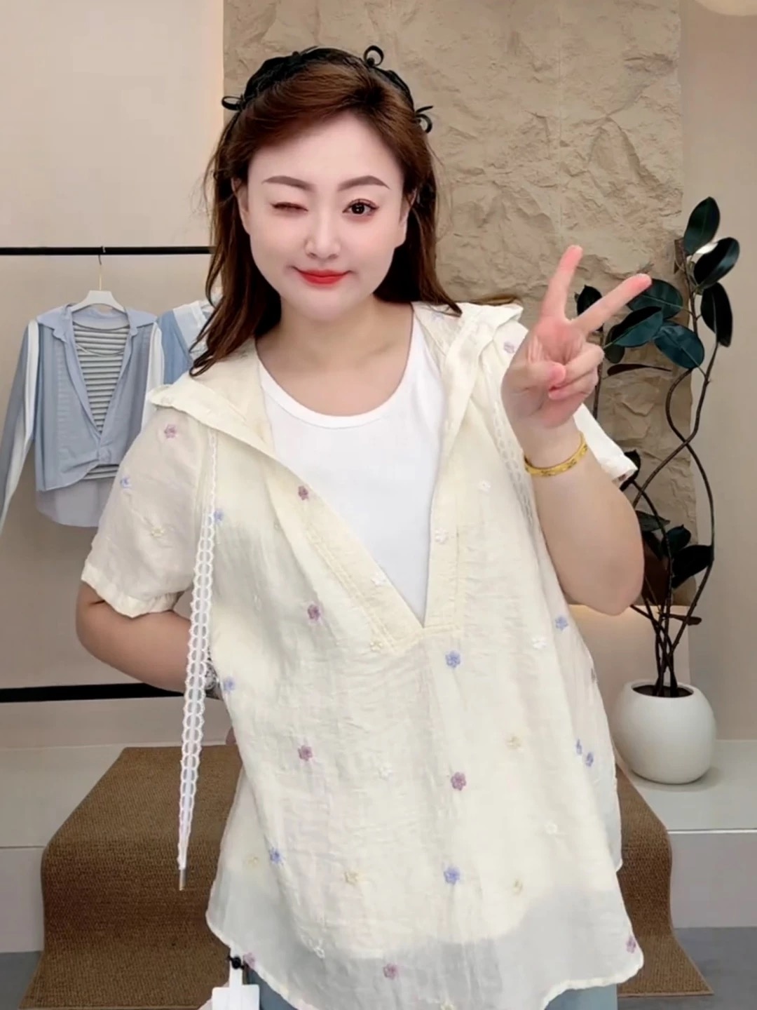 여름 레트로 해변가 휴가 바람 마이크로 ~을 통해 헤일로 염색 여성 셔츠 루즈핏 슬림해 보이는 프릴 자외선 차단 V넥 맨위