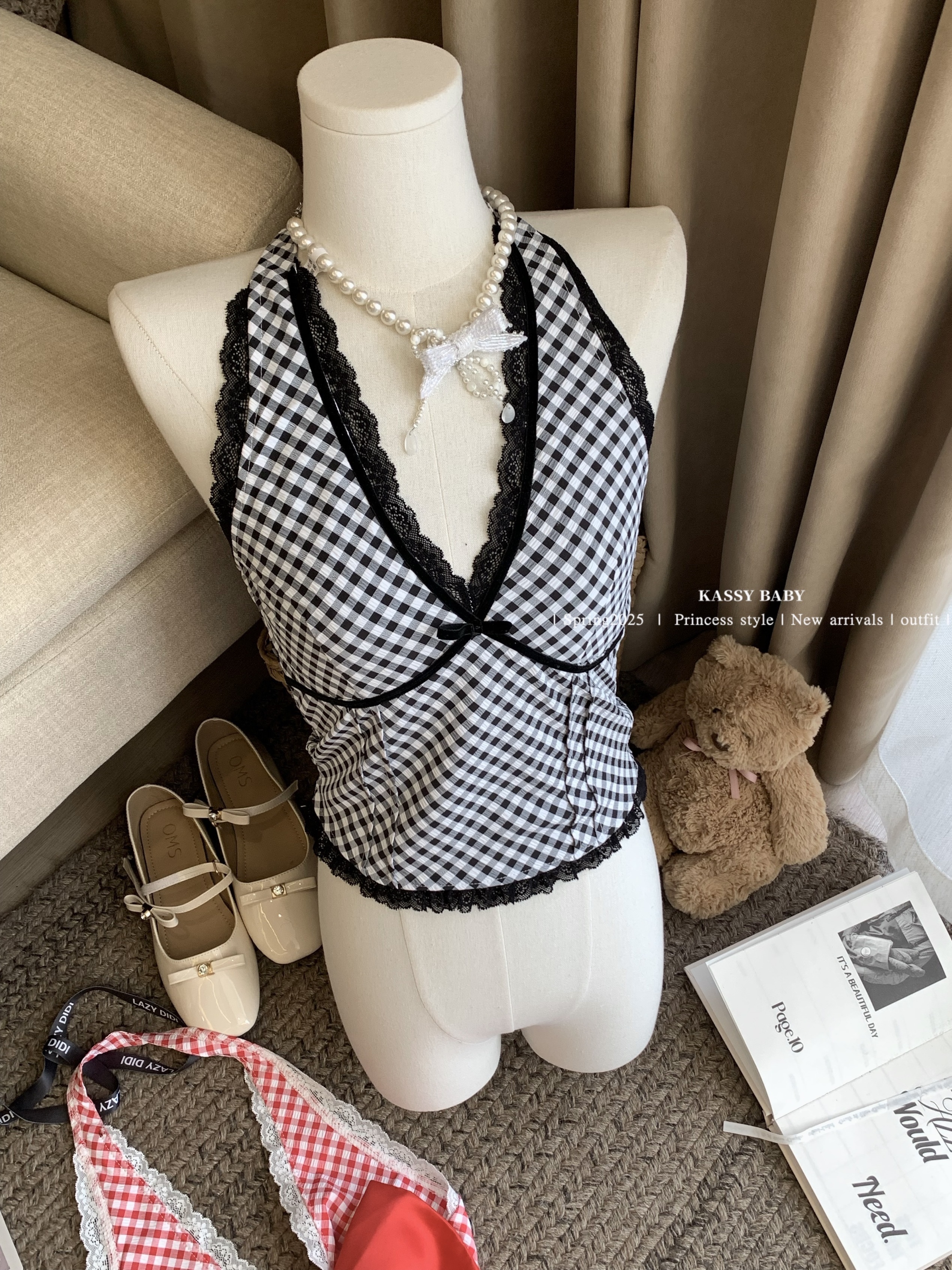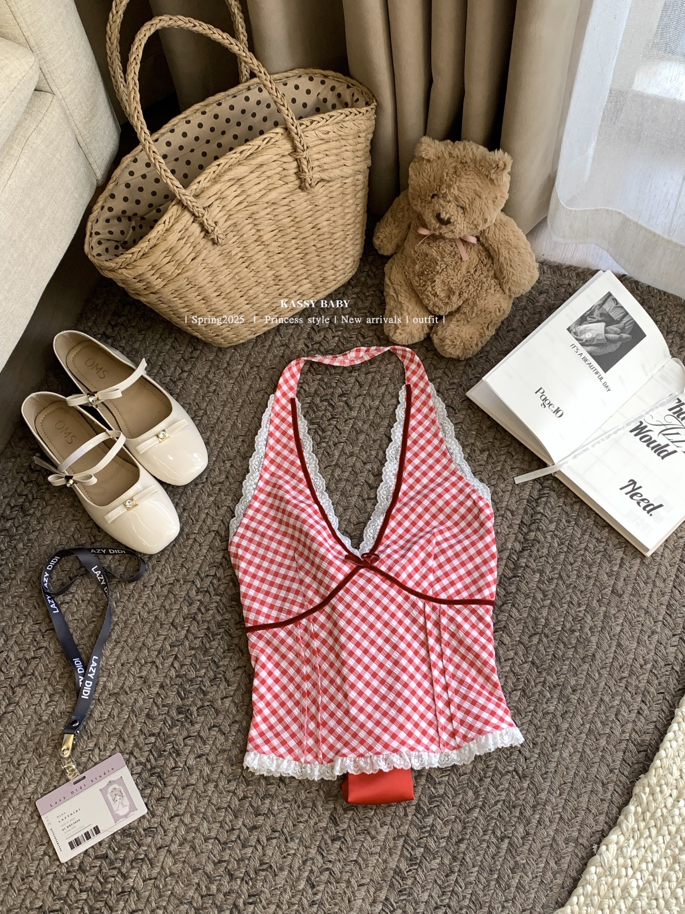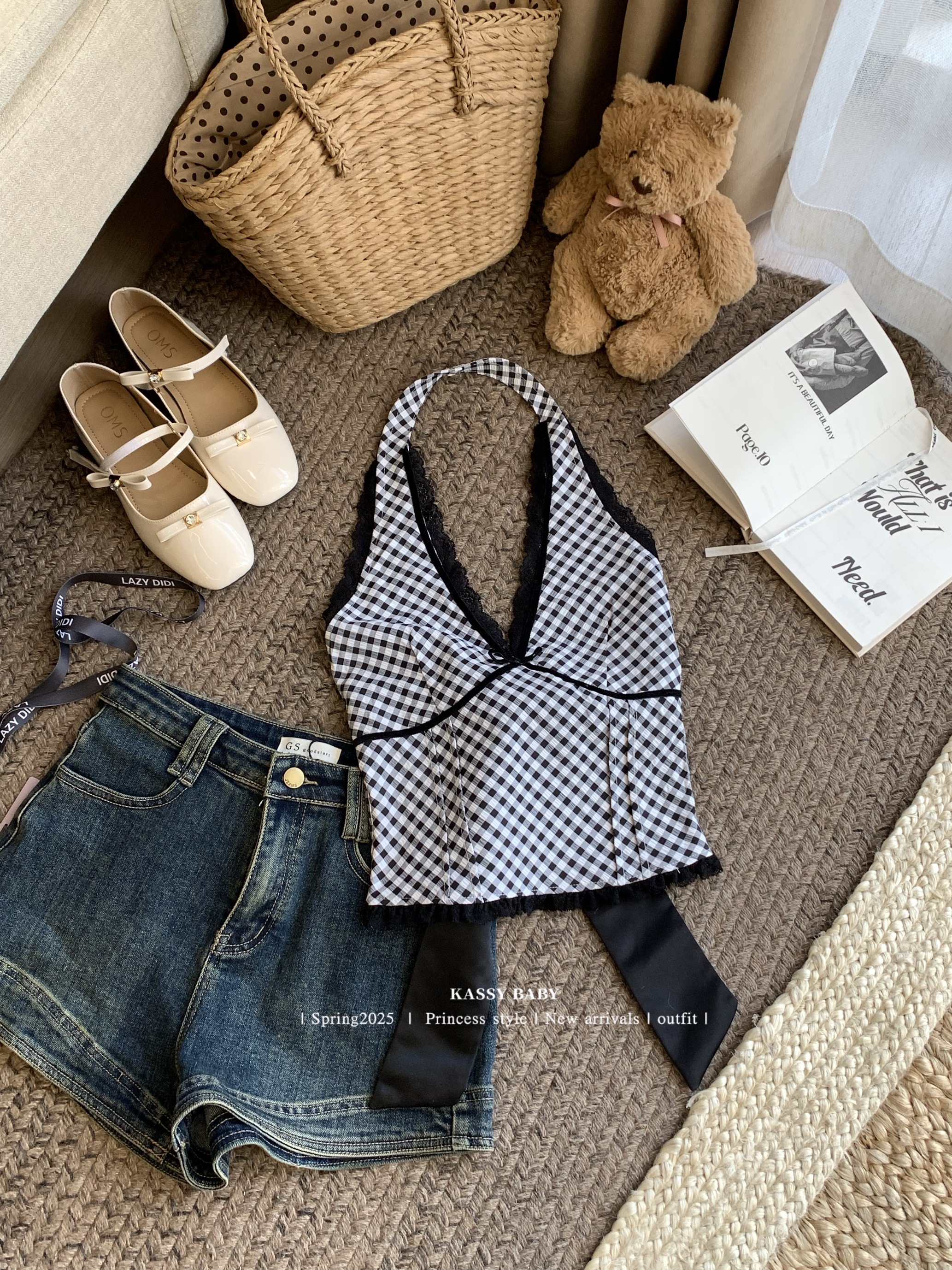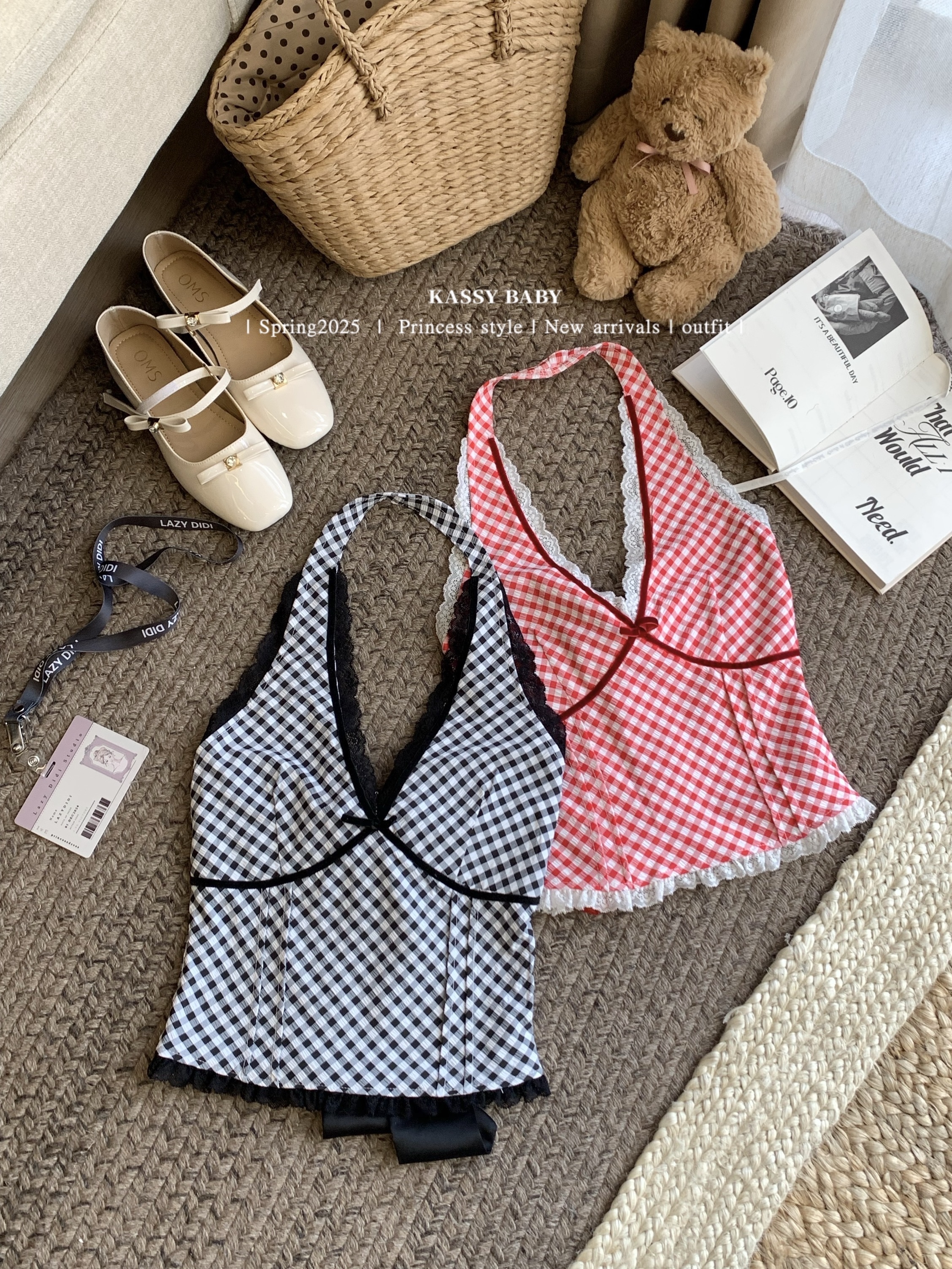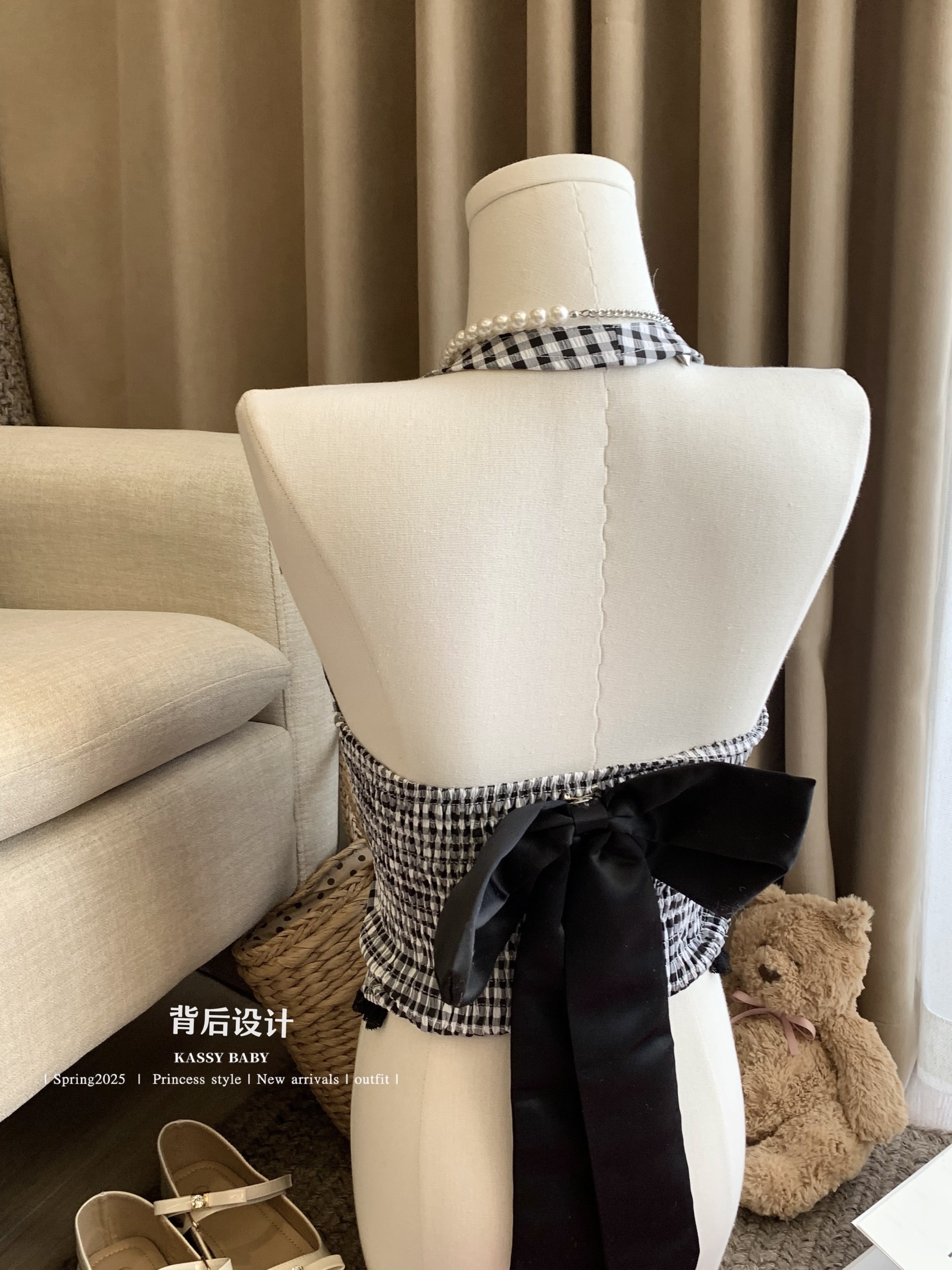실사 한 부서 화이트 티셔츠 여성 긴 소매 얇은 스타일 비스듬한 어깨 의류 황색 체크무늬 스트랩 반신 스커트 여름