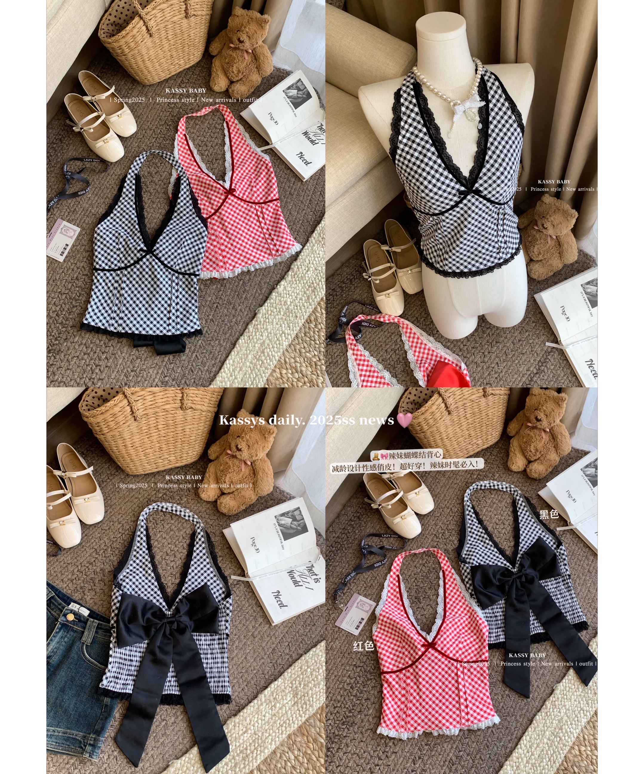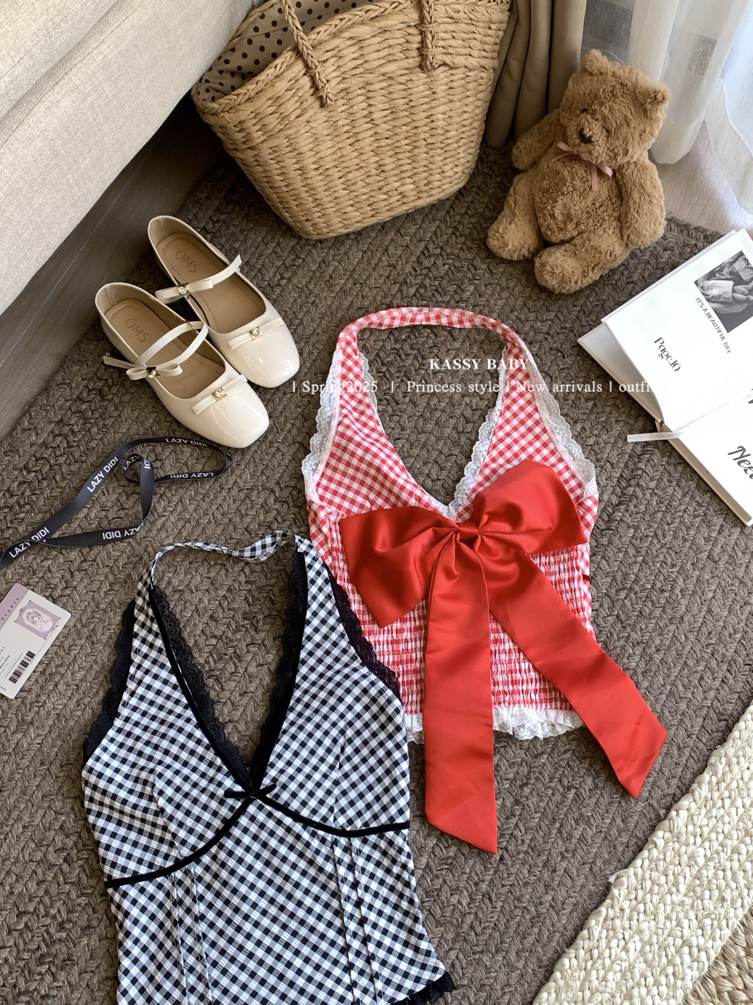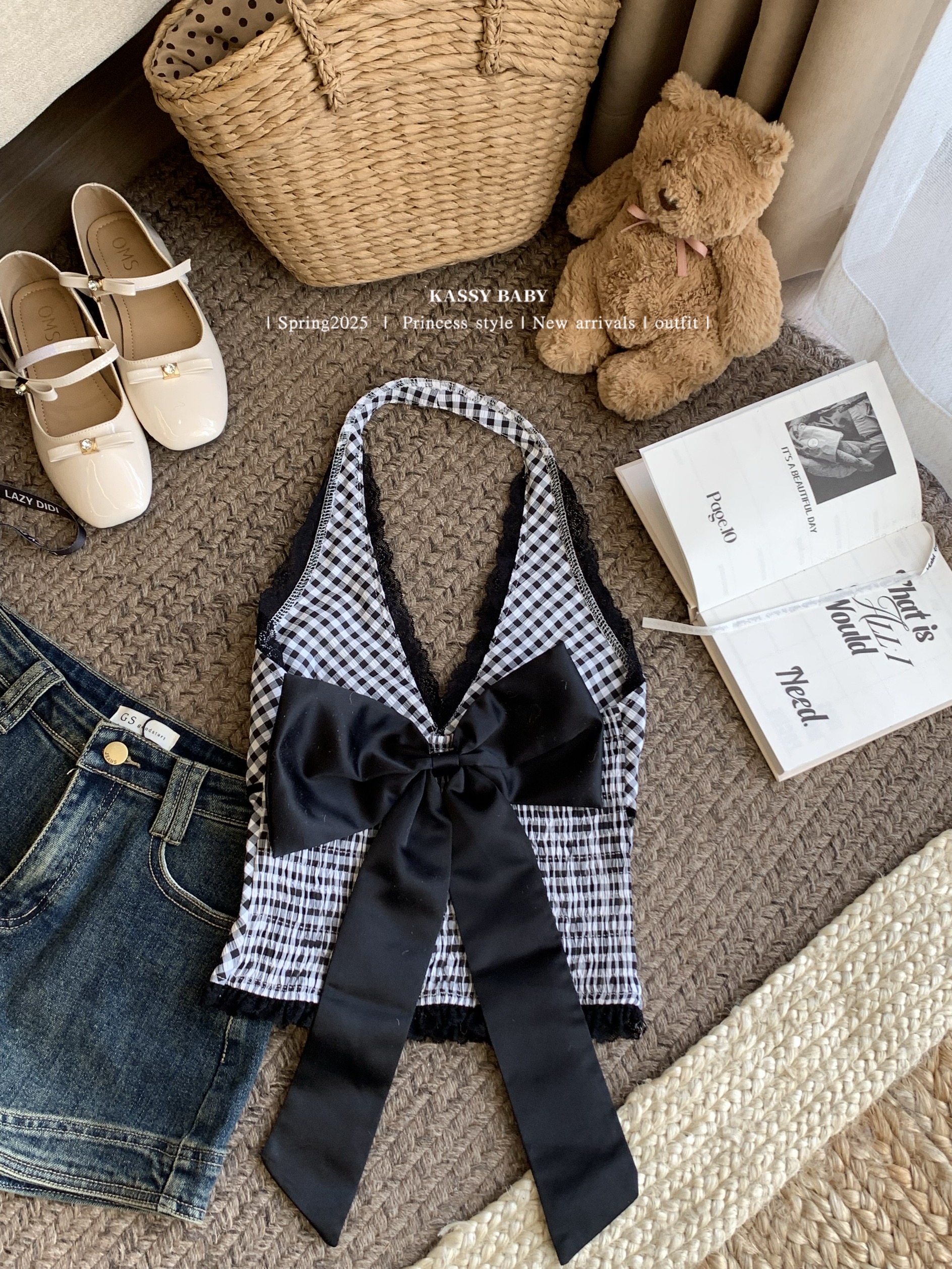 실사 한 부서 회색 프릴 나비 매듭 반팔 티셔츠 불규칙 체크무늬 반 스커트