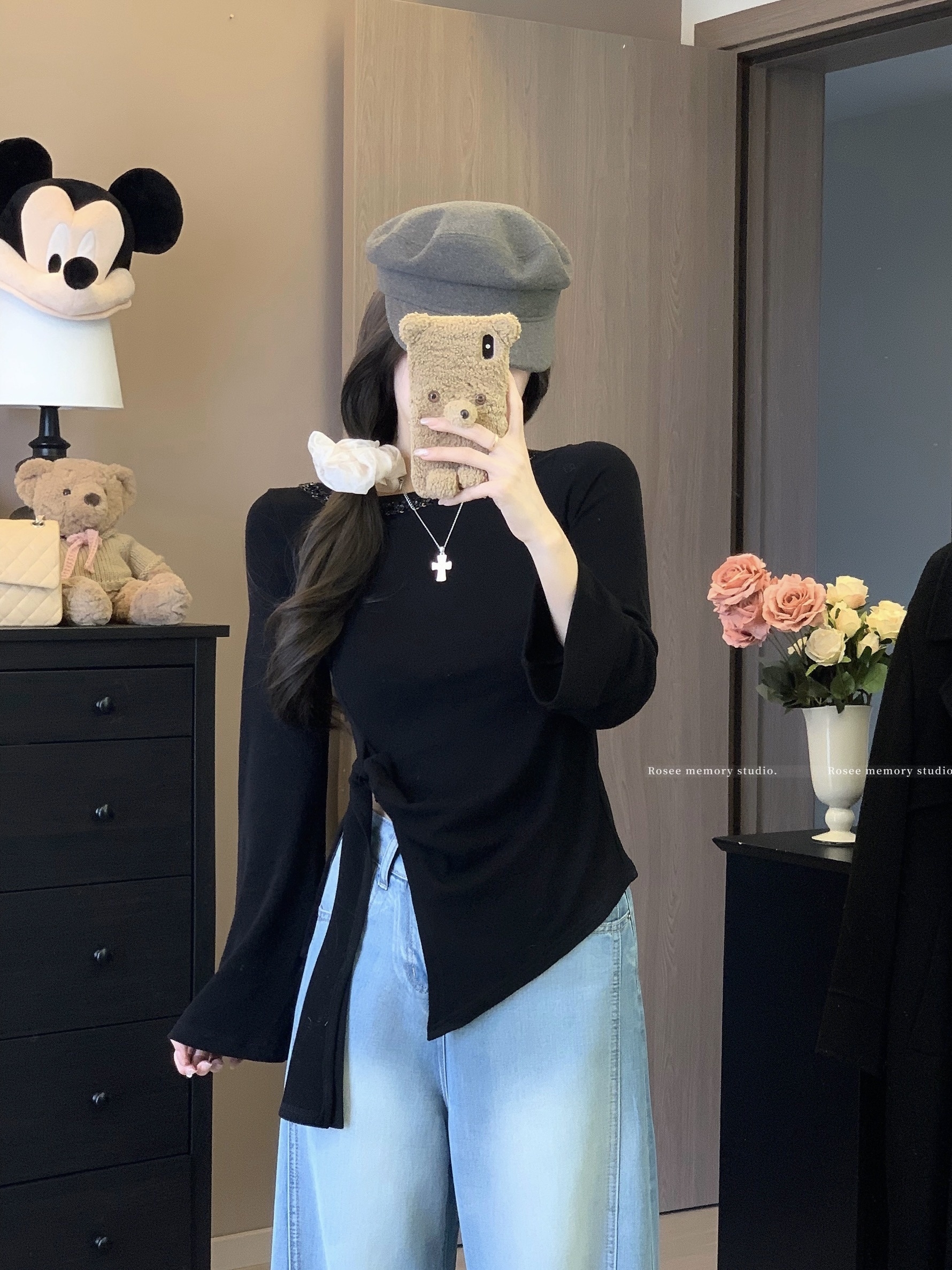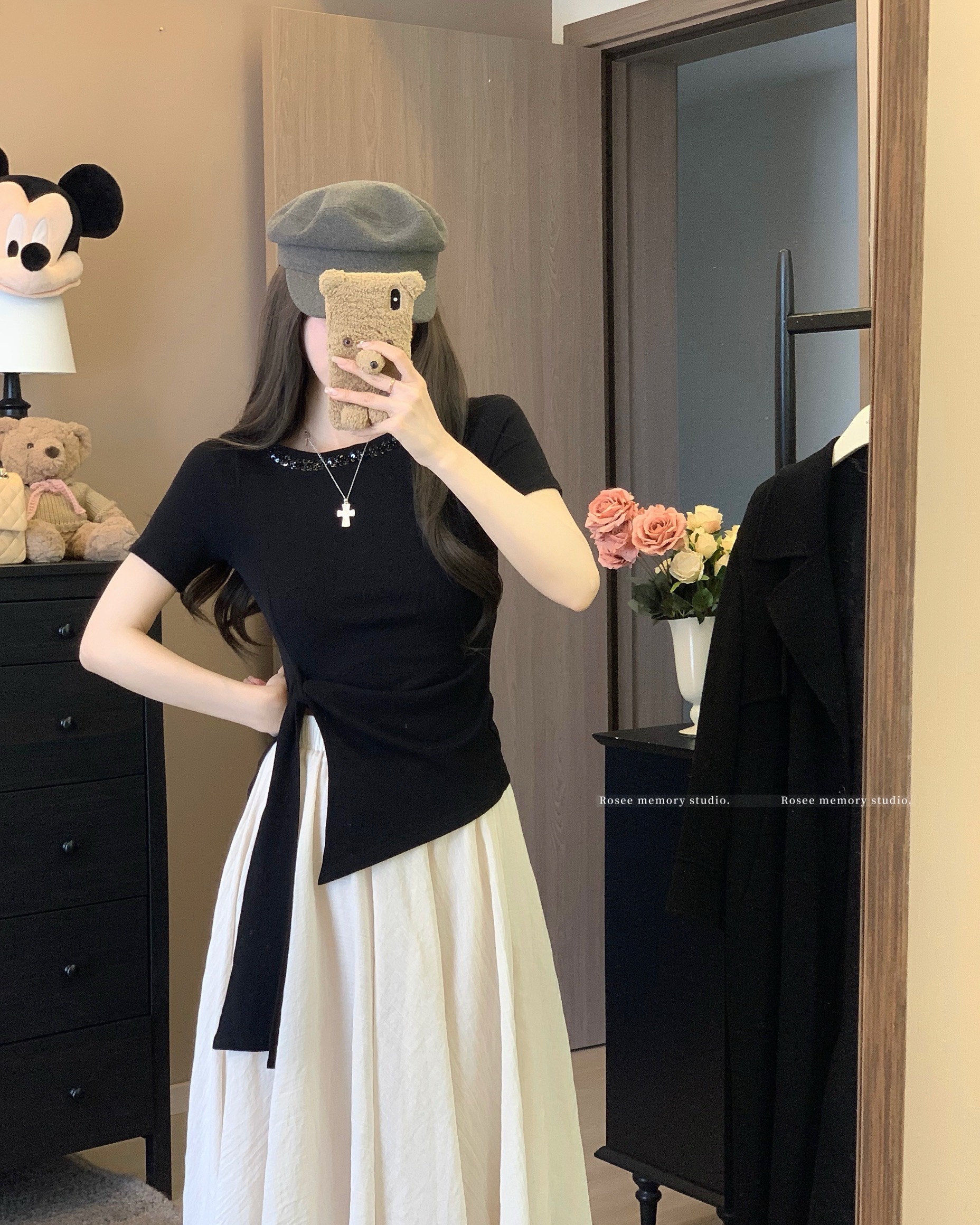 실사 한 부서 회색 프릴 나비 매듭 반팔 티셔츠 불규칙 체크무늬 반 스커트