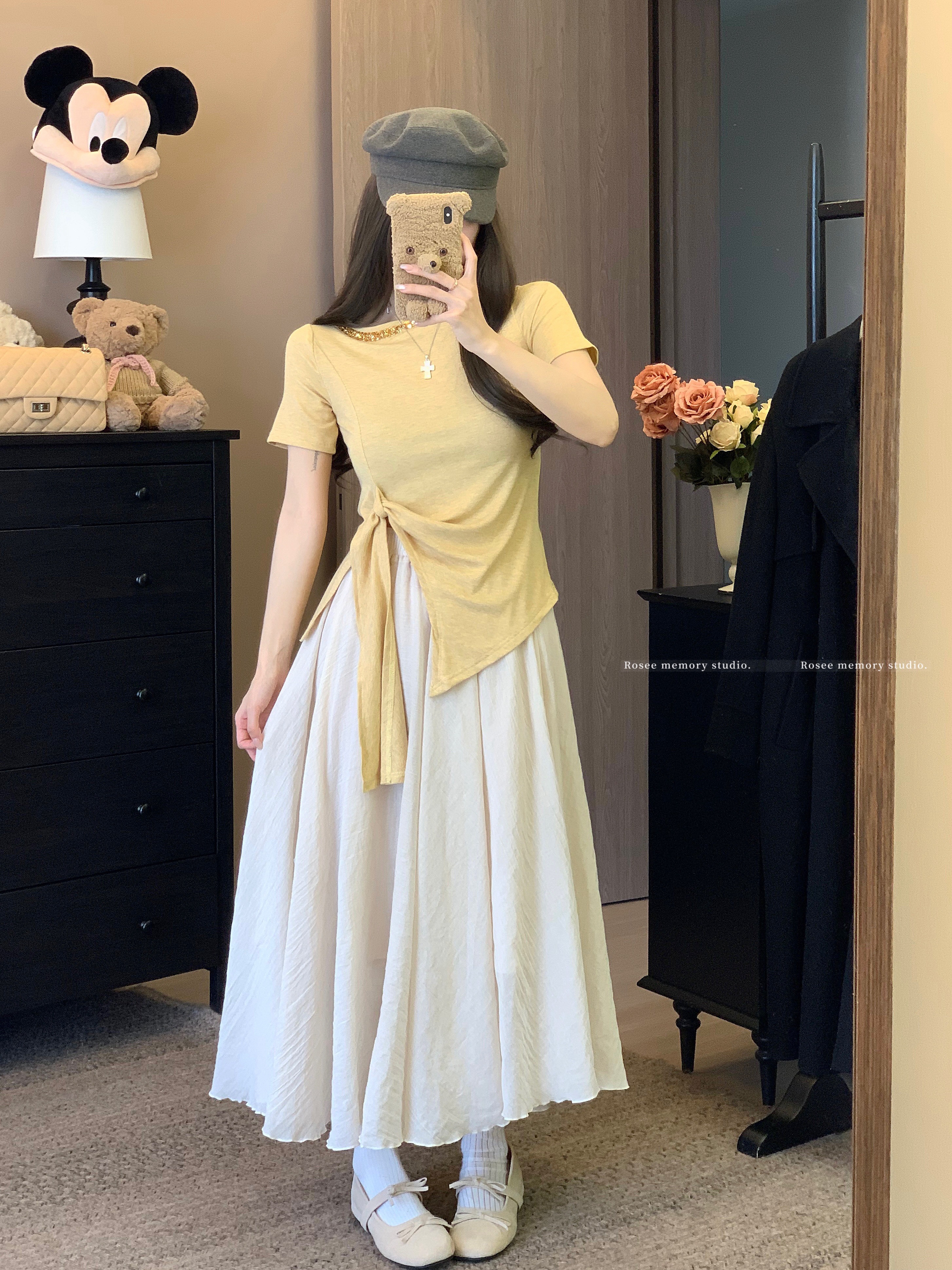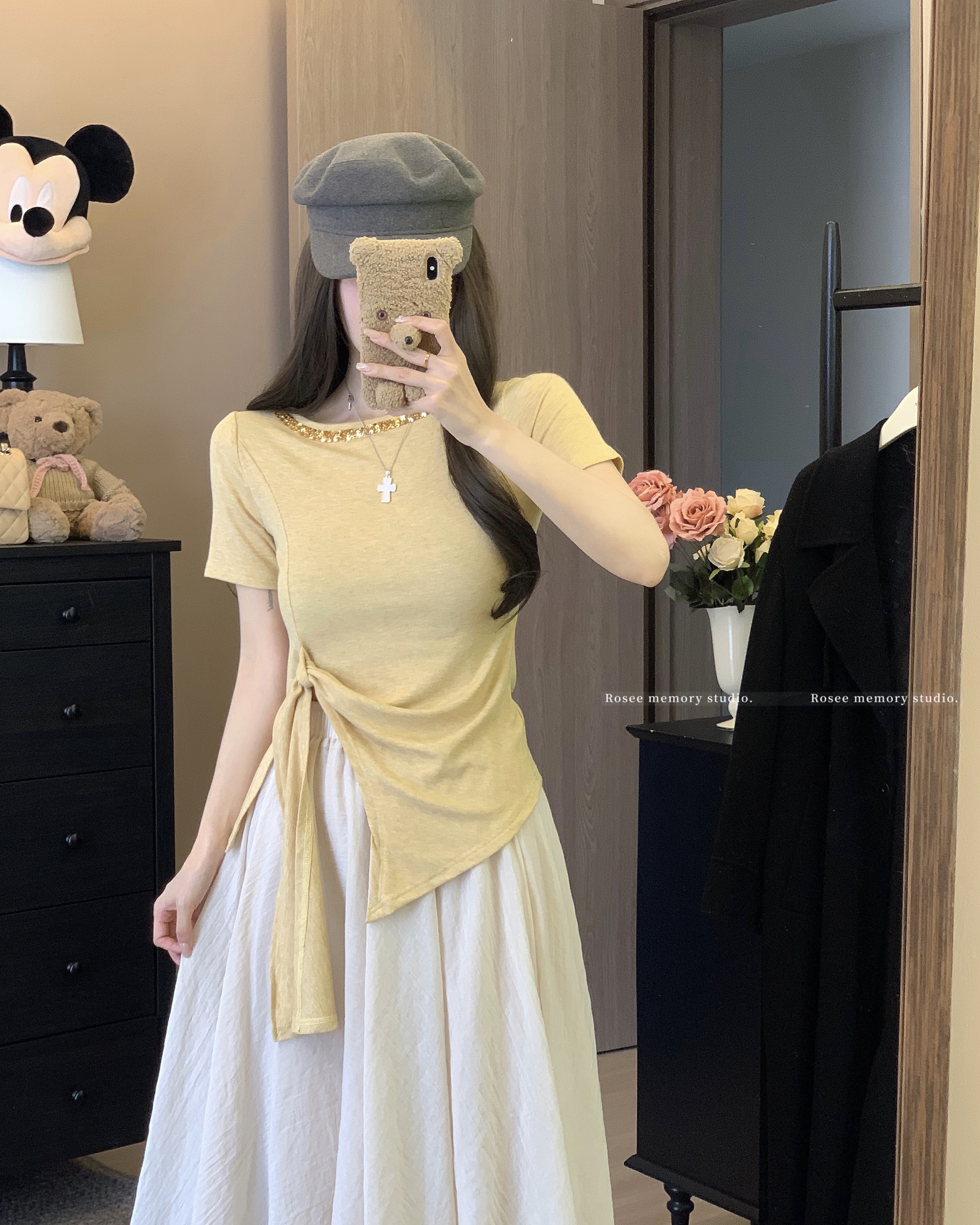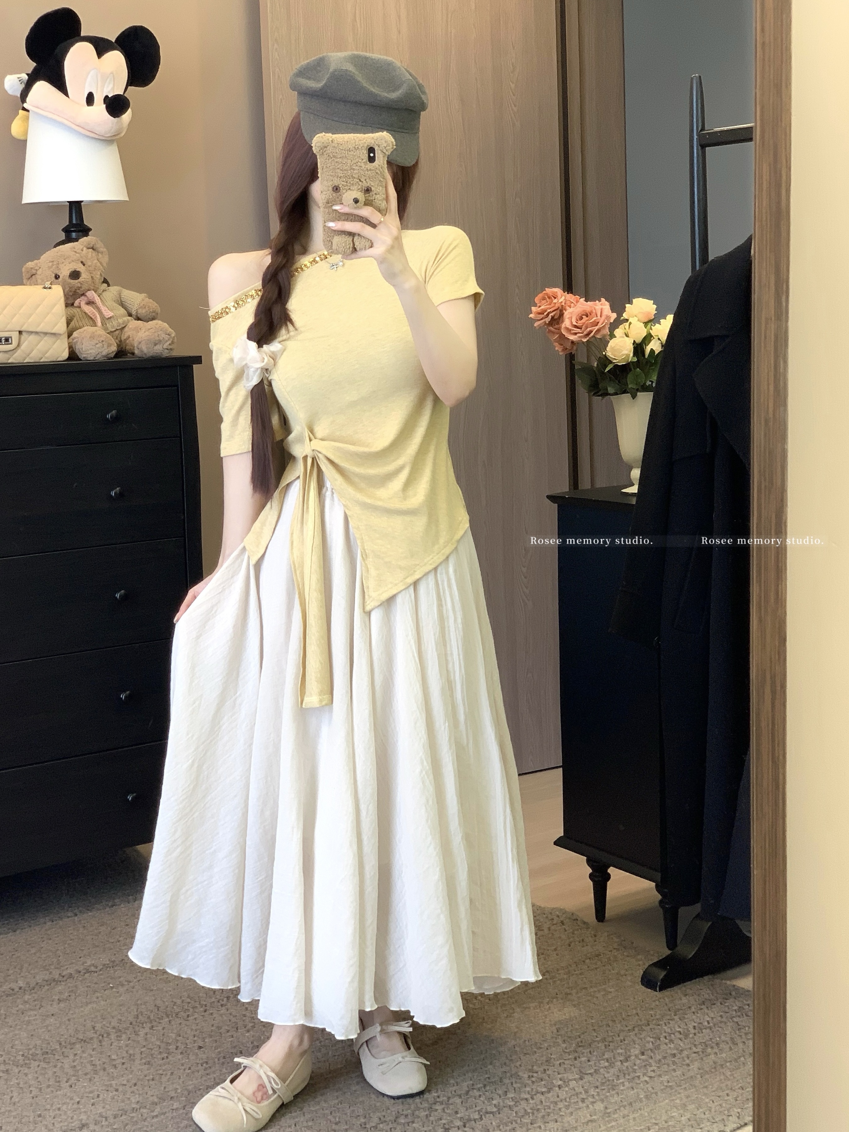 실사 한 부서 화이트 티셔츠 여성 긴 소매 얇은 스타일 비스듬한 어깨 의류 황색 체크무늬 스트랩 반신 스커트 여름