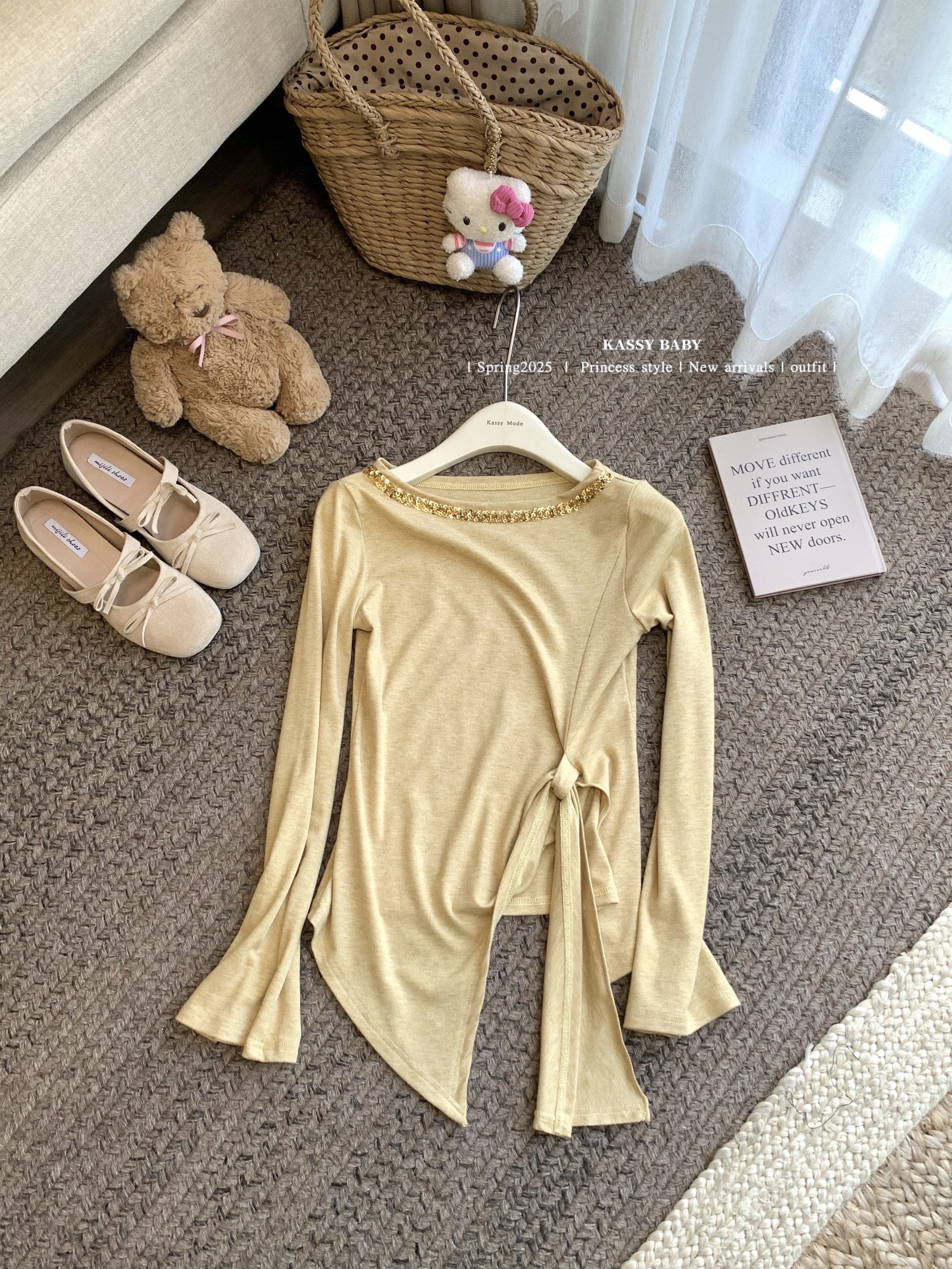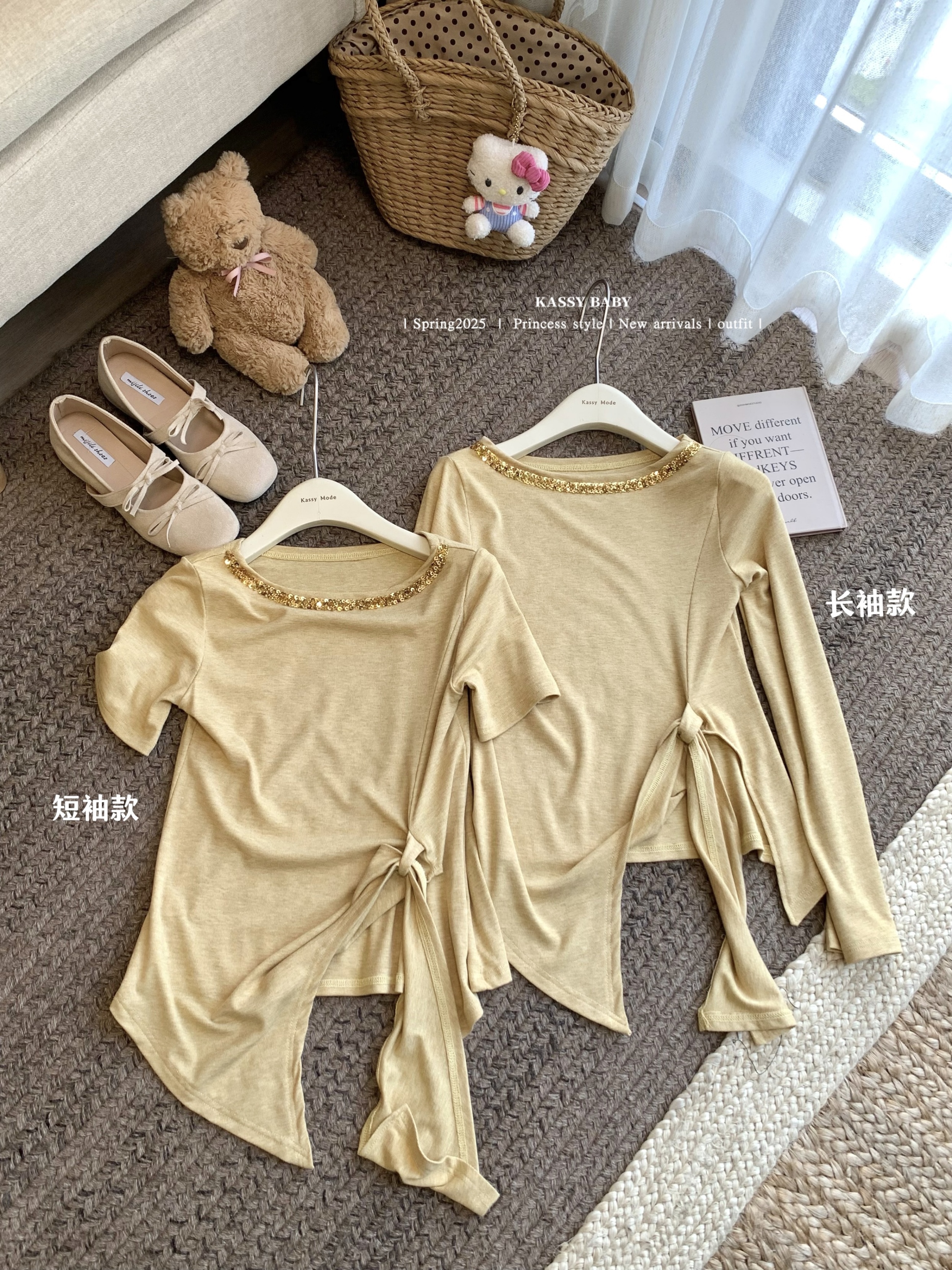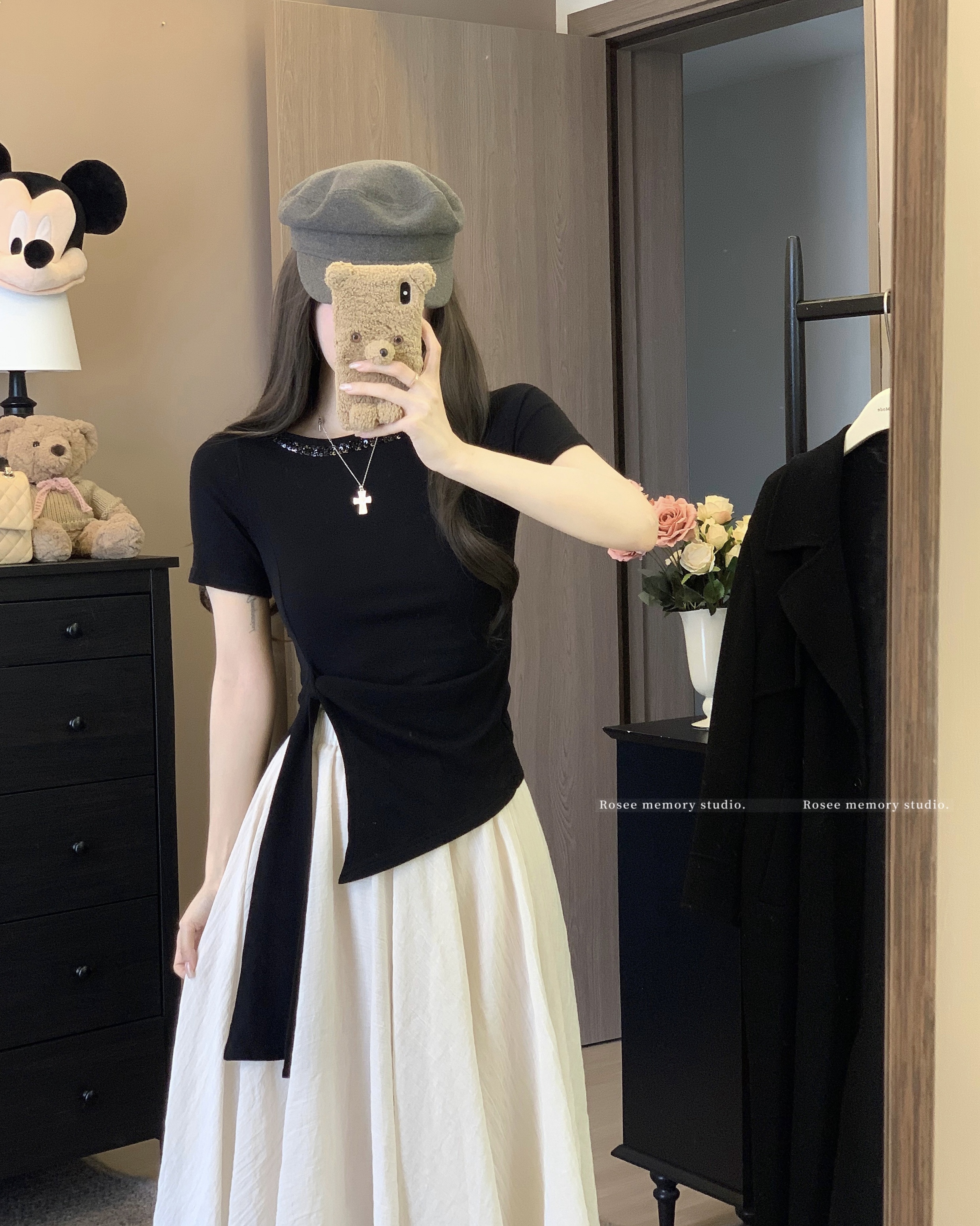 실사 한 부서 화이트 티셔츠 여성 긴 소매 얇은 스타일 비스듬한 어깨 의류 황색 체크무늬 스트랩 반신 스커트 여름