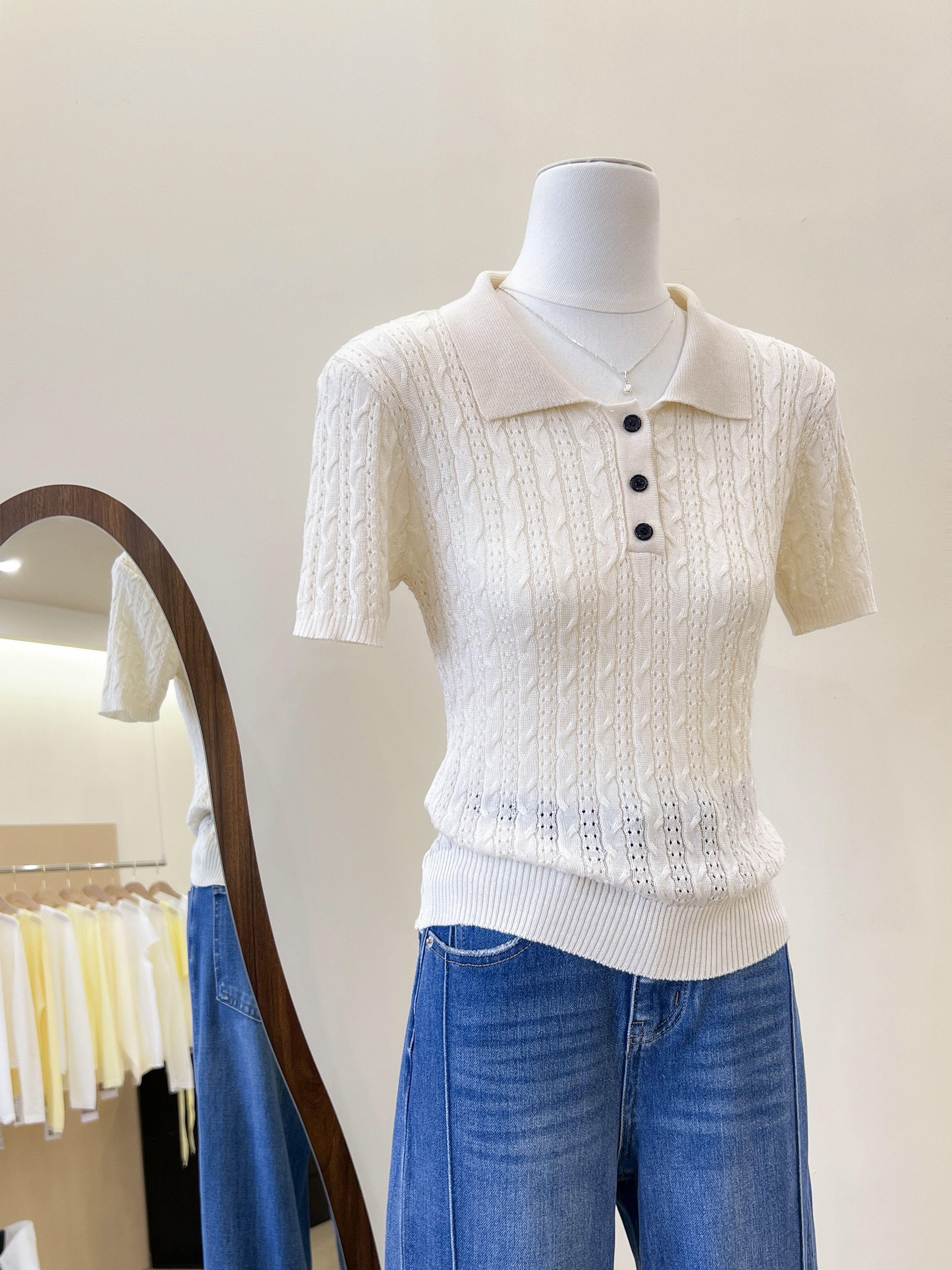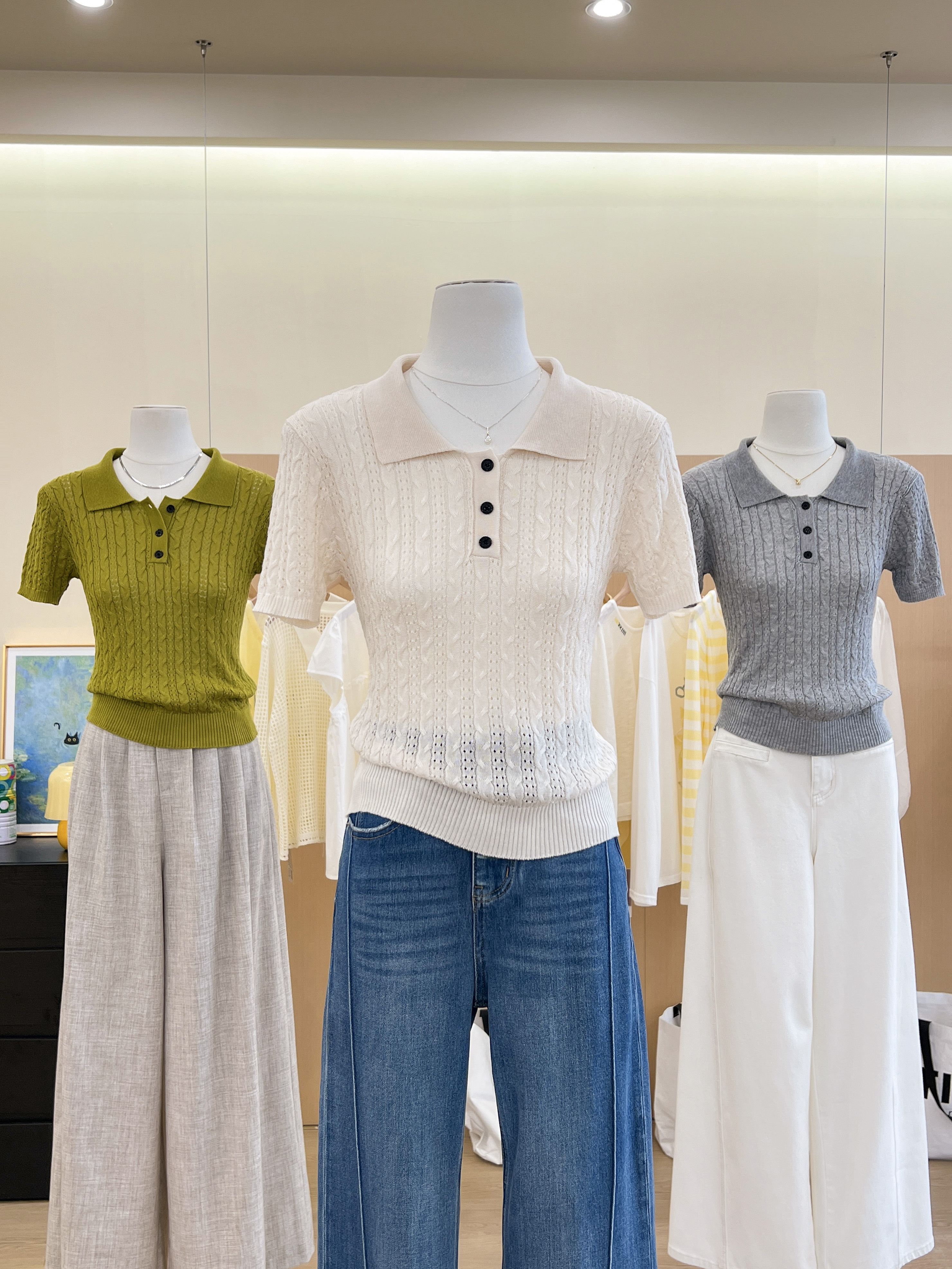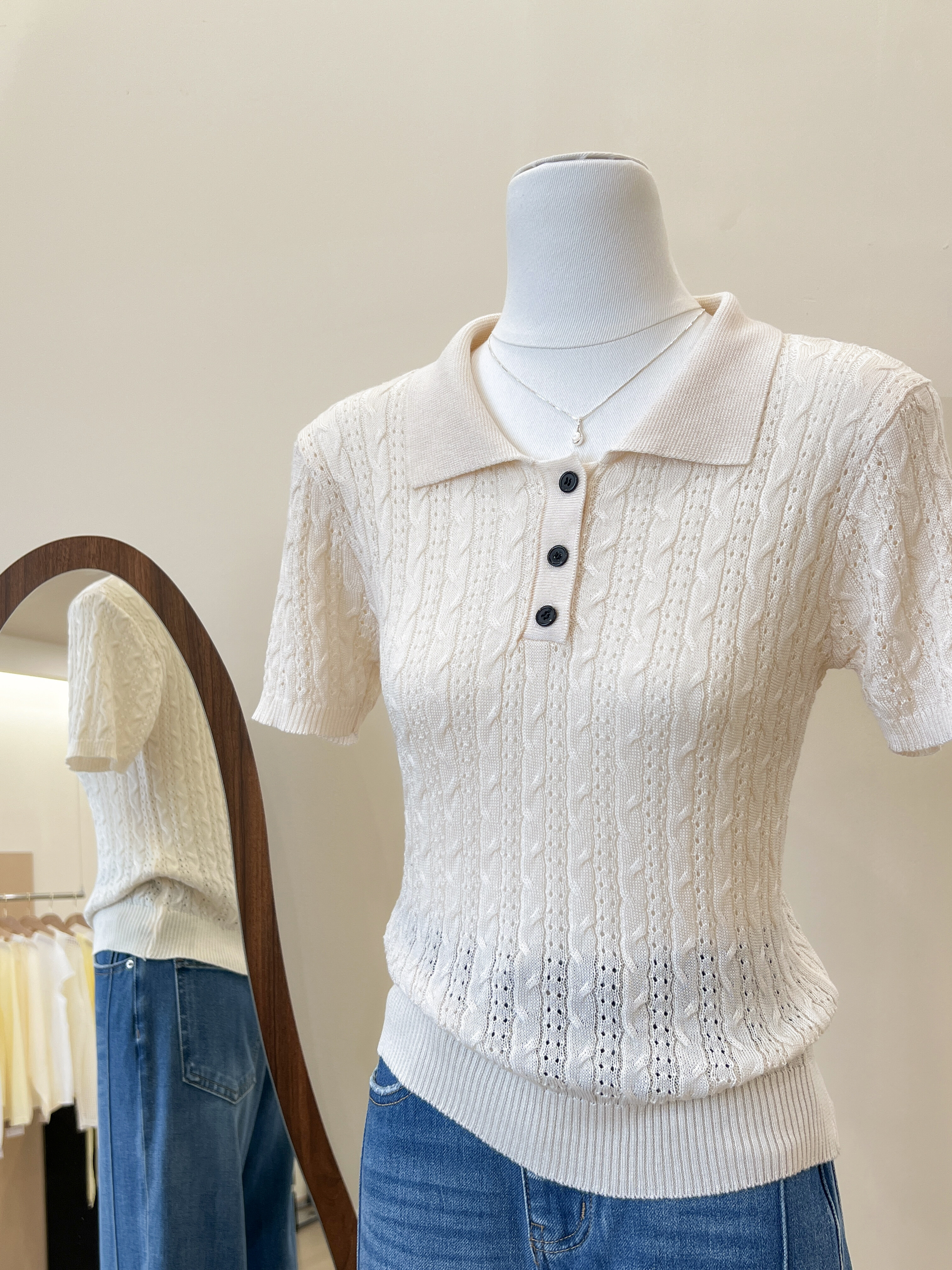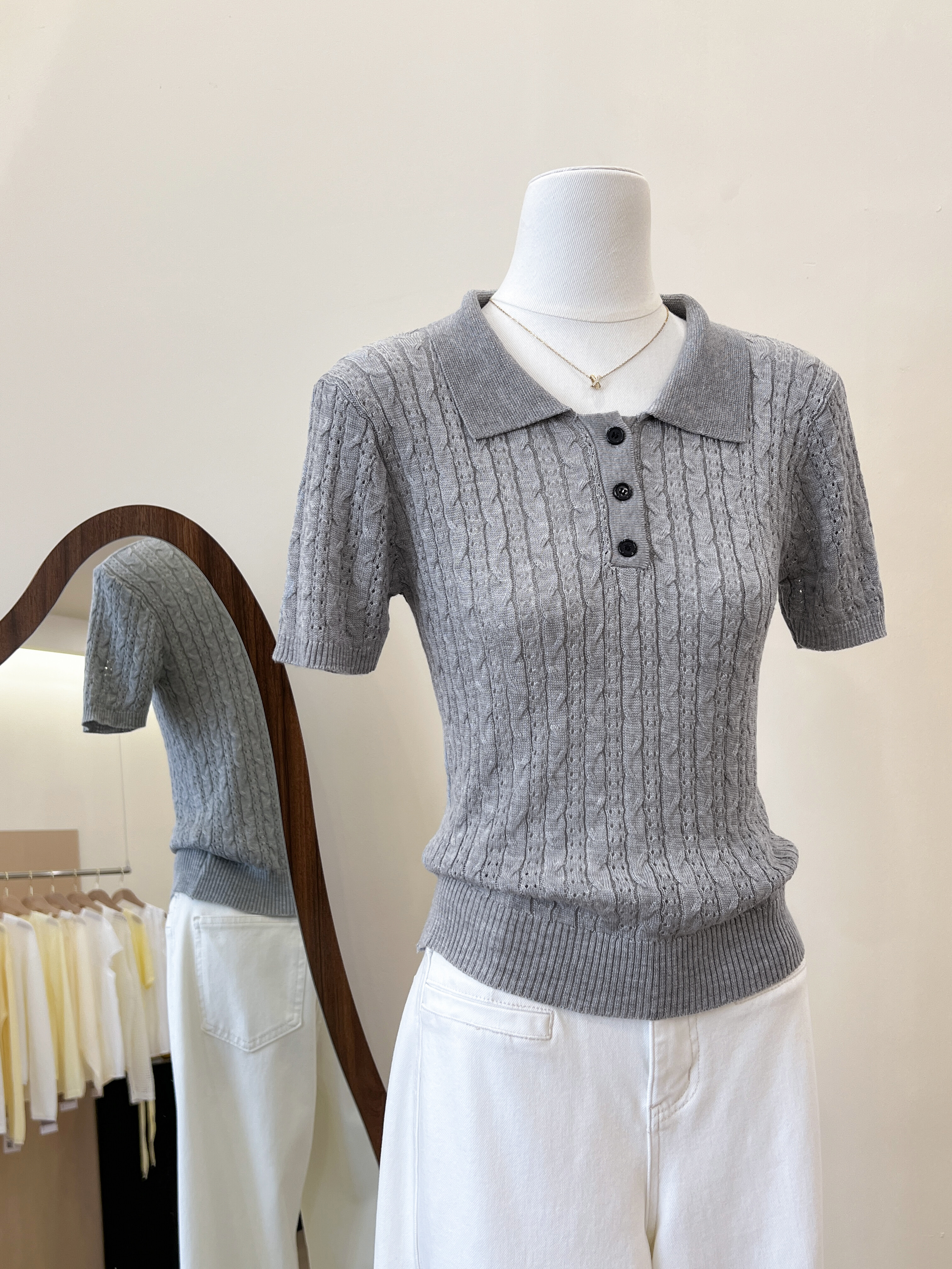 실사 마 무늬 폴로 칼라 반팔 니트 스웨터 여성 2026 봄 여름 새로운 반 개방 버클 몸매 가꾸기 슬림해 보이는 맨위