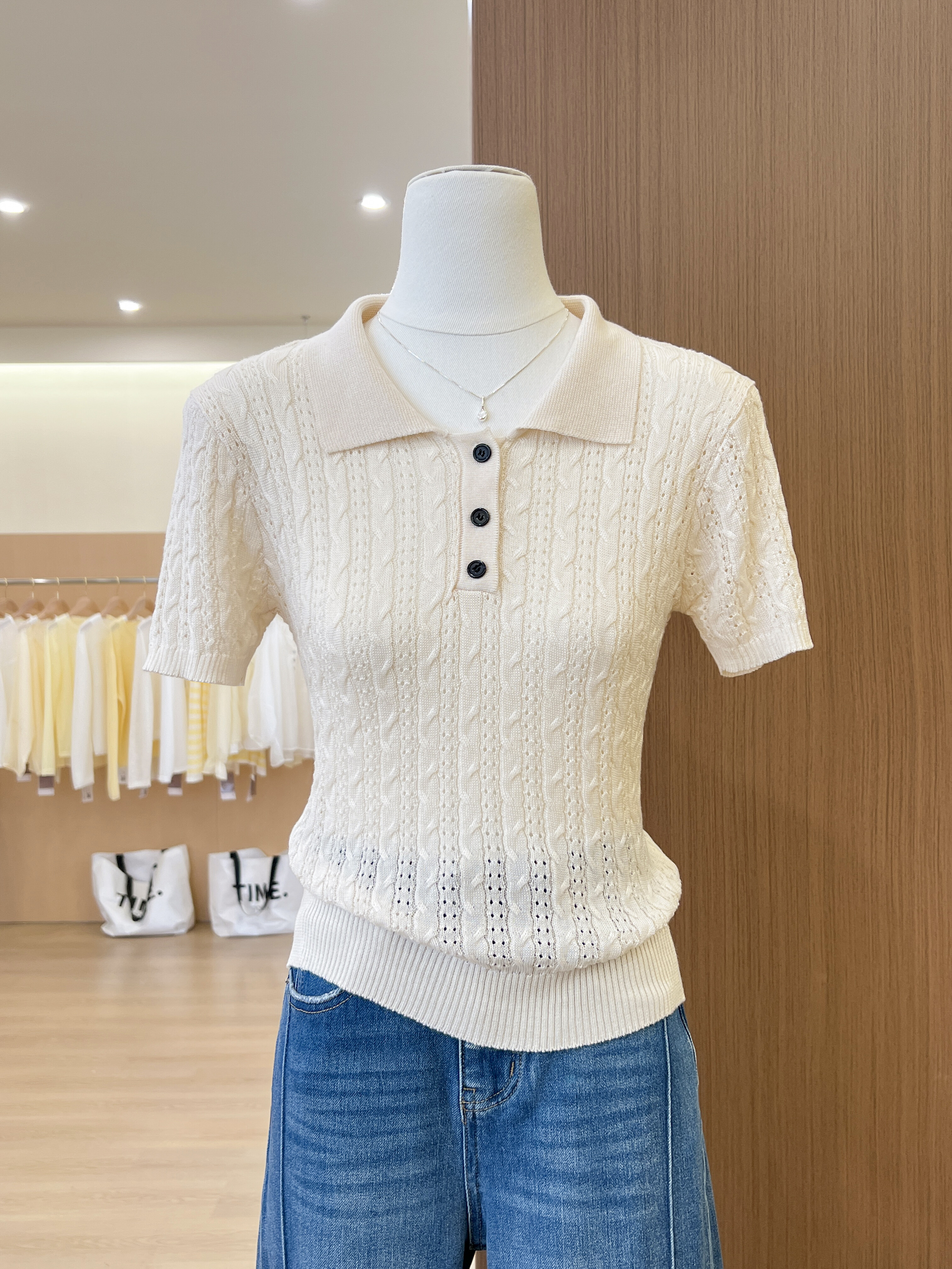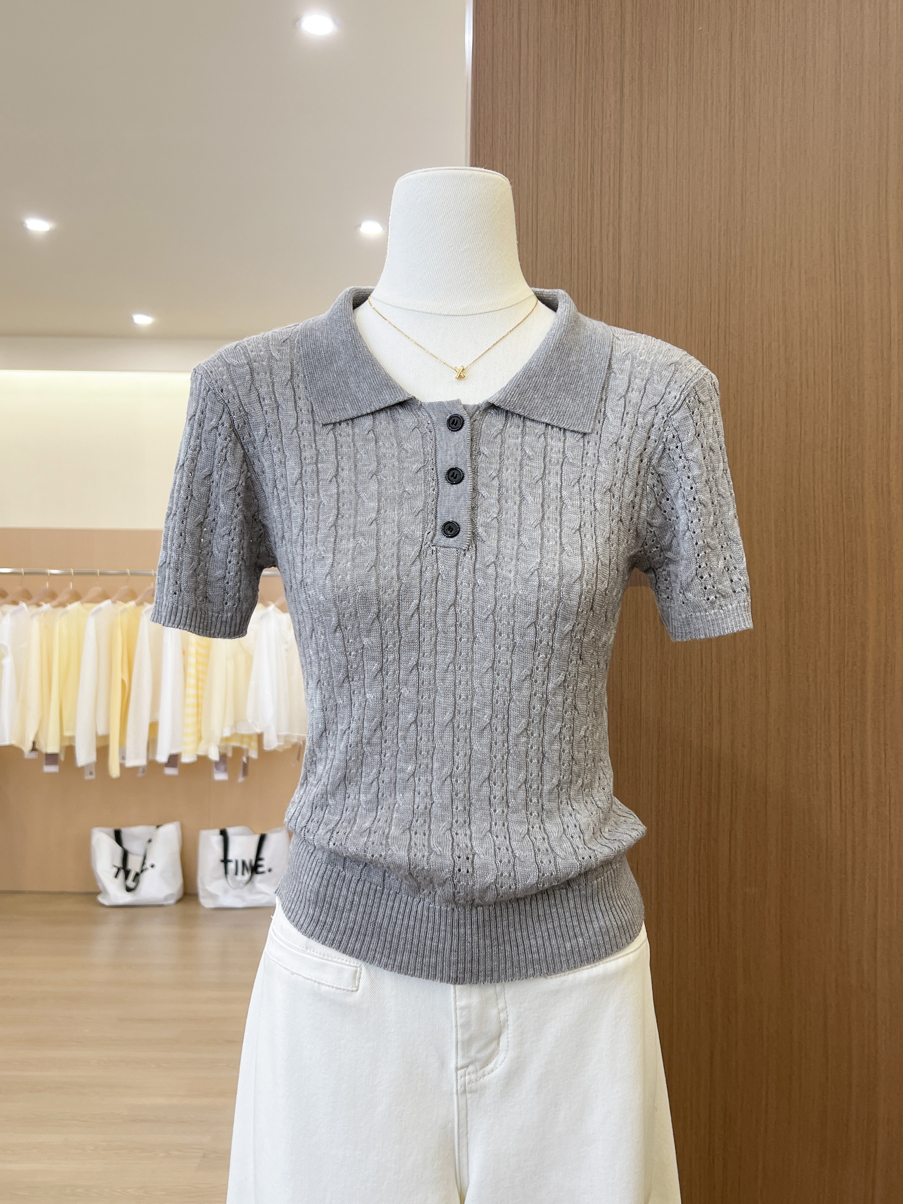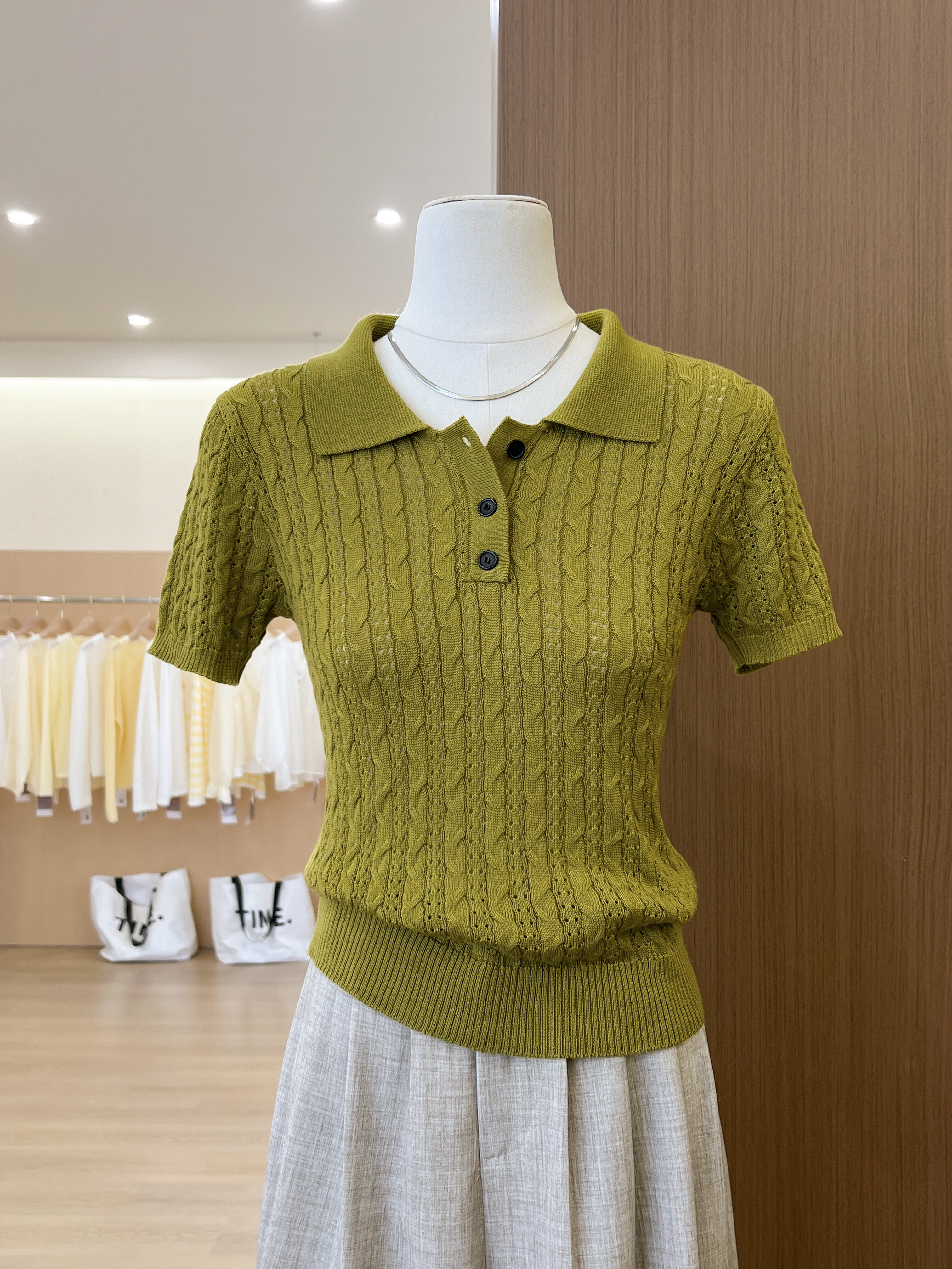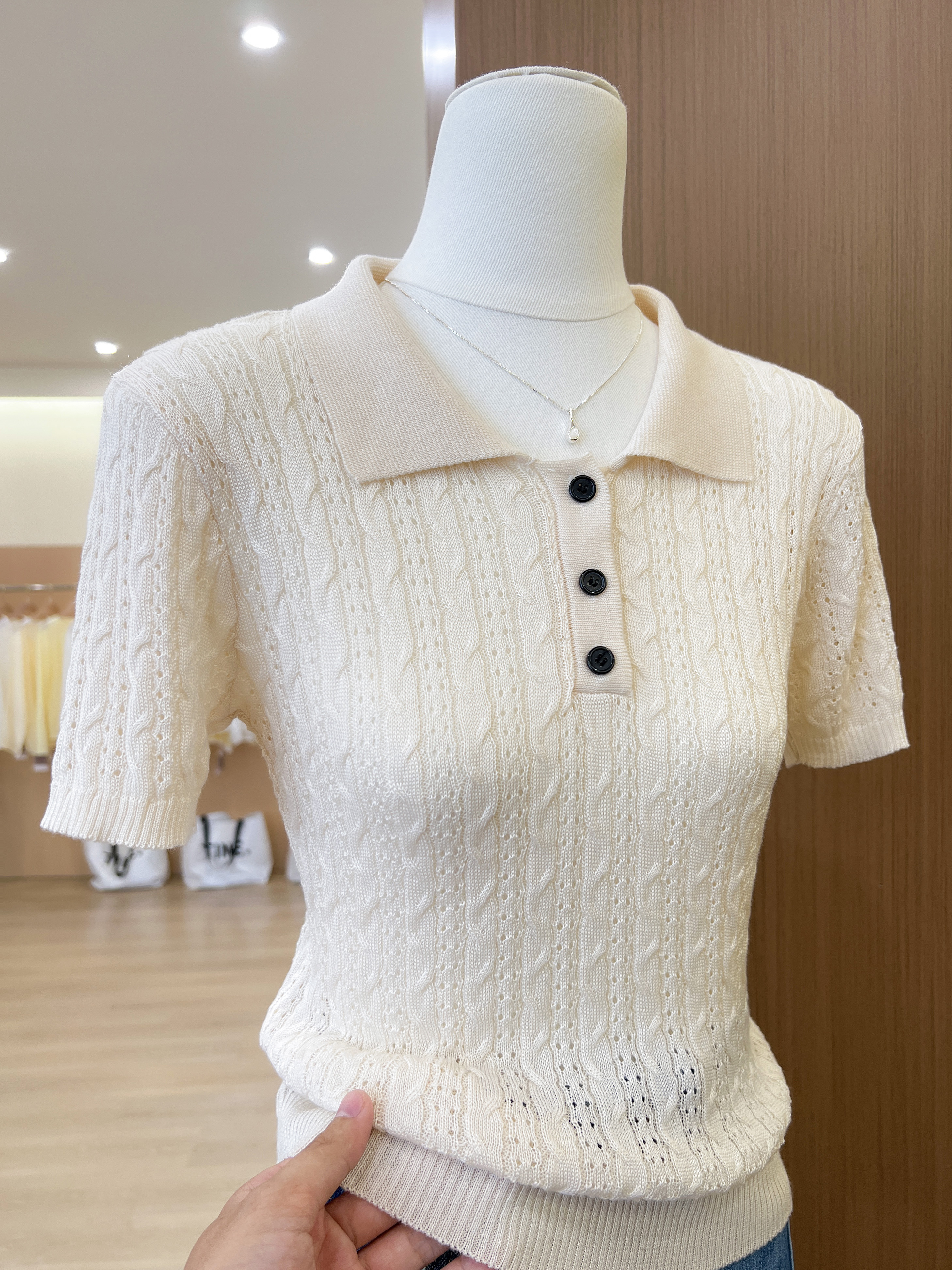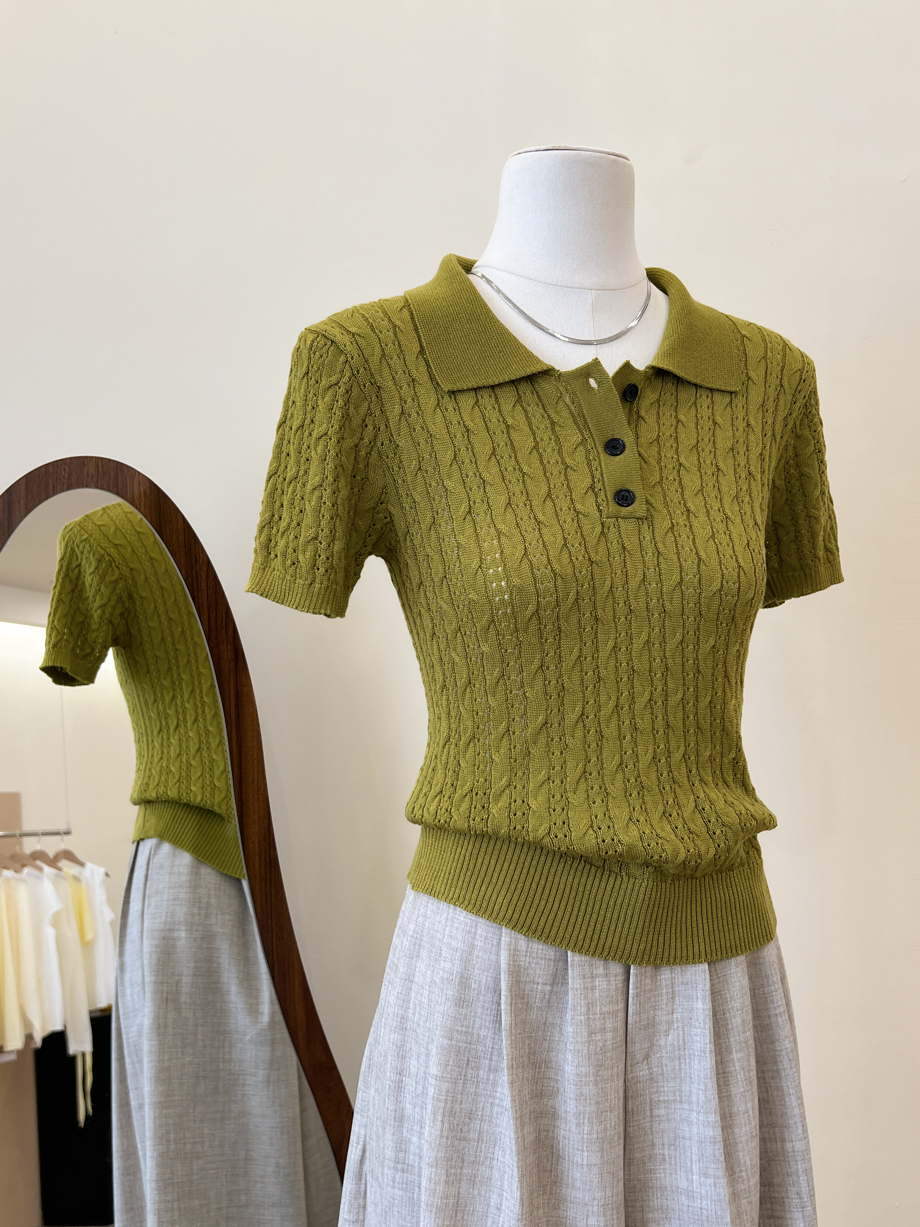 실사 마 무늬 폴로 칼라 반팔 니트 스웨터 여성 2026 봄 여름 새로운 반 개방 버클 몸매 가꾸기 슬림해 보이는 맨위