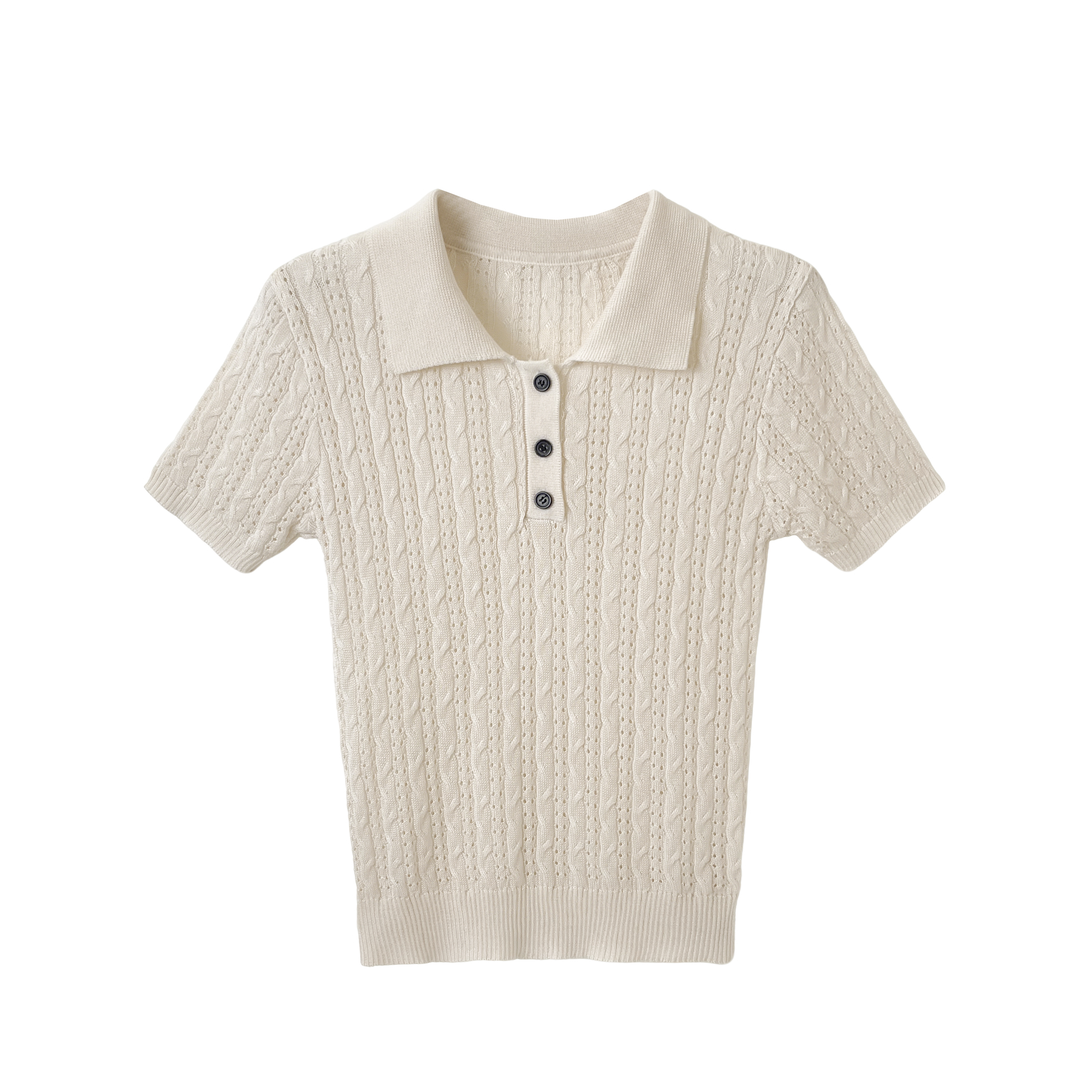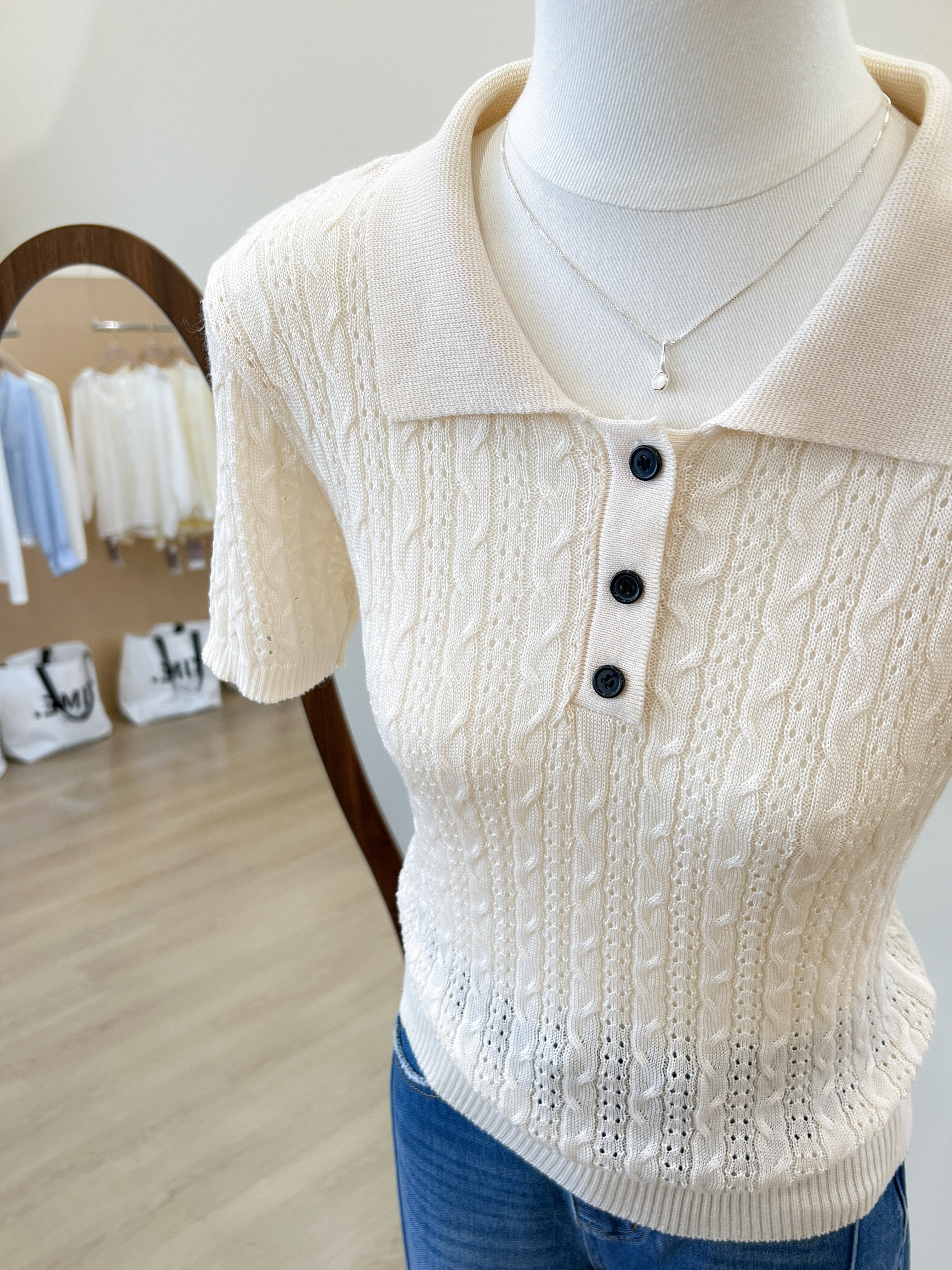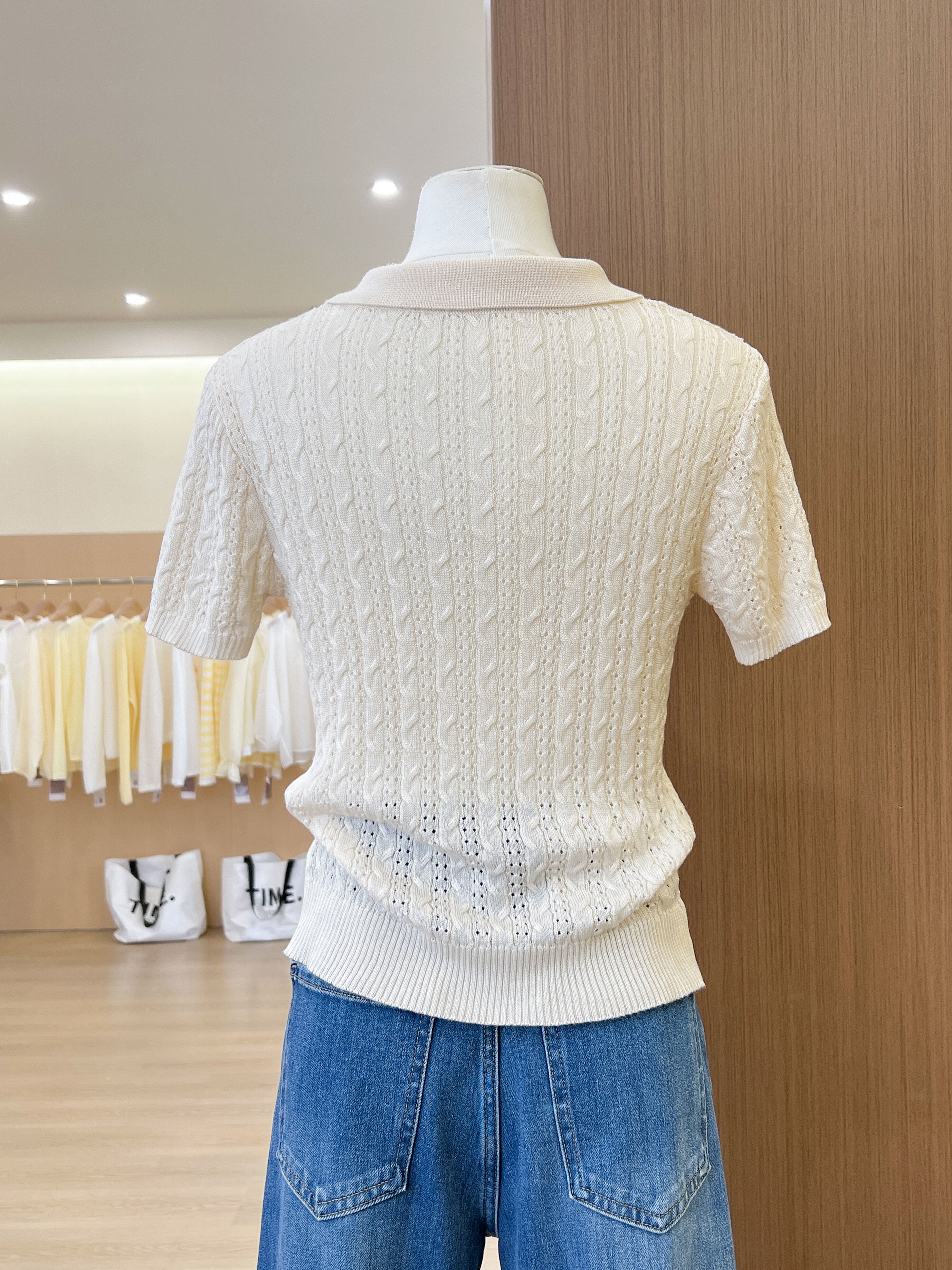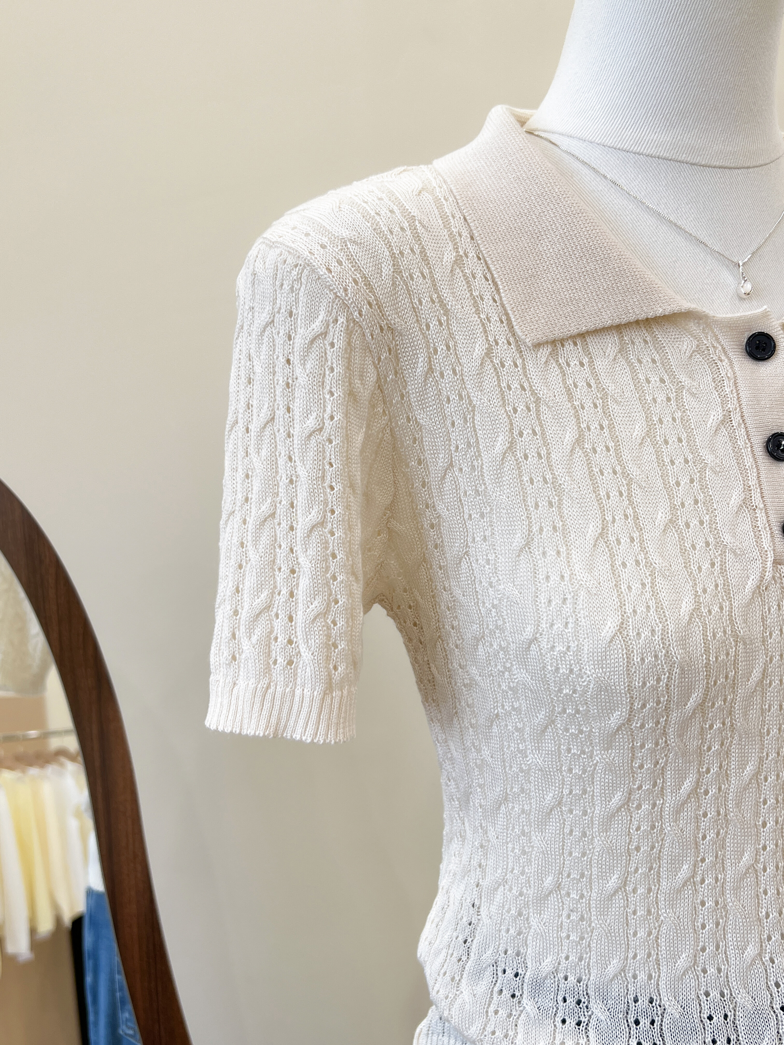 실사 마 무늬 폴로 칼라 반팔 니트 스웨터 여성 2026 봄 여름 새로운 반 개방 버클 몸매 가꾸기 슬림해 보이는 맨위