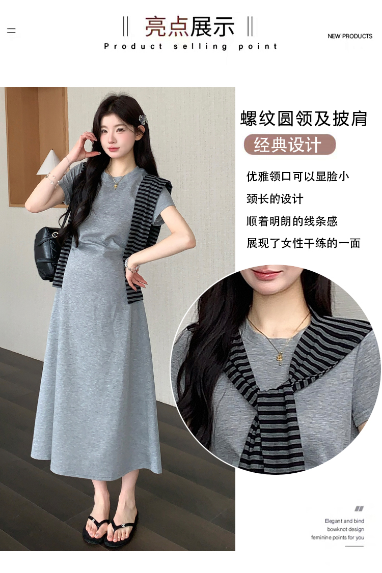 실사 지금 여름 신제품 디자인 센스 프랑스식 슬림해 보이는 한 마디 티셔츠 롱 스커트 스트라이프 숄
