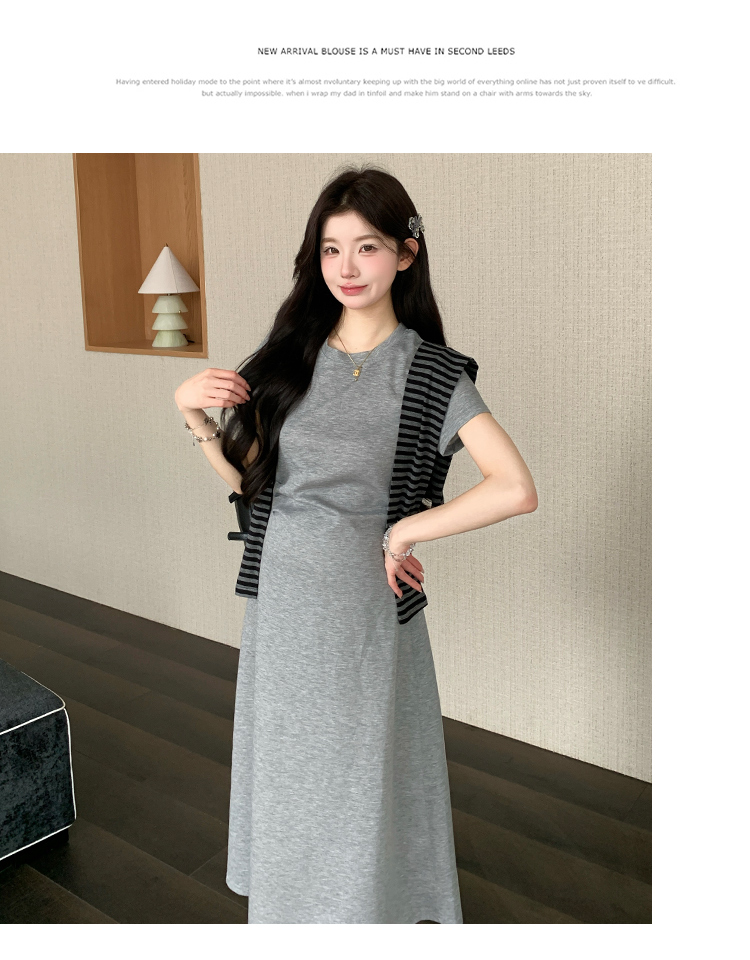 실사 지금 여름 신제품 스트라이프 V넥 중간 소매 매운맛 엄마 드레스