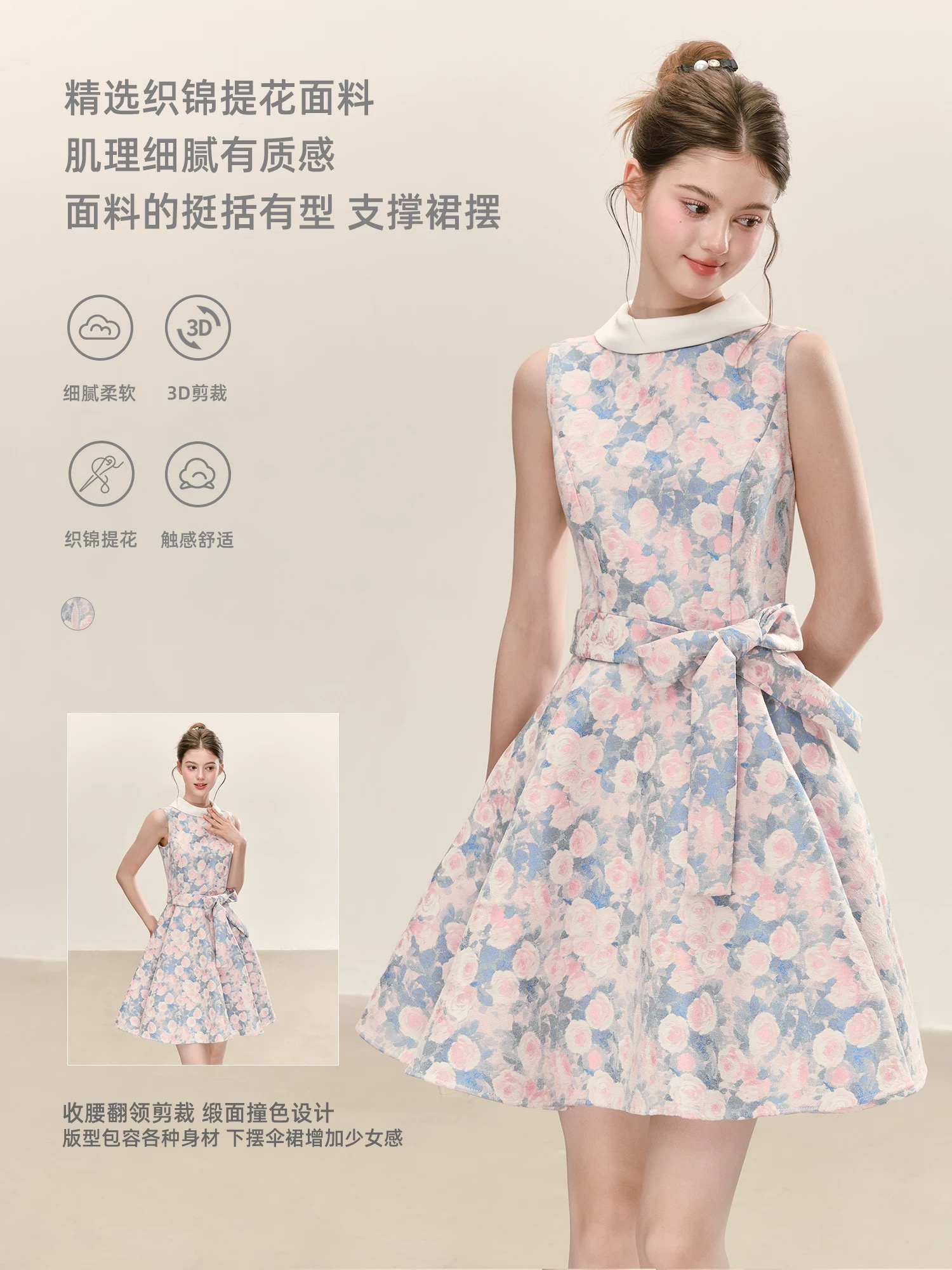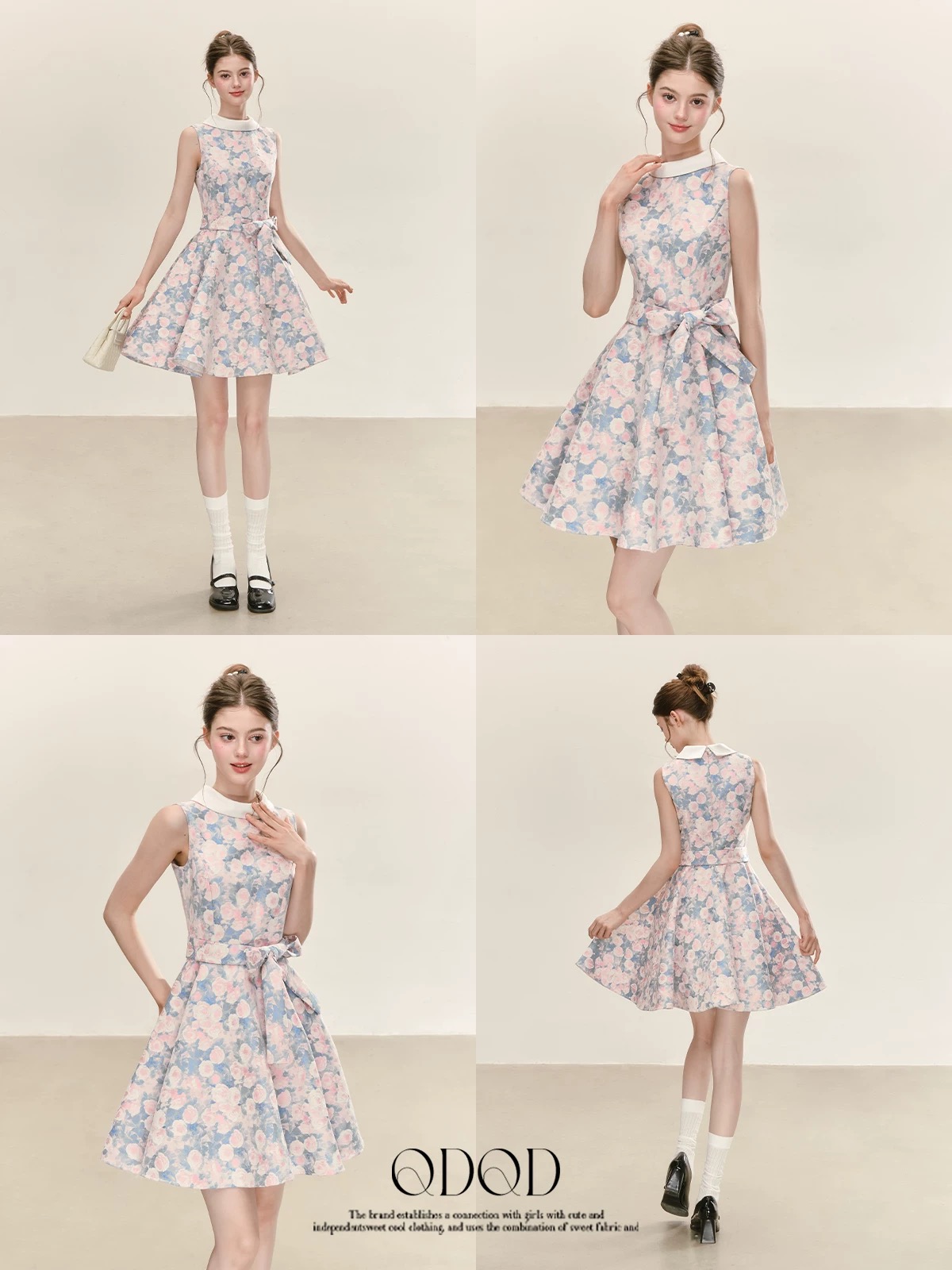 qdqd 천 금빛 바람 꽃무늬 드레스 봄 여름 레트로 우아함 민소매 허리 수축 레이스업 슬림해 보이는 품격 A라인 스커트 여성