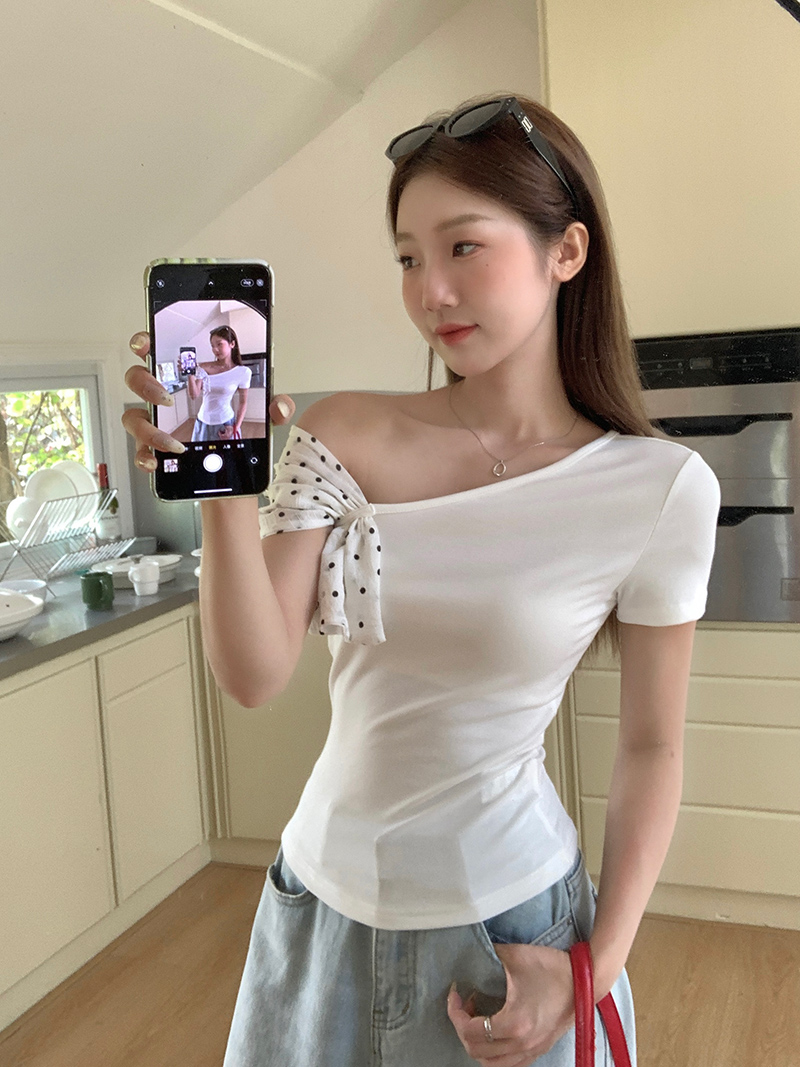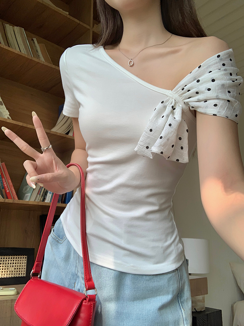 2026 새로운 반팔 티셔츠 여름 트렌디 도트 무늬 오프숄더 몸매 가꾸기 쇼트 스타일 비스듬한 칼라 여성 의류 맨위