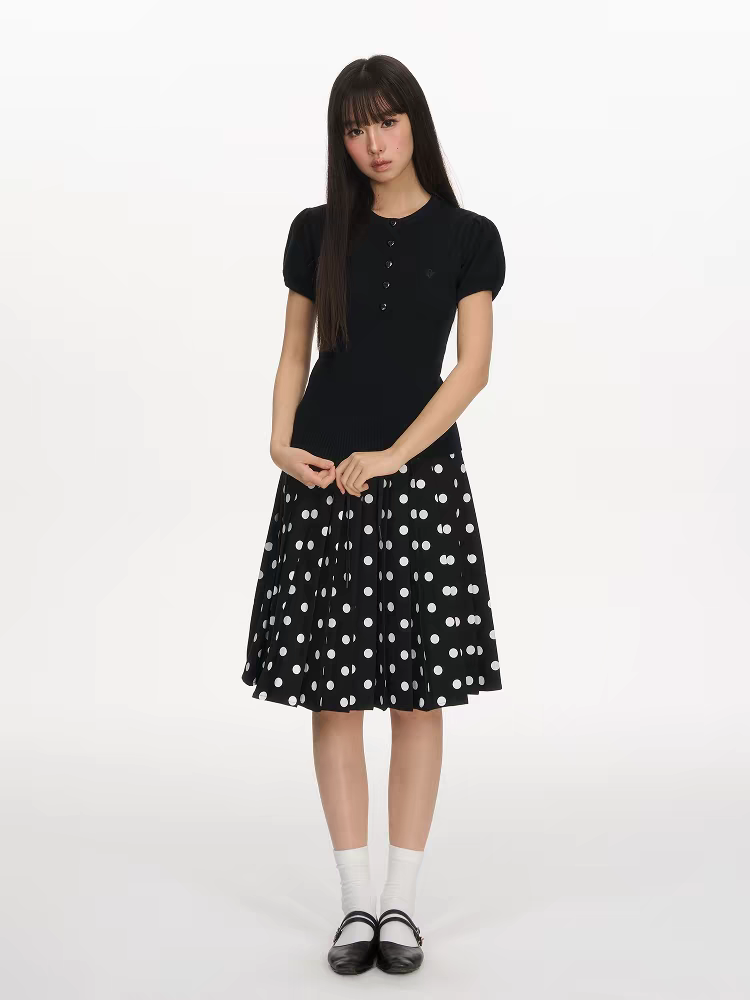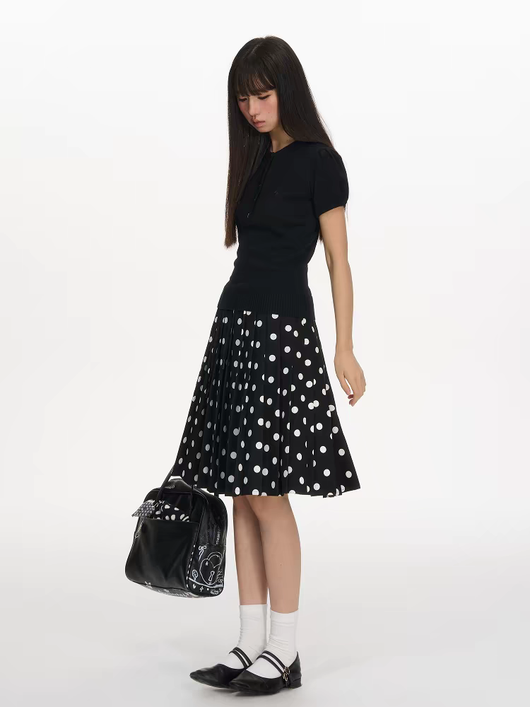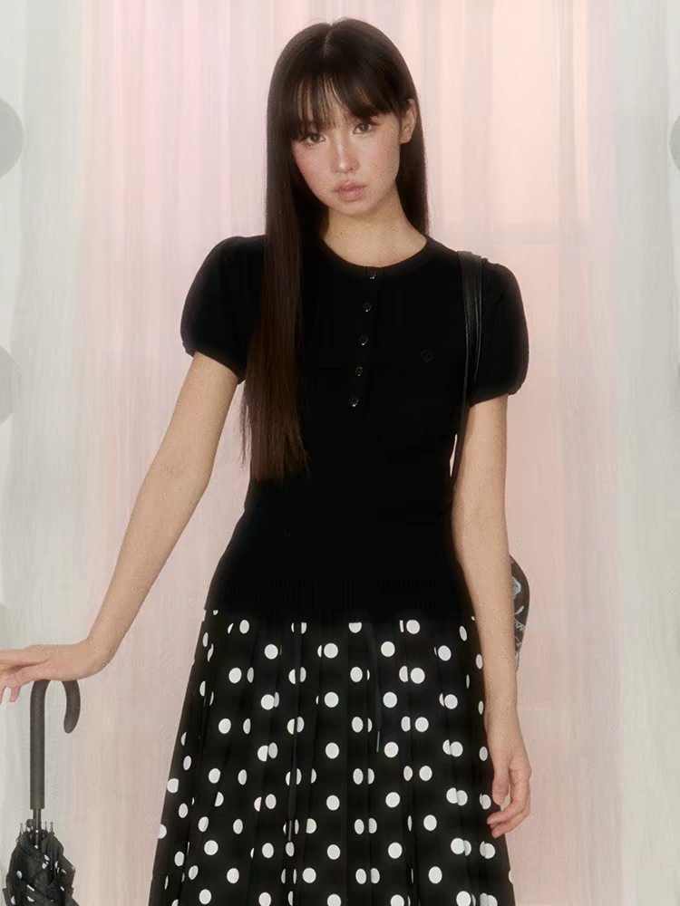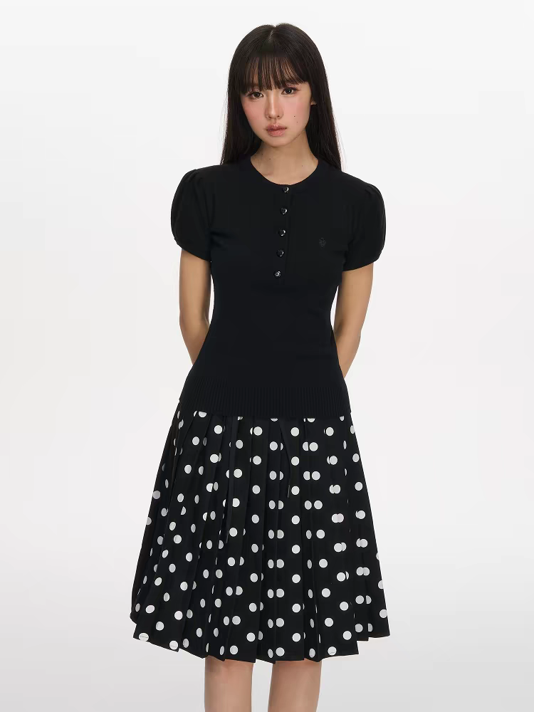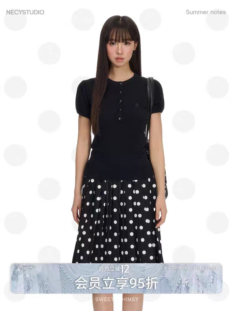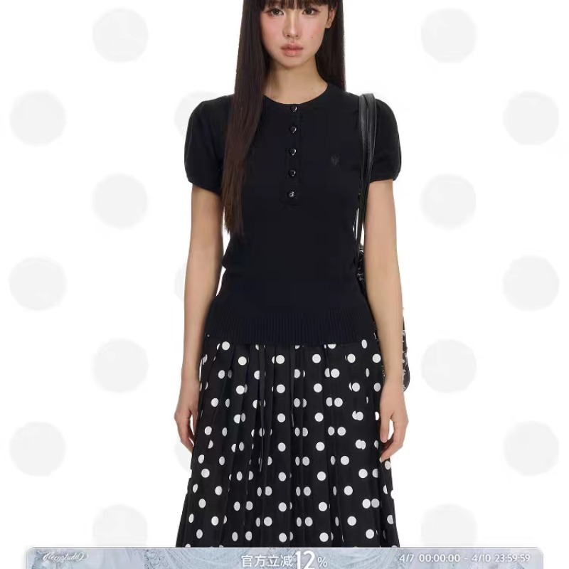 달콤한 차가운 학원 스타일 높음 폭탄 니트 패치워크 도트 무늬 반팔 여름 새로운 허리 수축 슬림해 보이는 검정색 티셔츠