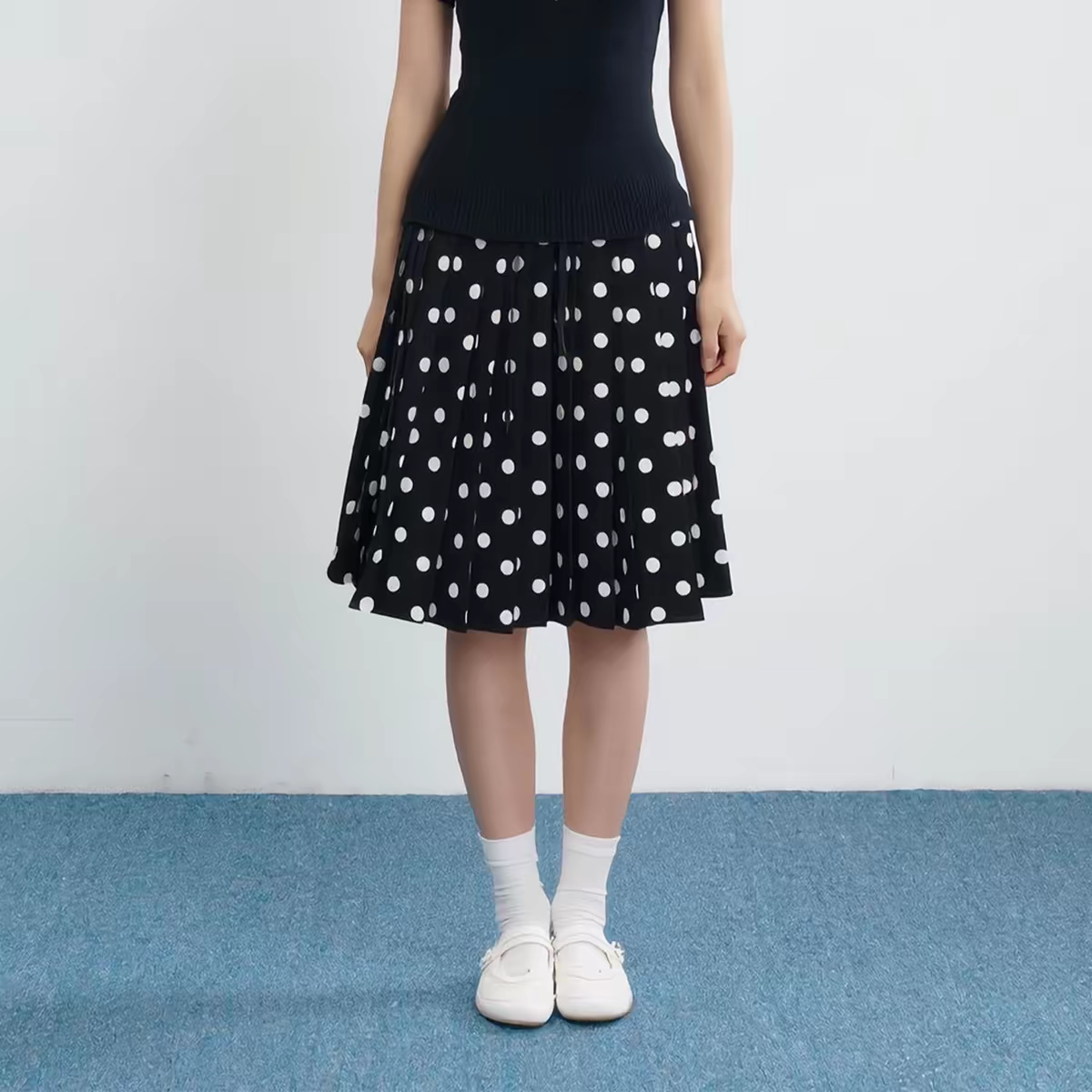 한 부서 디자인 센스 화이트 도트 무늬 드레스 여름 새로운 주름 디자인 센스 학원 스타일 소녀 치마