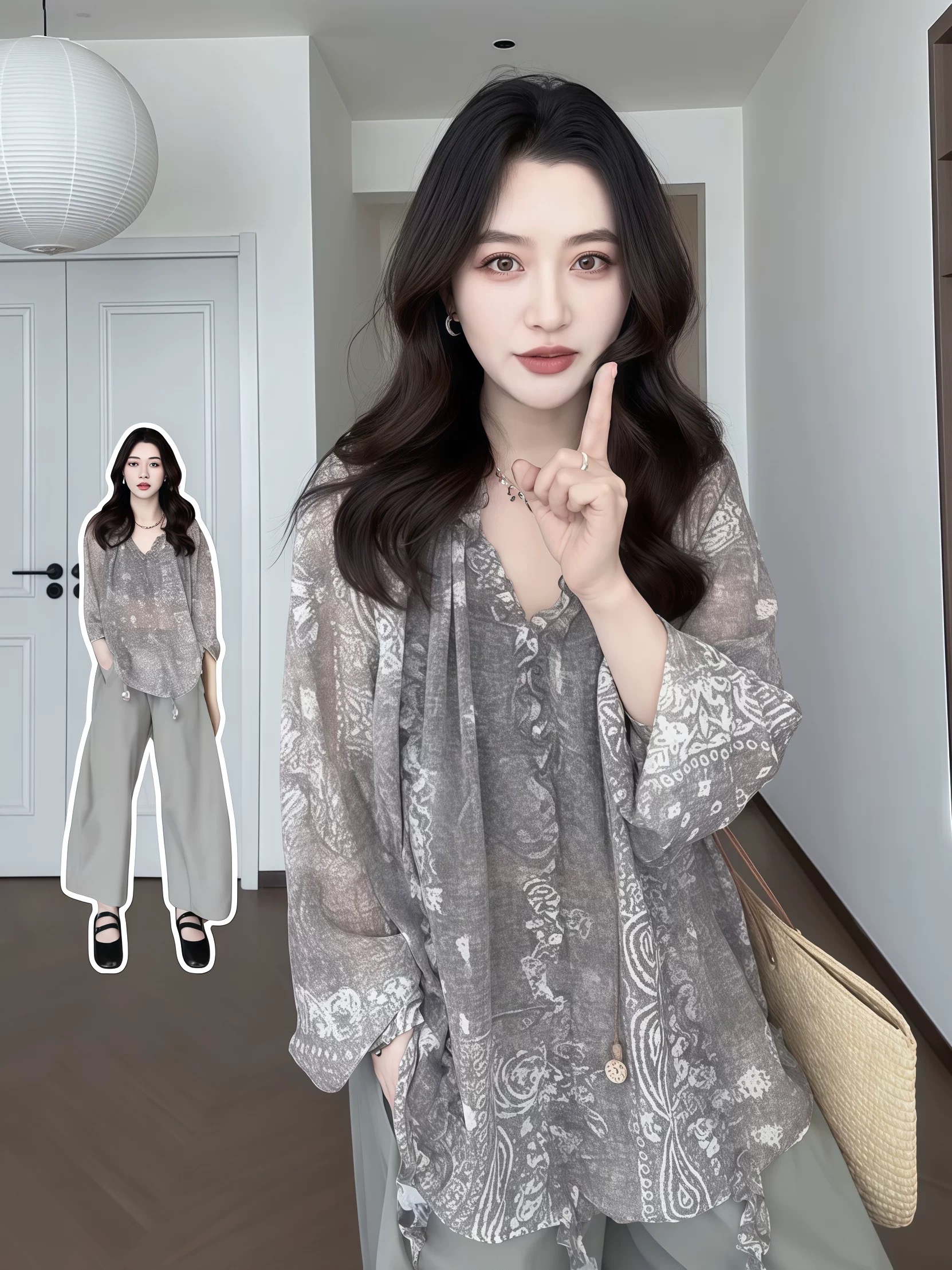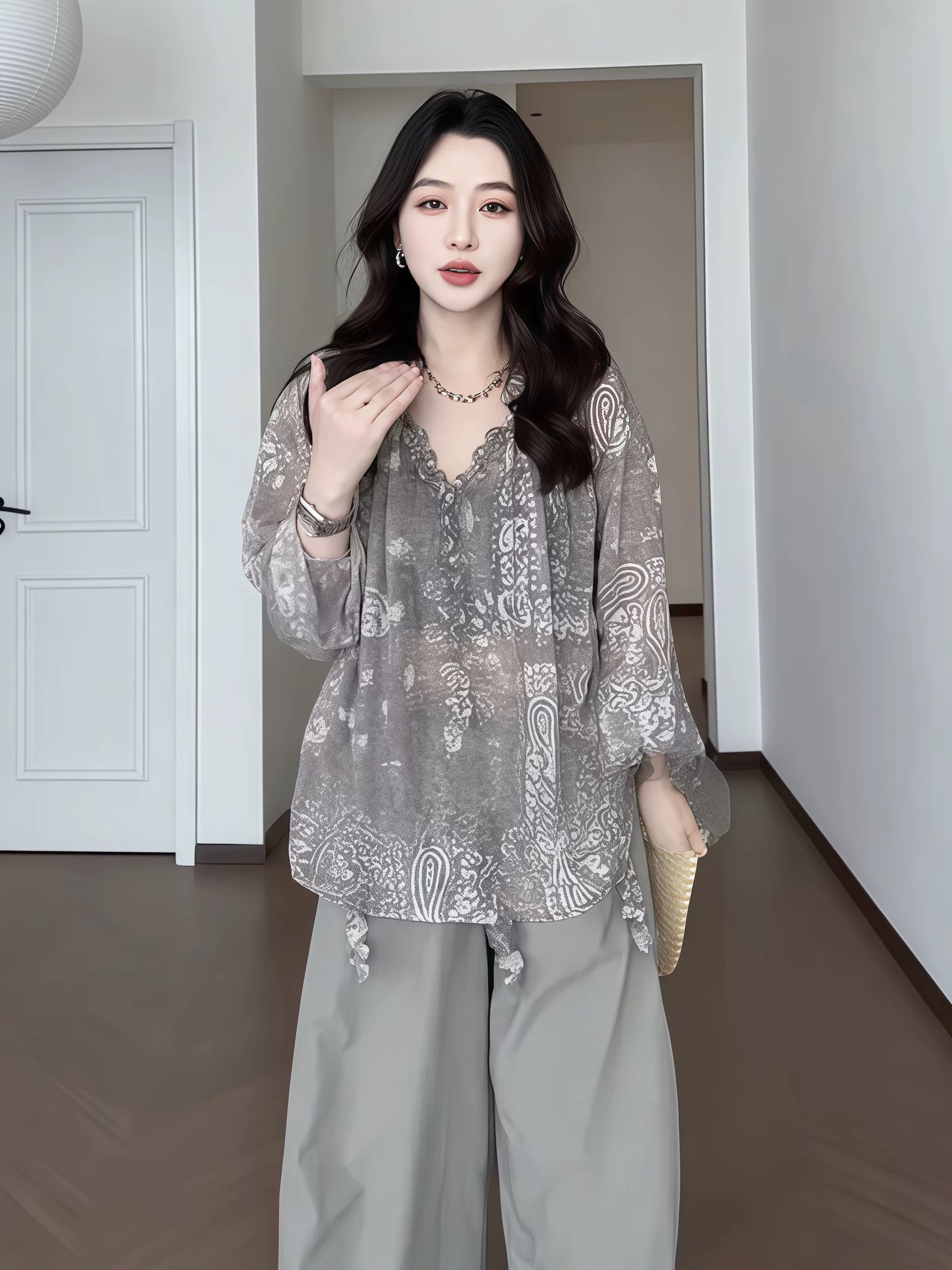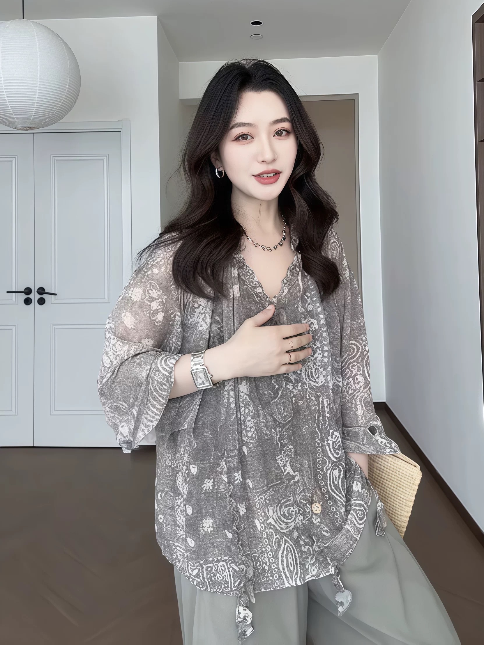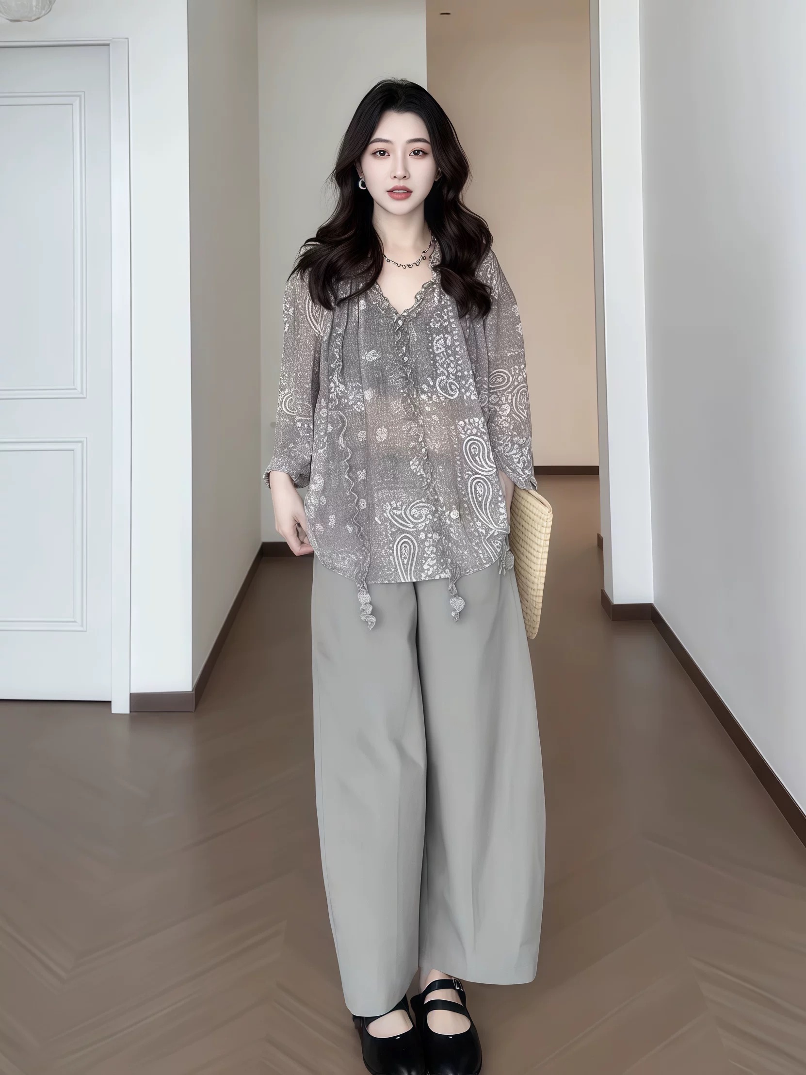 지방 지아 지아 도트 무늬 바지 쉬폰 캐주얼 바지 여름 얇은 스타일 루즈핏 표지 고기 긴 바지