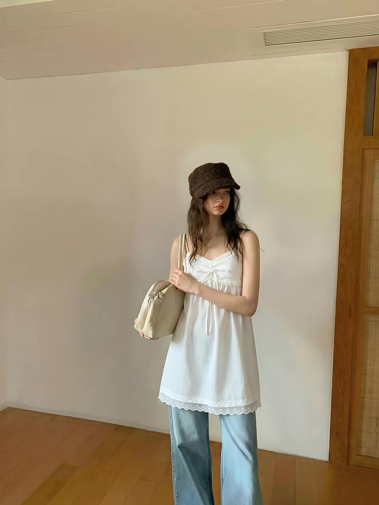 4muggle 단색 쇼트 스타일 V넥 주름 슬립 작은 조끼 여성 여름 아메리칸 레트로 핫걸 몸매 가꾸기 맨위