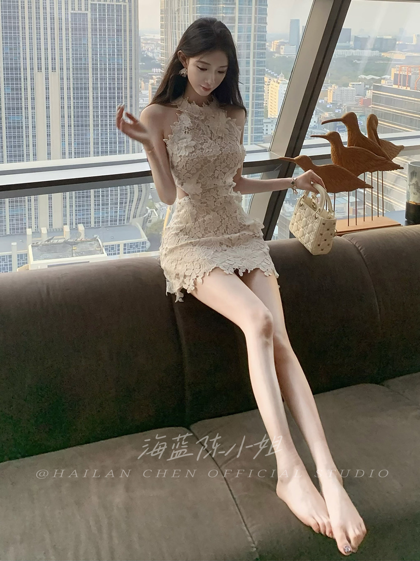 바이위란 프랑스식 빛 럭셔리 레이스 여성 드레스 홀로우 아웃 몸매 가꾸기 타이트 스커트 품격 행침 목 한 마디 미니 스커트